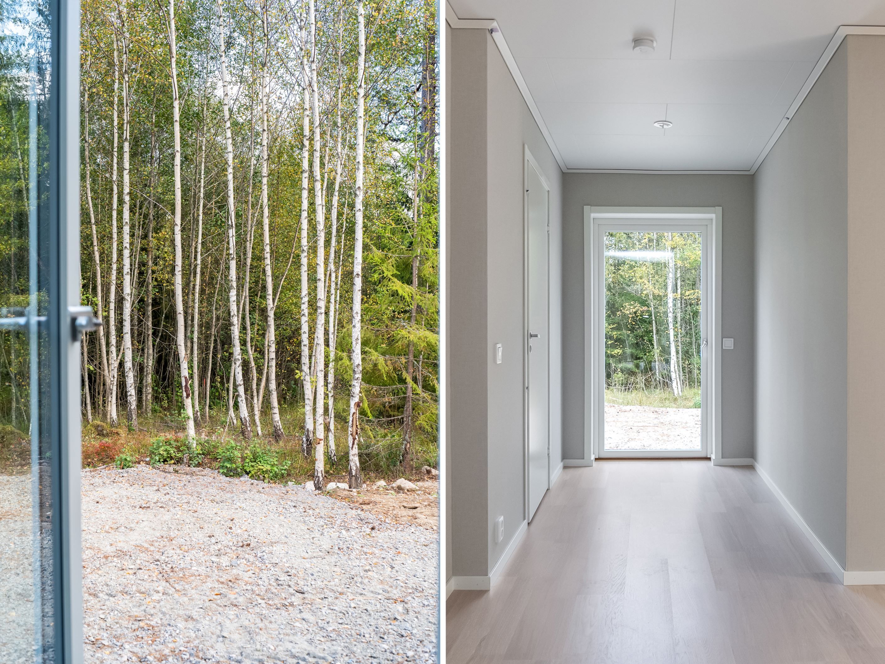 Strax utanför badrummet finns en helglasad dörr som leder ut till trädgårdstomten.