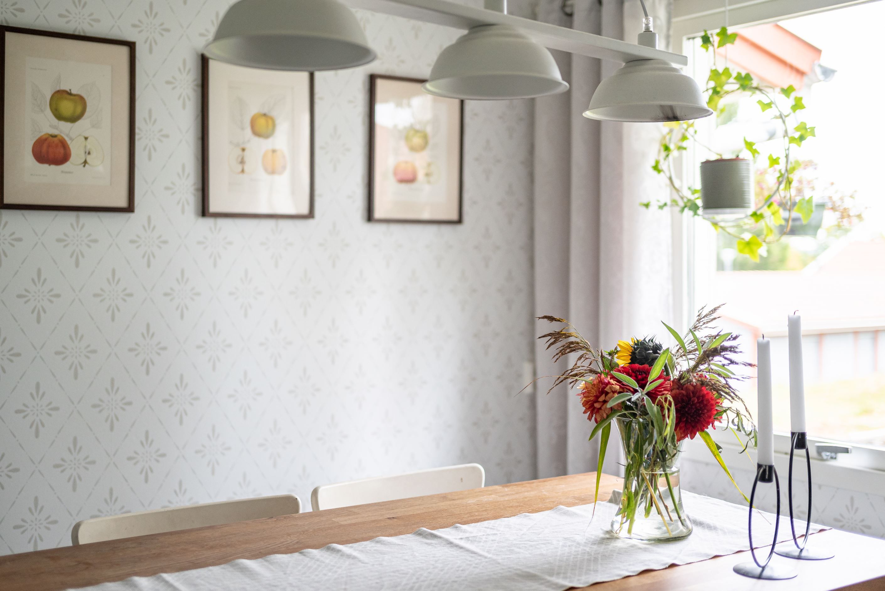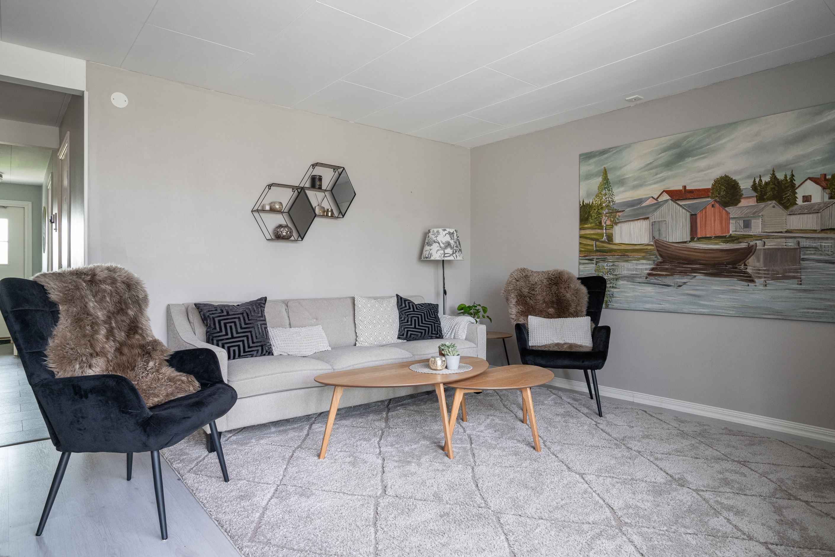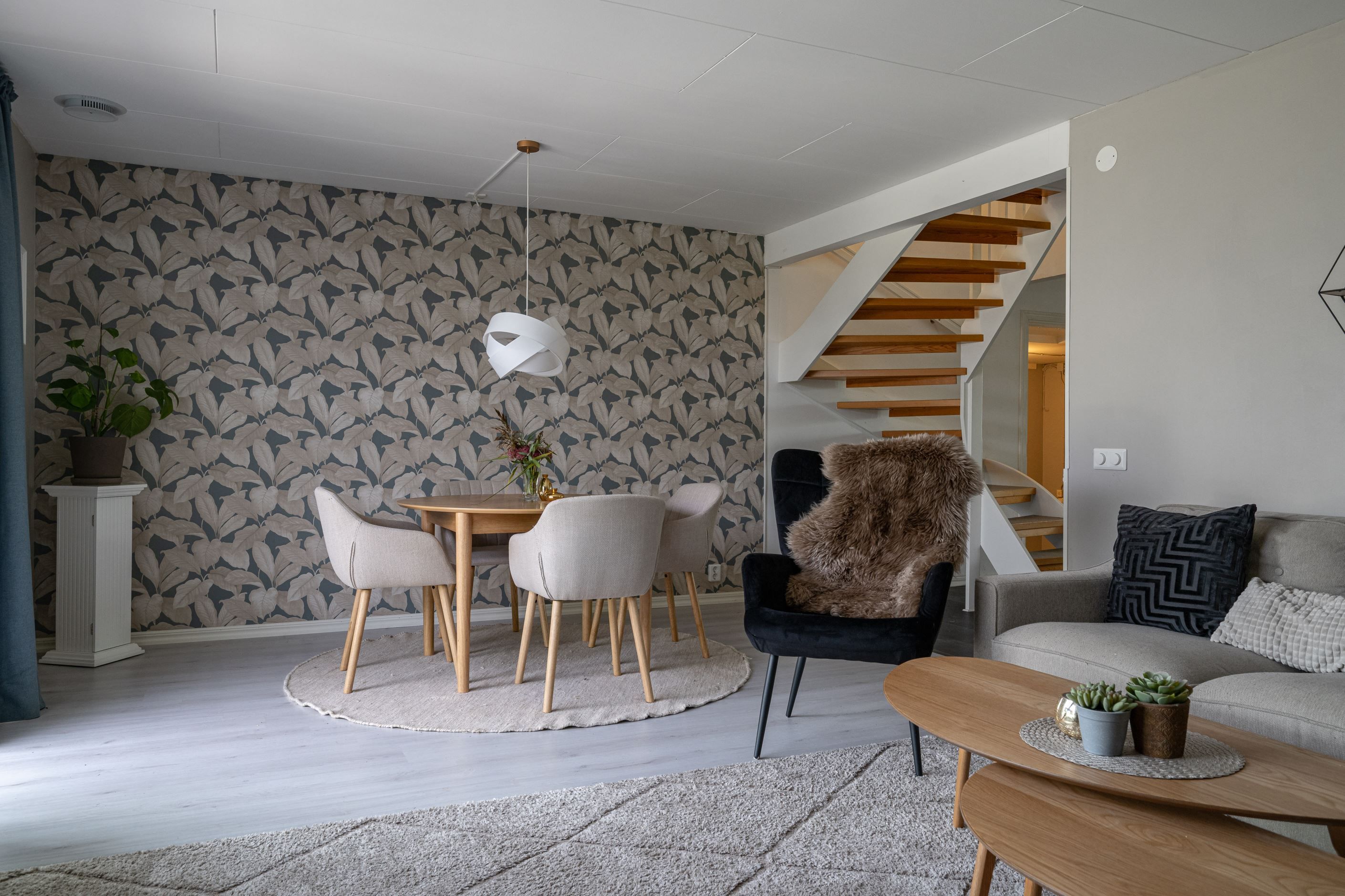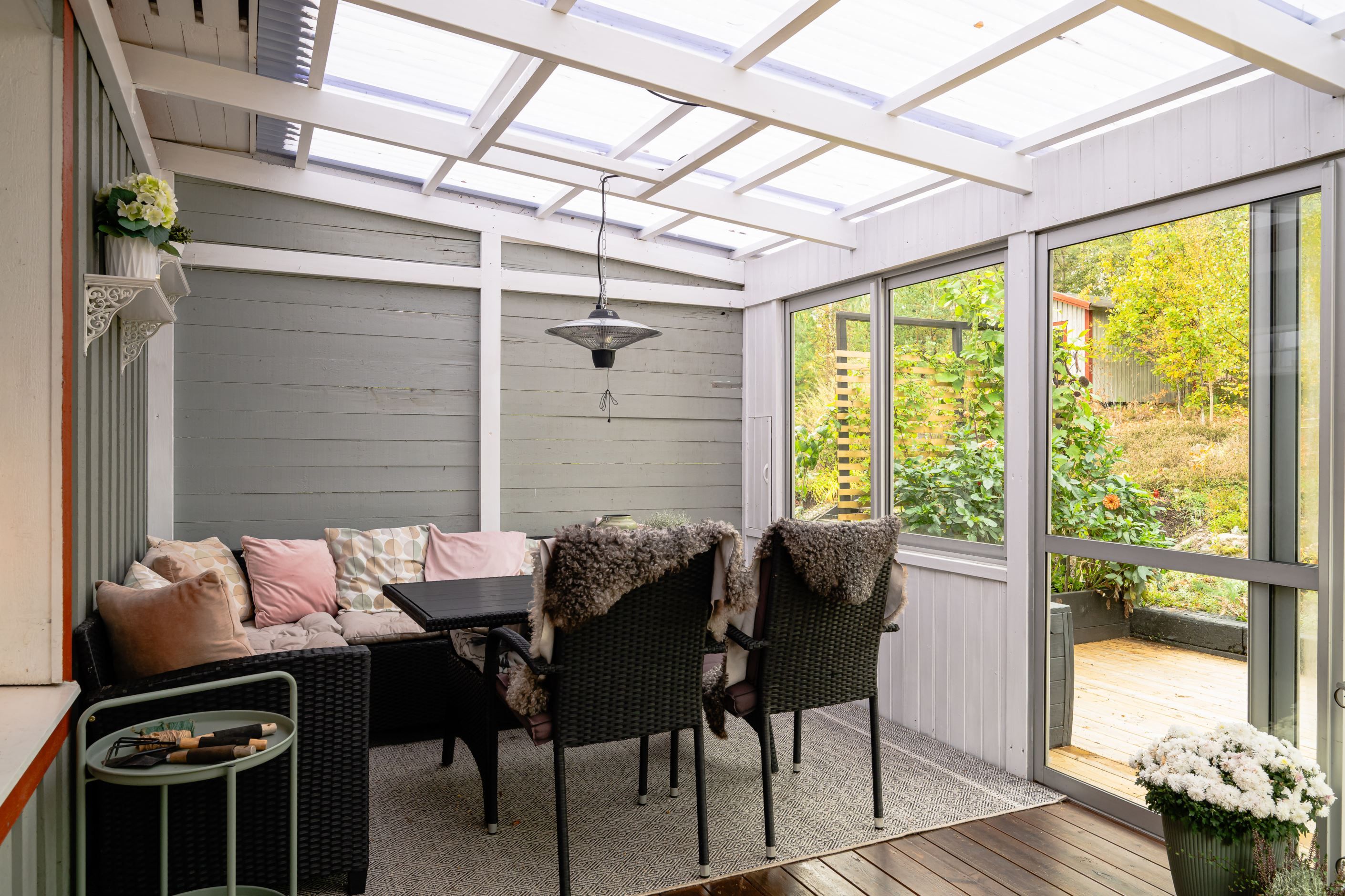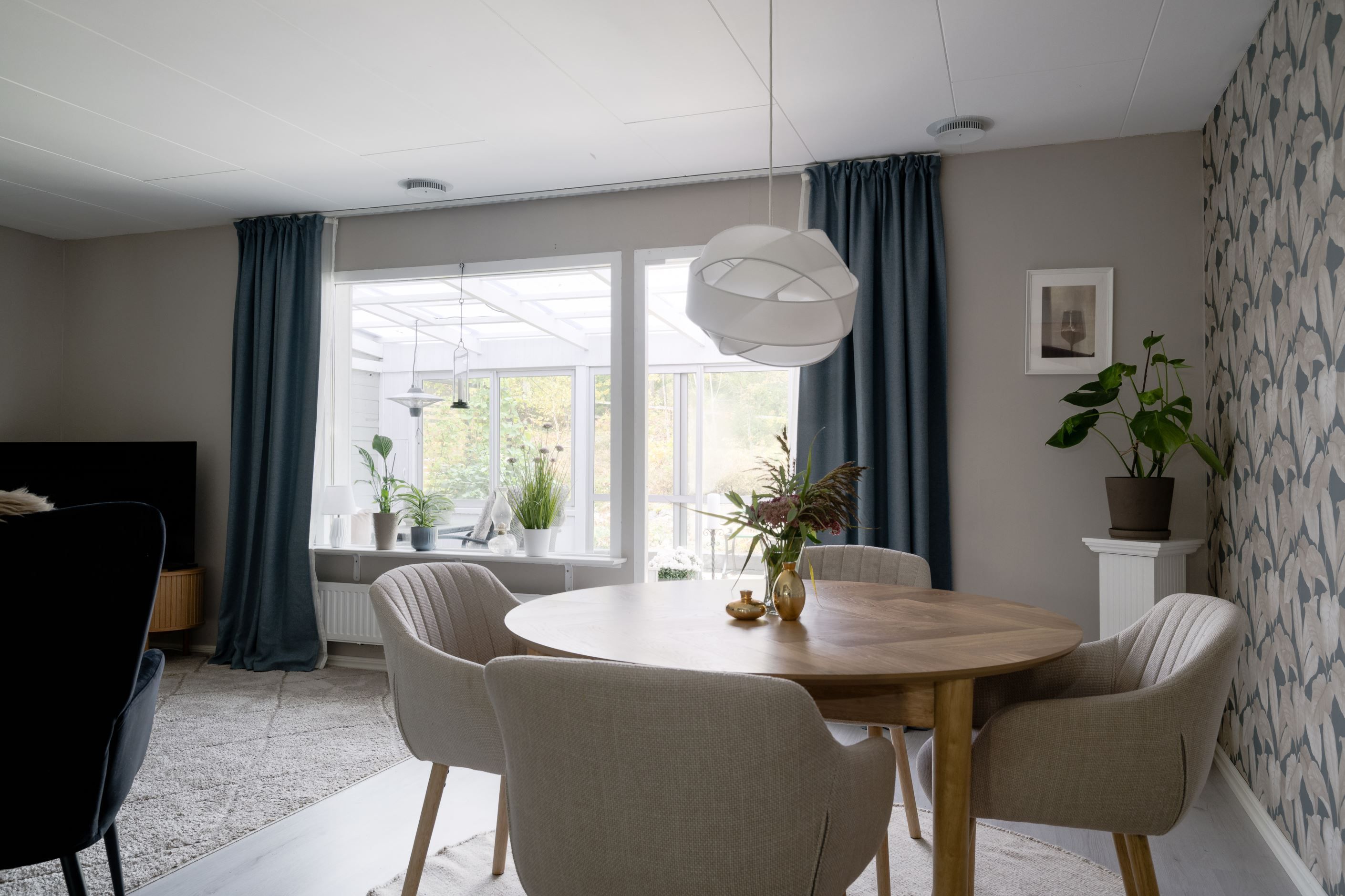 Rymligt vardagsrum med plats för både soffgrupp och matplats, härifrån nås bostadens trevliga uterum.