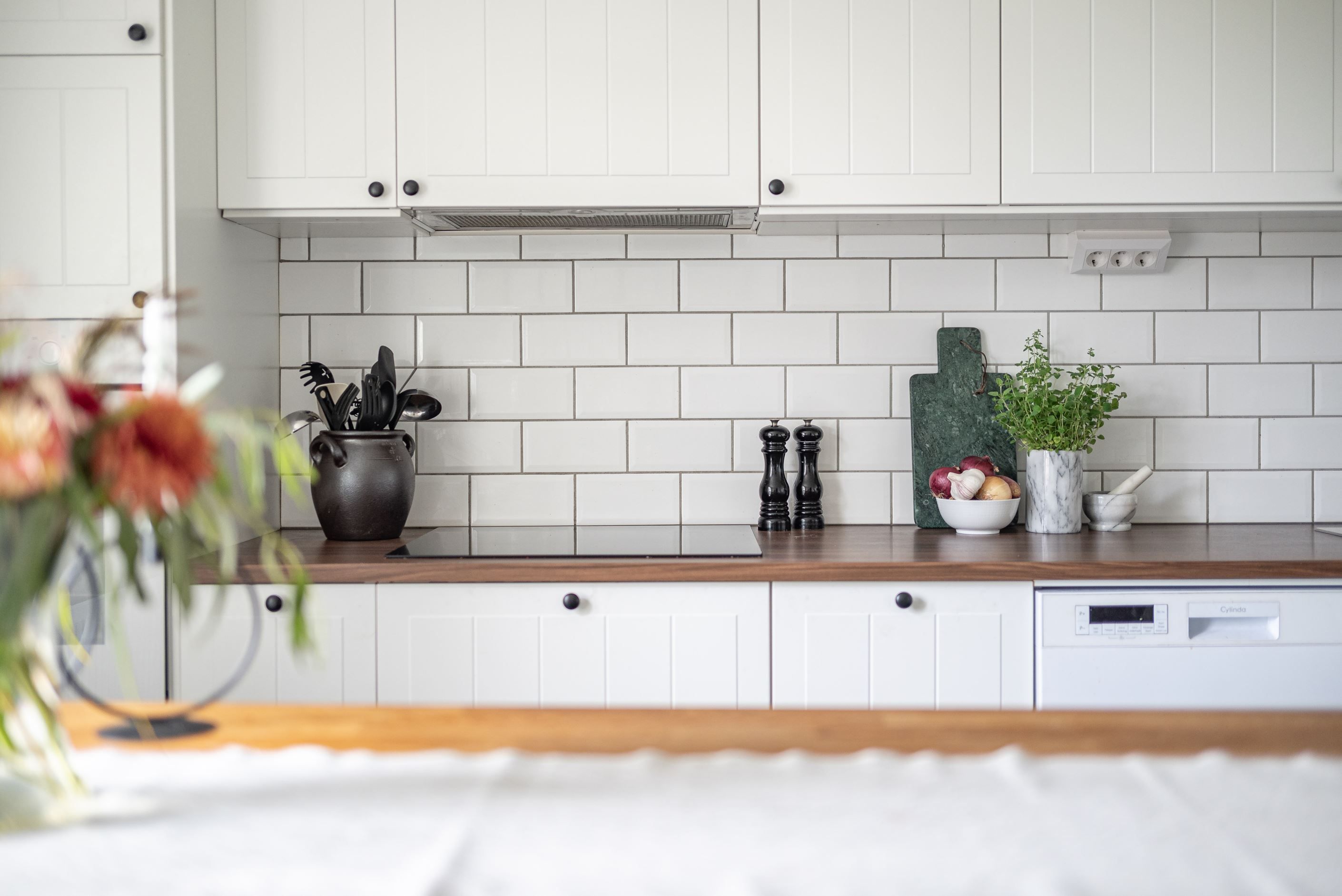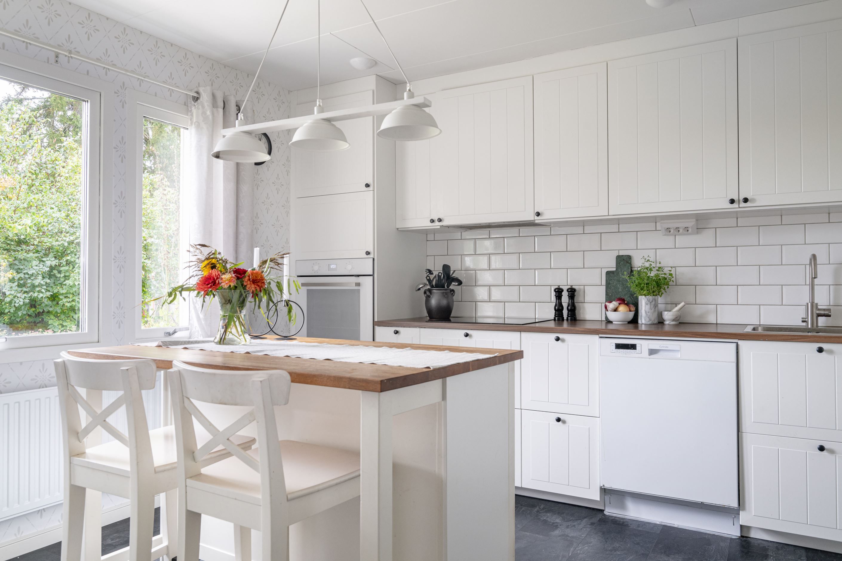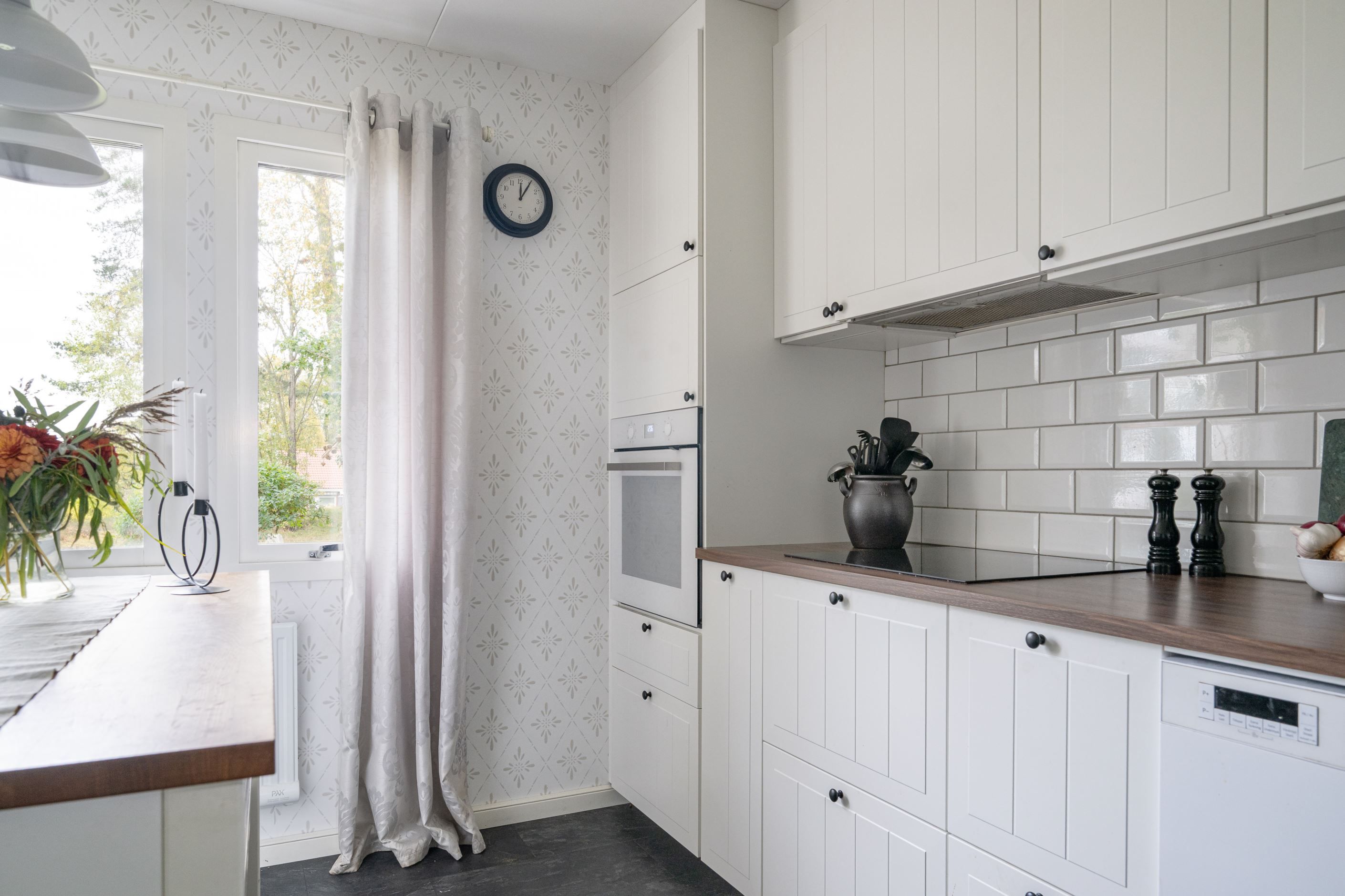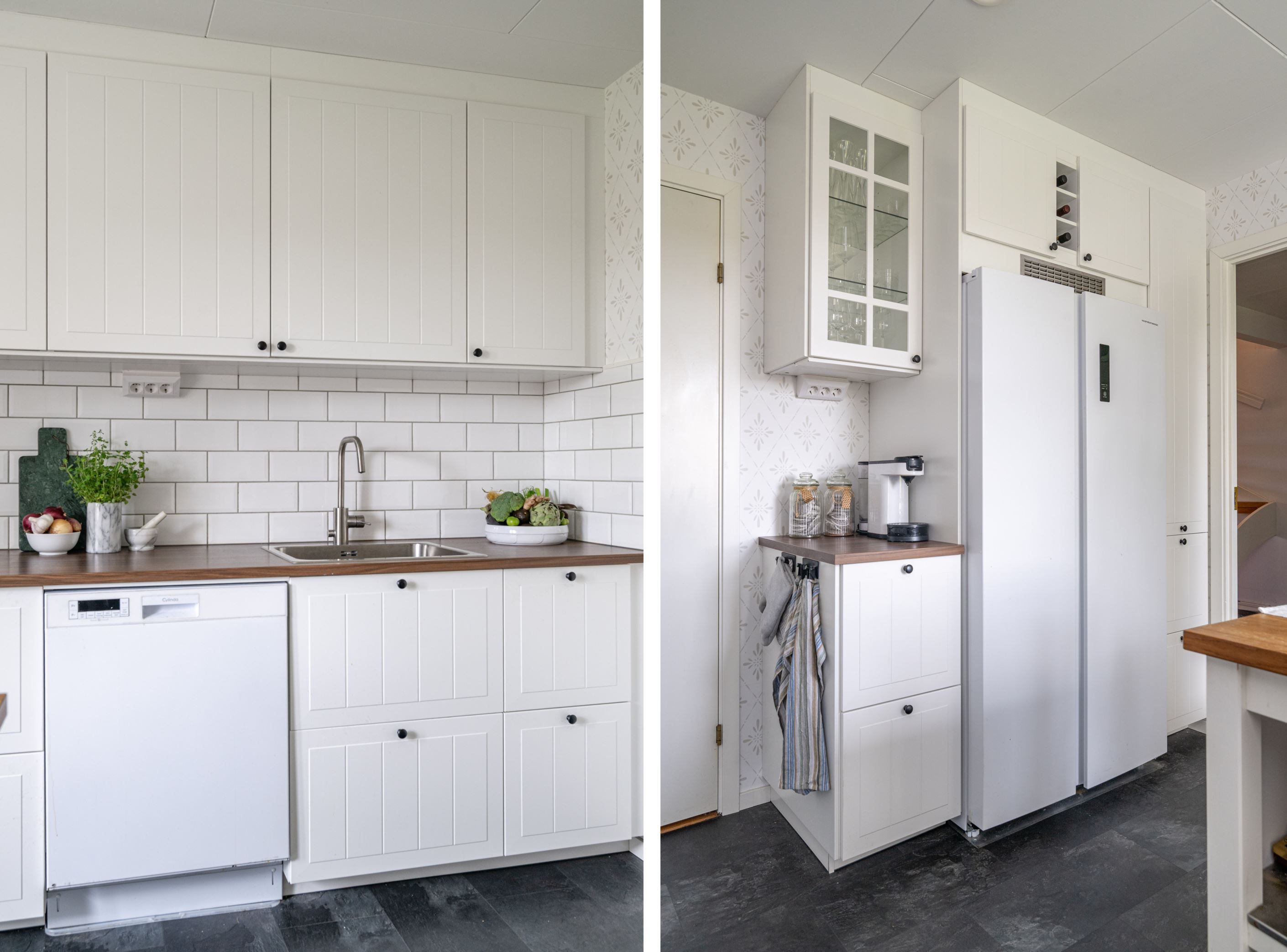 Kök med vita köksluckor, ugn, spis, fläkt, kyl och frys. Med plats för antingen köksö eller köksbord.