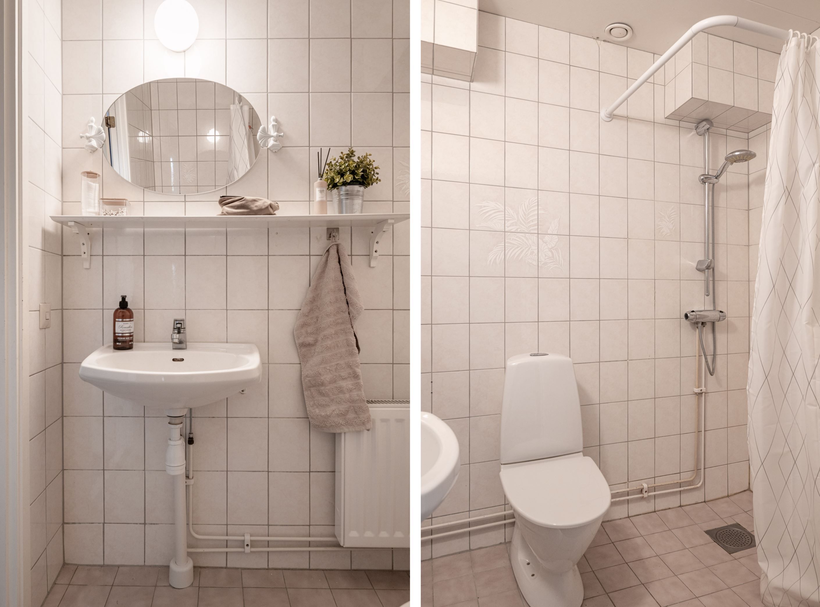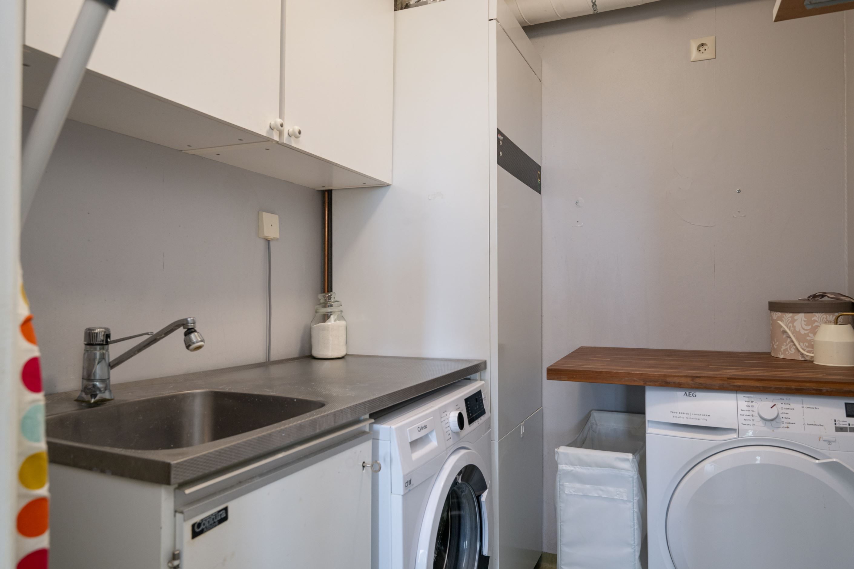 Tvättstuga med tvättmaskin, frånluftsvärmepump och tvättho.