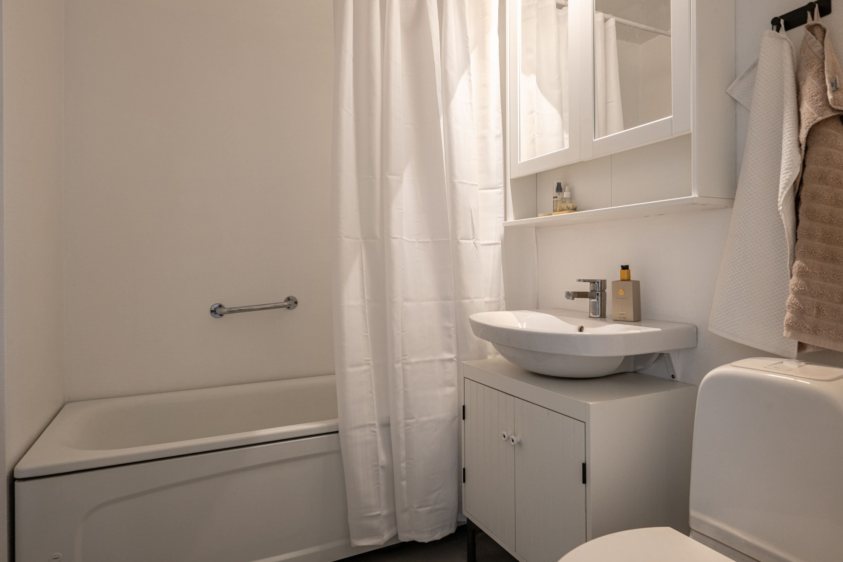 Badrum med våtrumsmatta, badkar, handfat med kommod och wc.