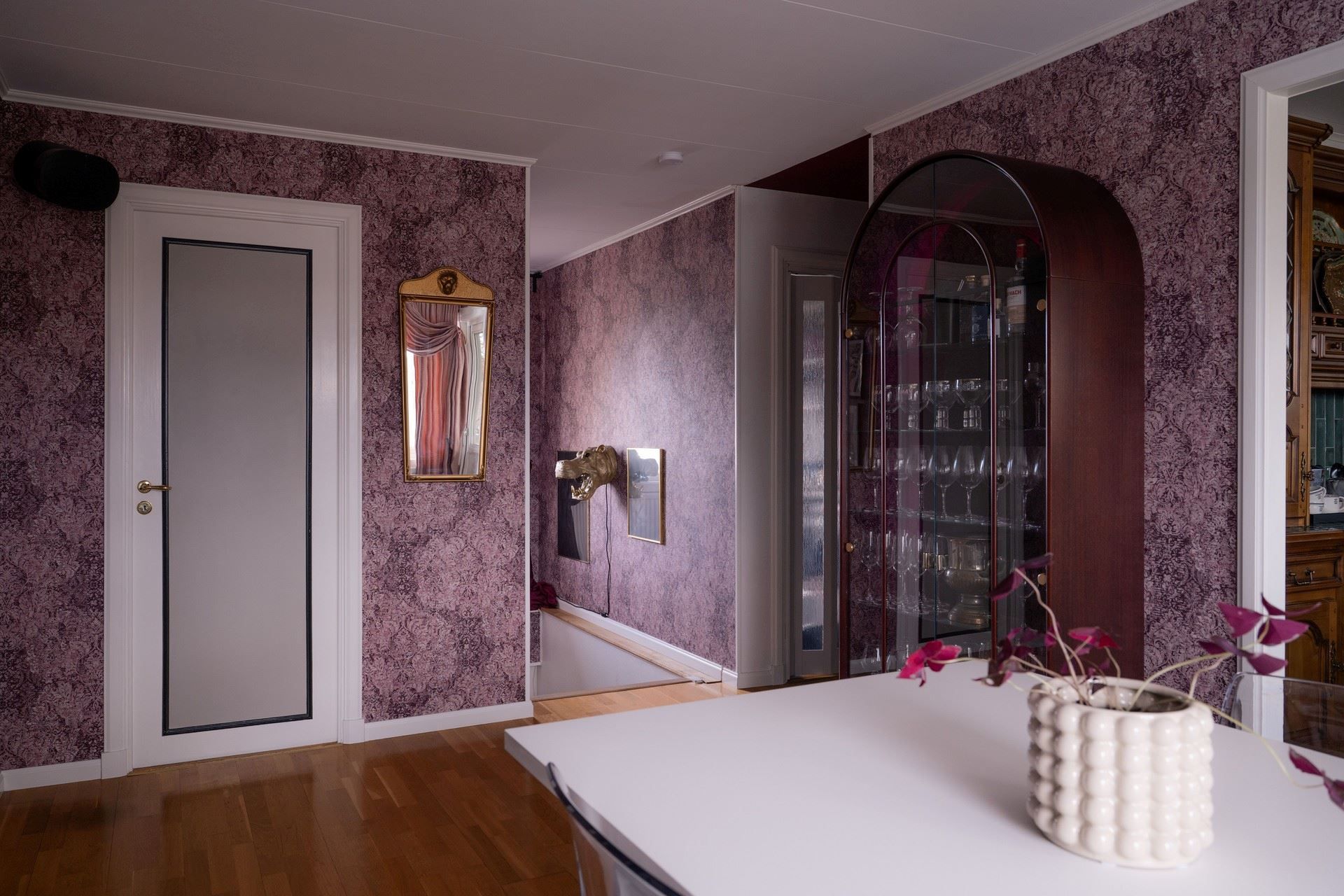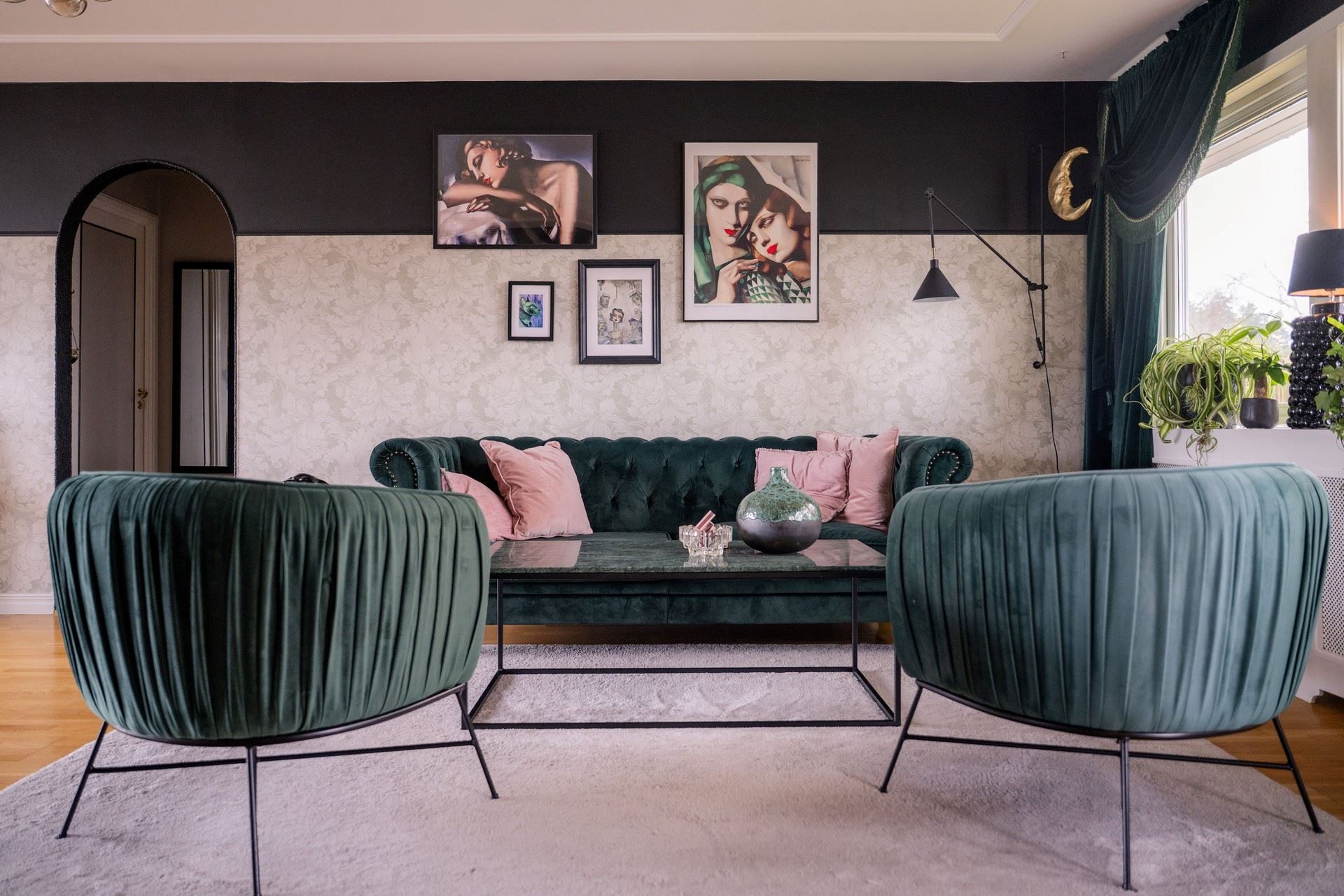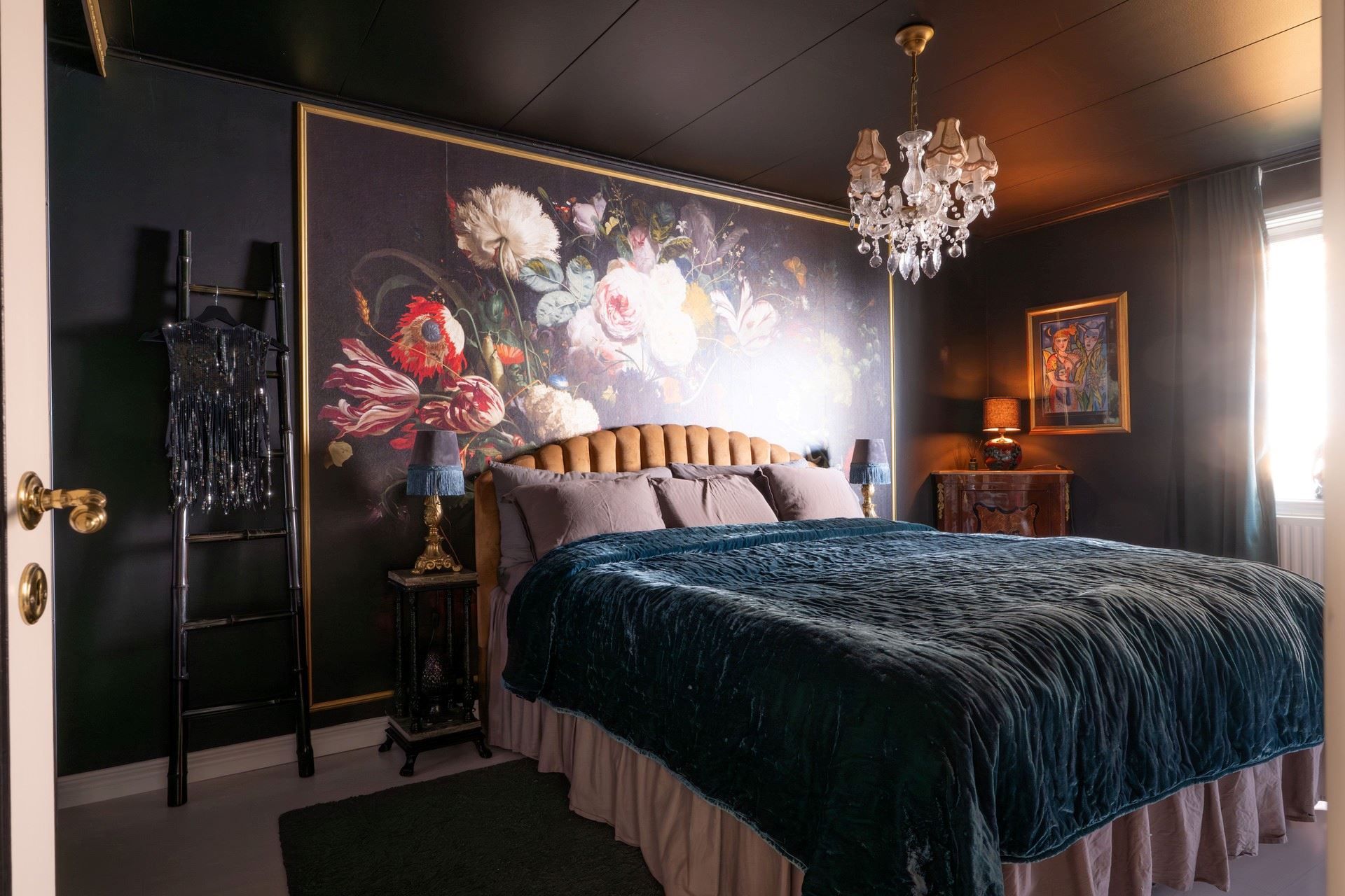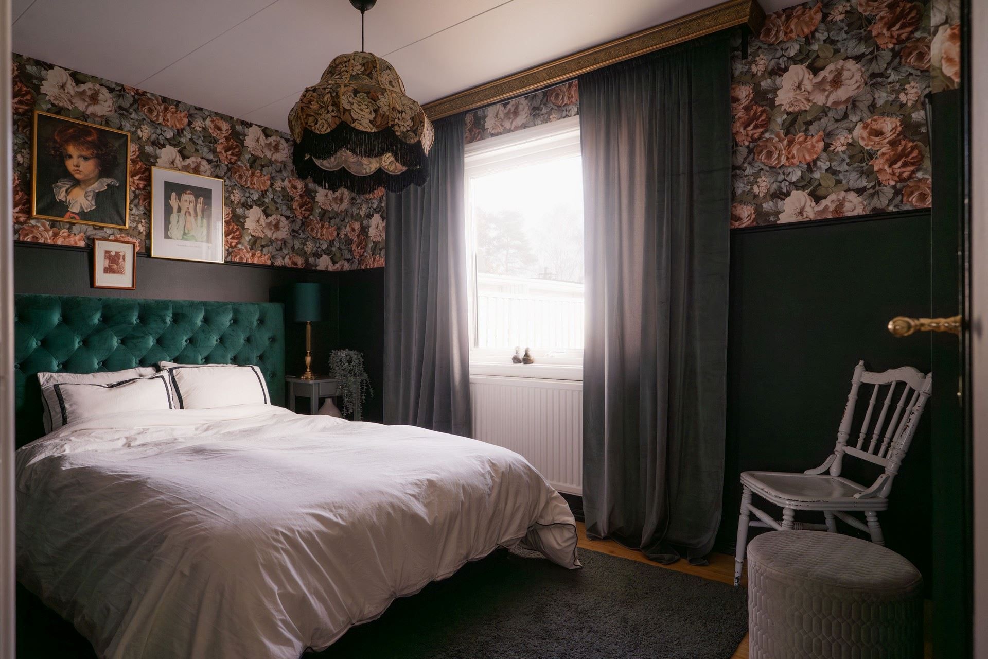 Inne i huset möts du av en inredning som andas personlighet och värme. De romantiskt inredda rummen pryds av vackra, mönstrade tapeter – som ger huset en unik och inbjudande prägel. Här samsas tunga sammetsgardiner med antika detaljer, träslag med patina och noggrant utvalda färger som ger varje rum karaktär. Det rustika möter det sensuella – en perfekt balans mellan det jordnära och det drömska.