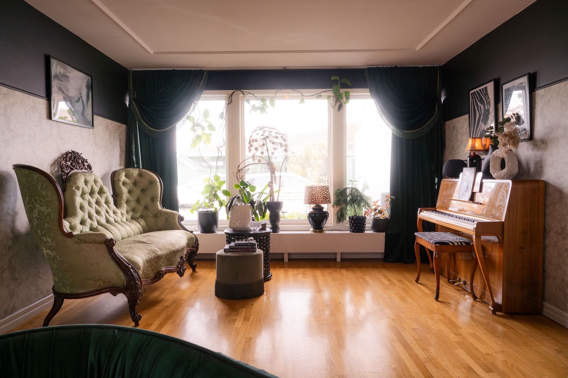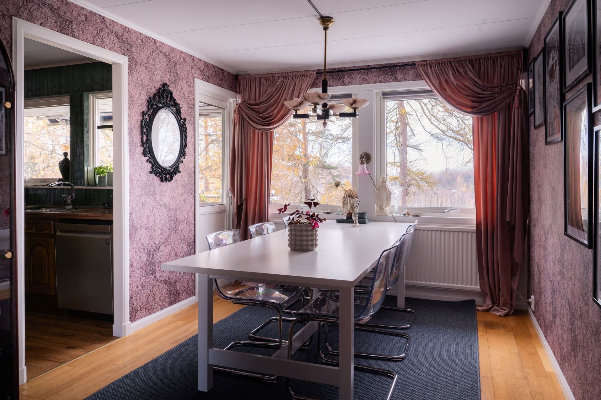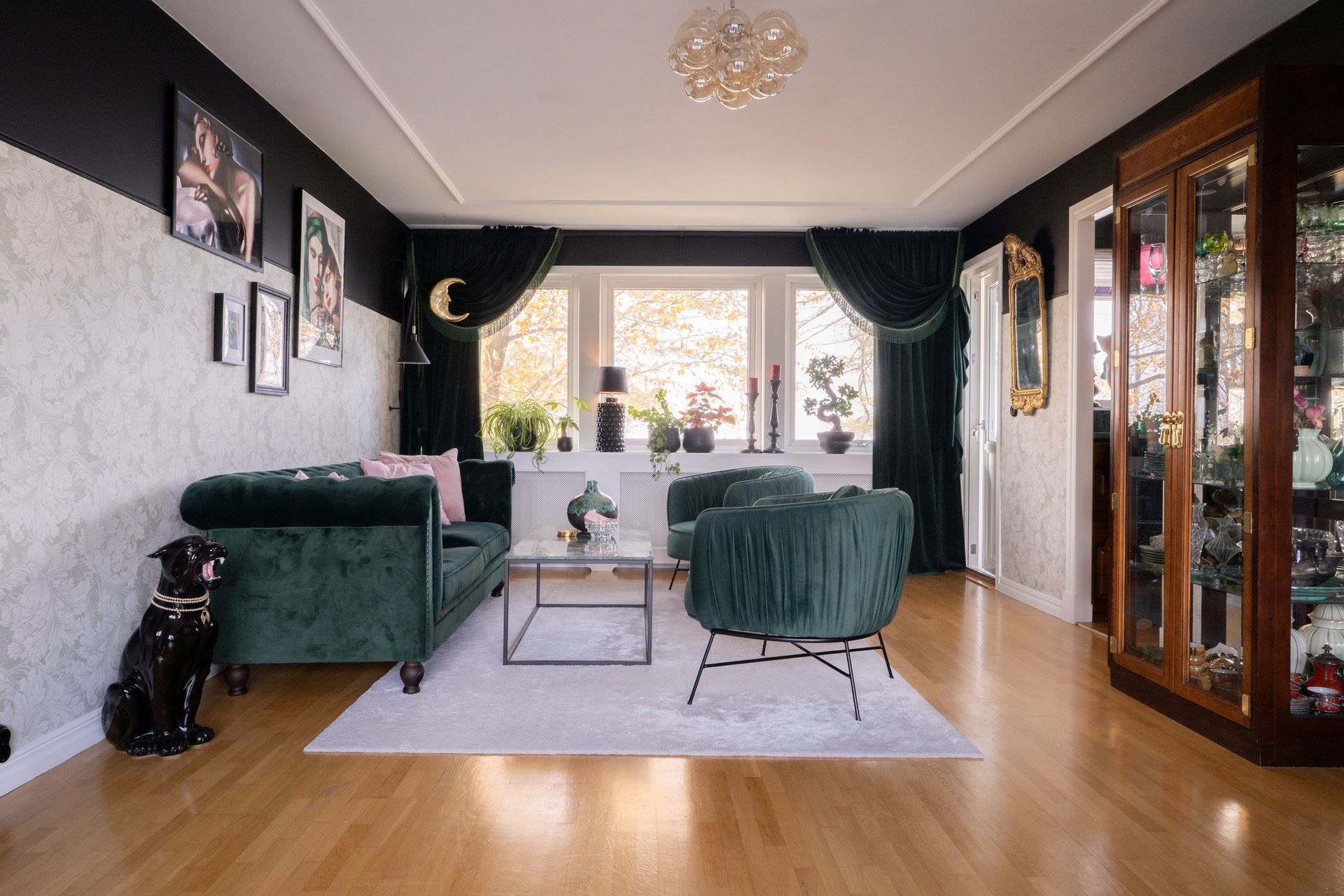 Inne i huset möts du av en inredning som andas personlighet och värme. De romantiskt inredda rummen pryds av vackra, mönstrade tapeter – som ger huset en unik och inbjudande prägel. Här samsas tunga sammetsgardiner med antika detaljer, träslag med patina och noggrant utvalda färger som ger varje rum karaktär. Det rustika möter det sensuella – en perfekt balans mellan det jordnära och det drömska.
