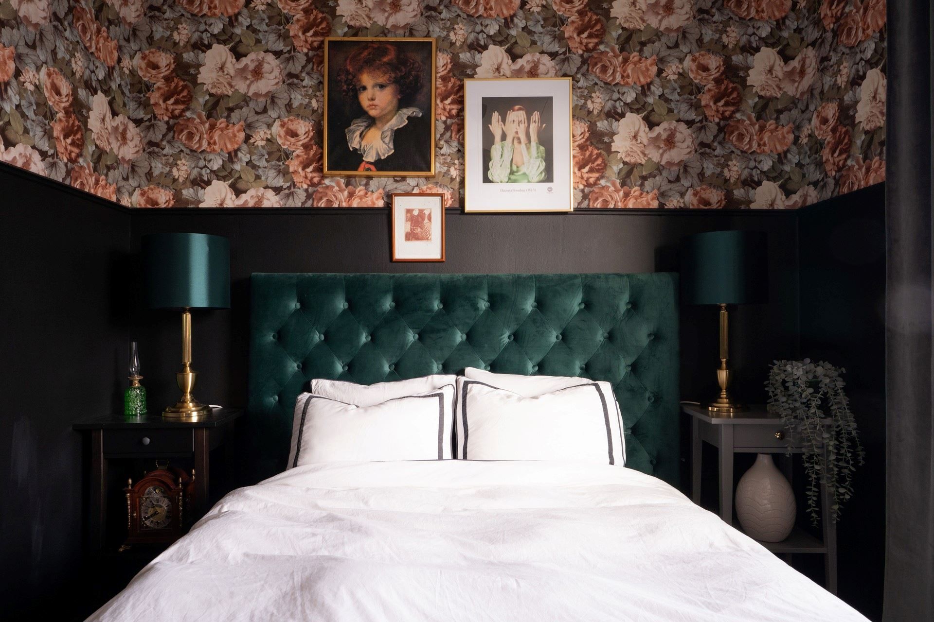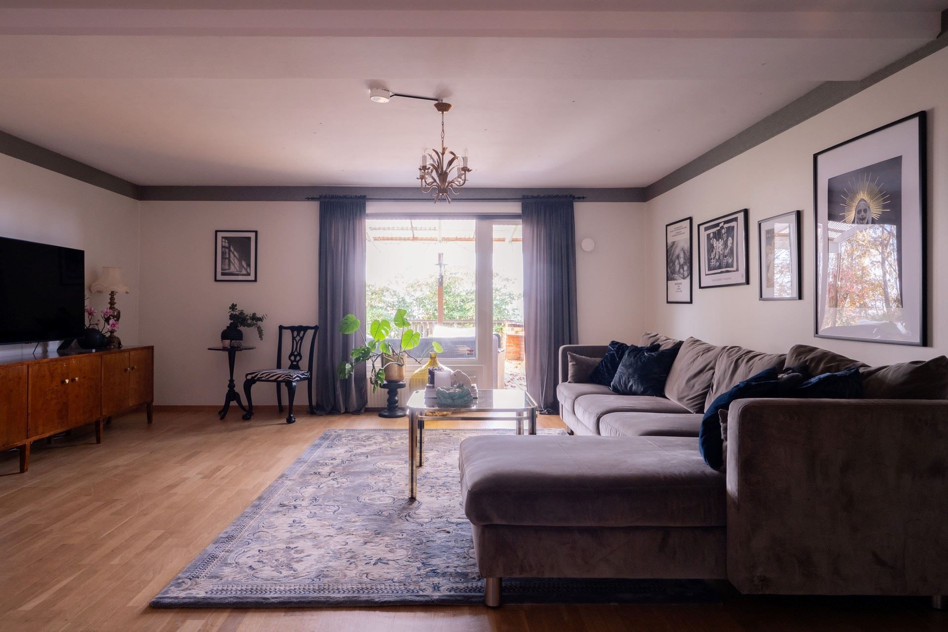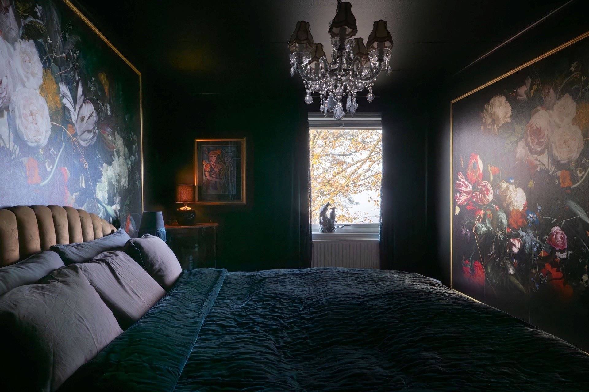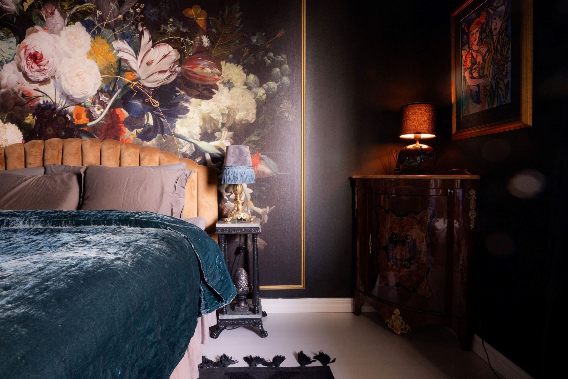 Inne i huset möts du av en inredning som andas personlighet och värme. De romantiskt inredda rummen pryds av vackra, mönstrade tapeter – som ger huset en unik och inbjudande prägel. Här samsas tunga sammetsgardiner med antika detaljer, träslag med patina och noggrant utvalda färger som ger varje rum karaktär. Det rustika möter det sensuella – en perfekt balans mellan det jordnära och det drömska.