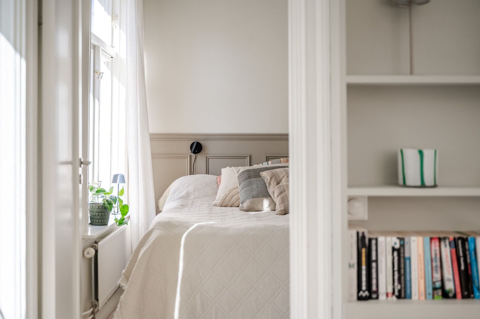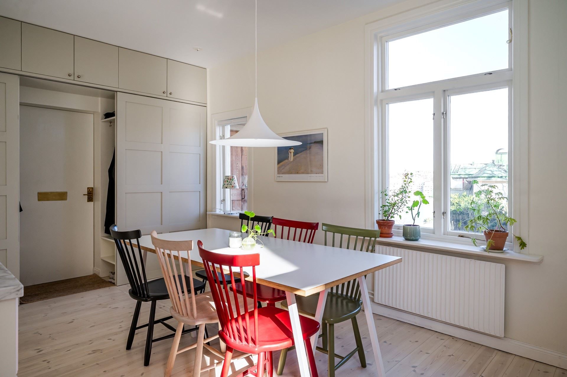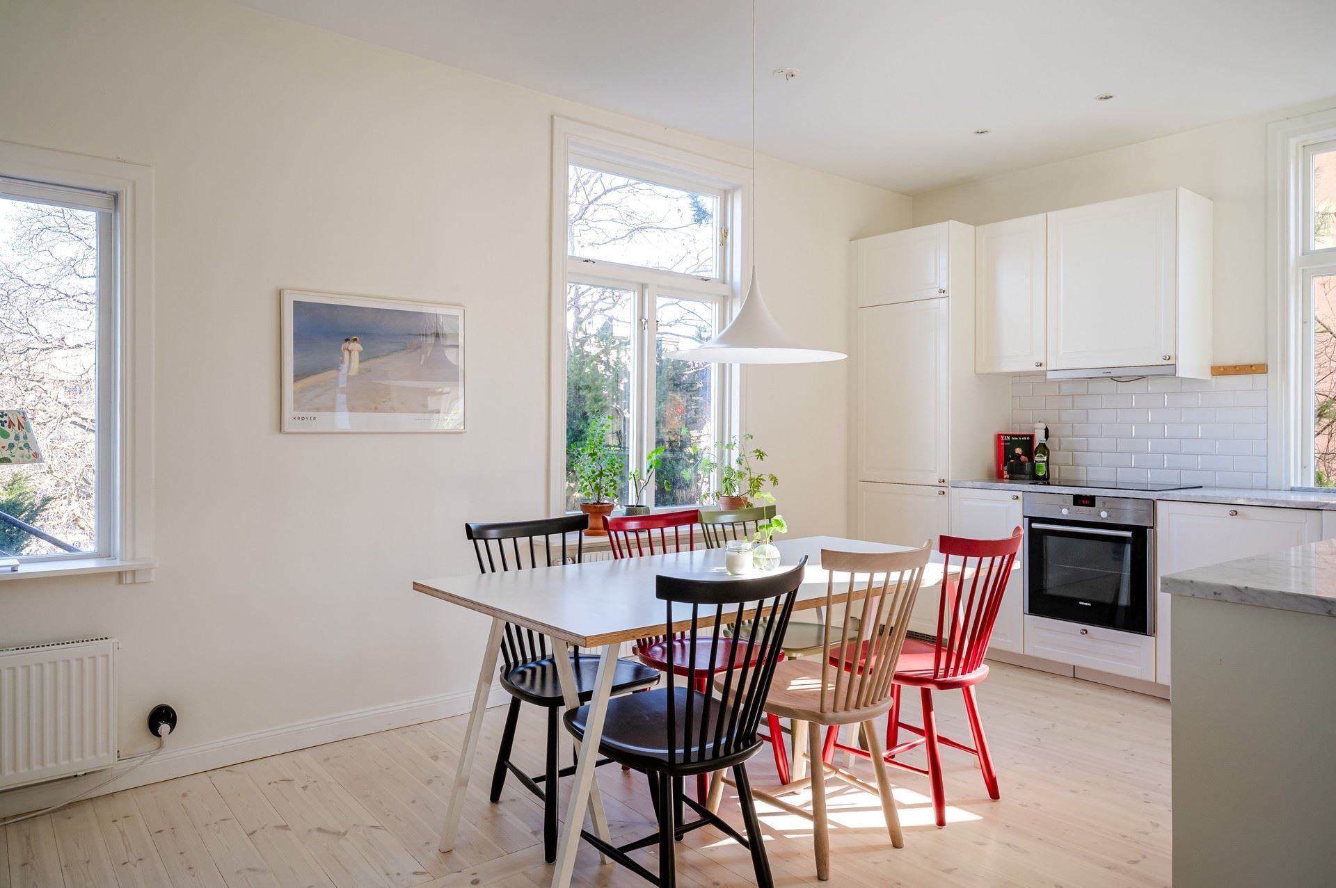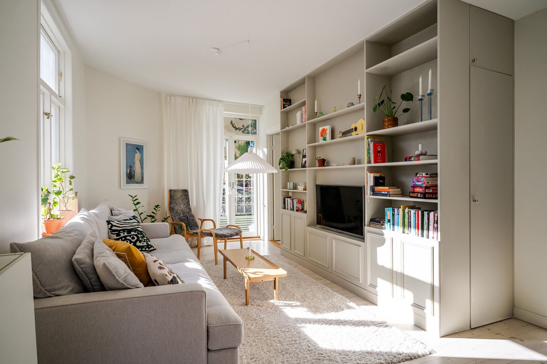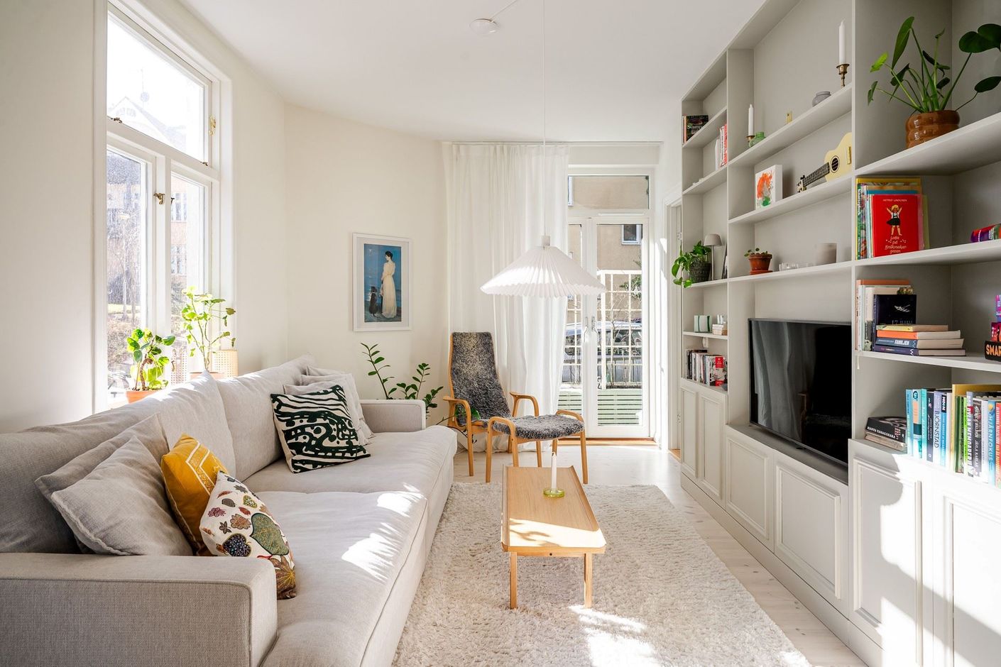 Detta ljusa och rymliga hem präglas av generös takhöjd (cirka 2,80 m), ljusa ytskikt och vitlaserade trägolv. De charmiga originalfönstren med T-spröjs bidrar till bostadens karaktär. Lägenheten genomgick en totalrenovering 2013, då bland annat kök och badrum uppdaterades.