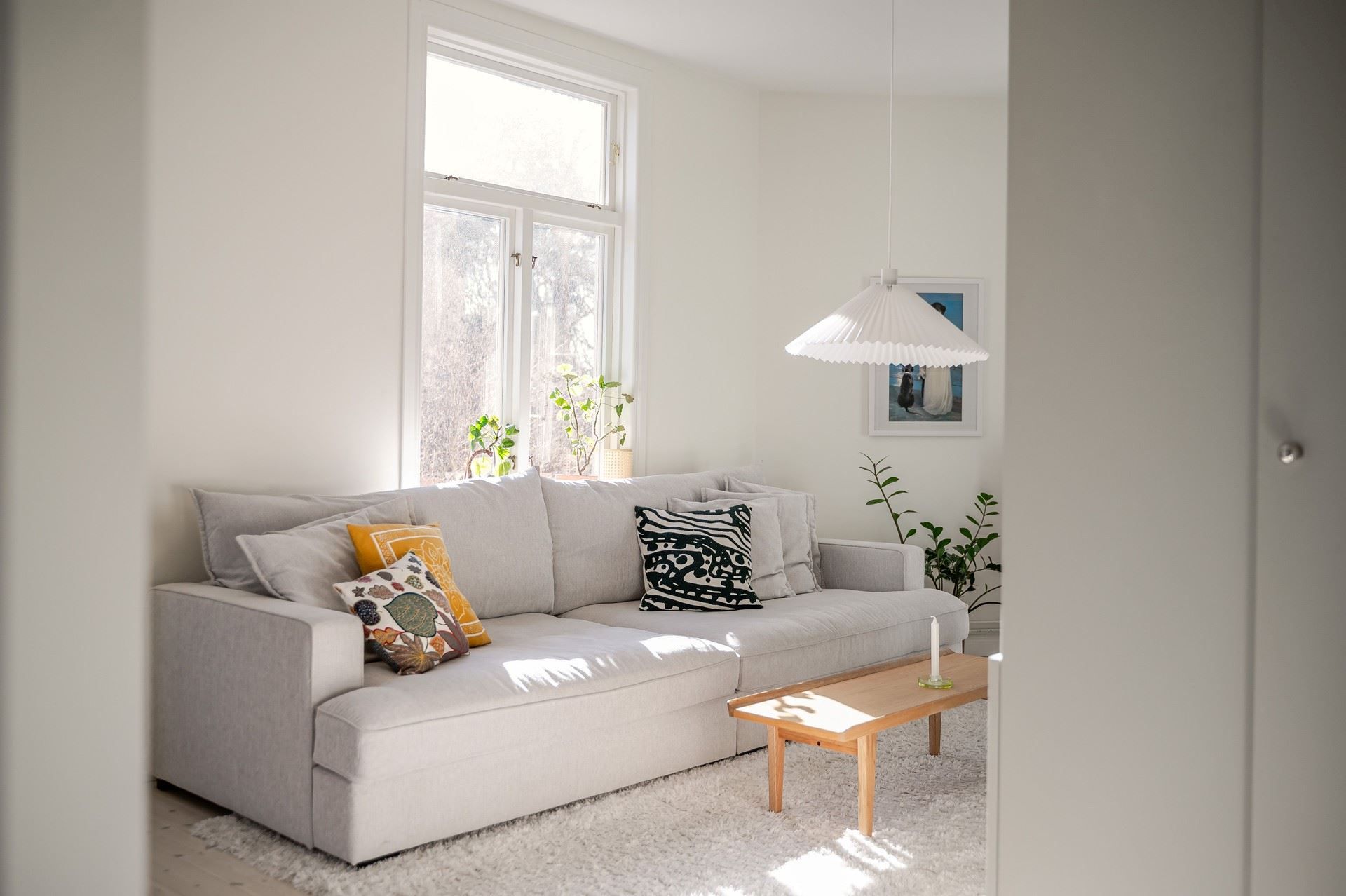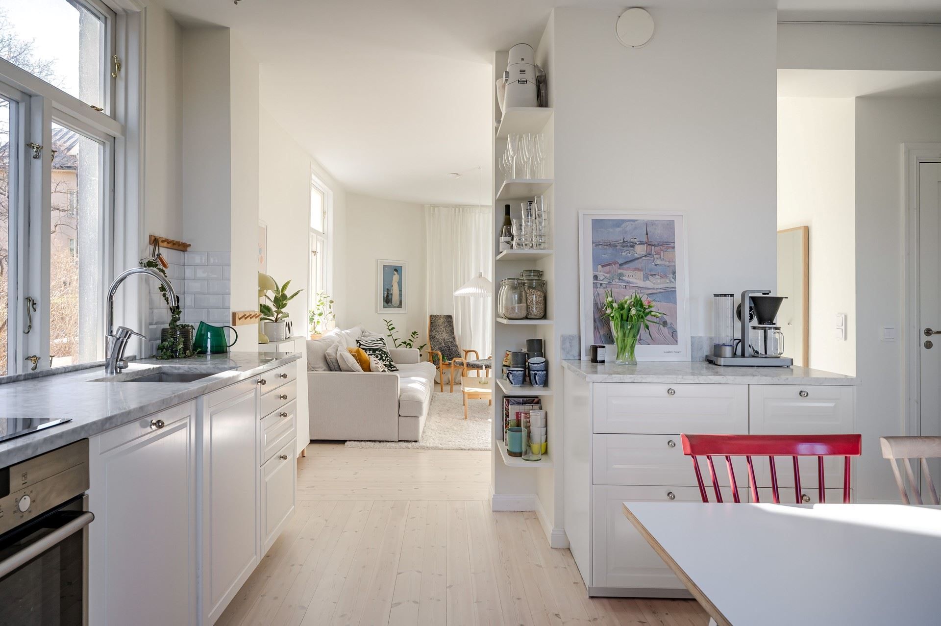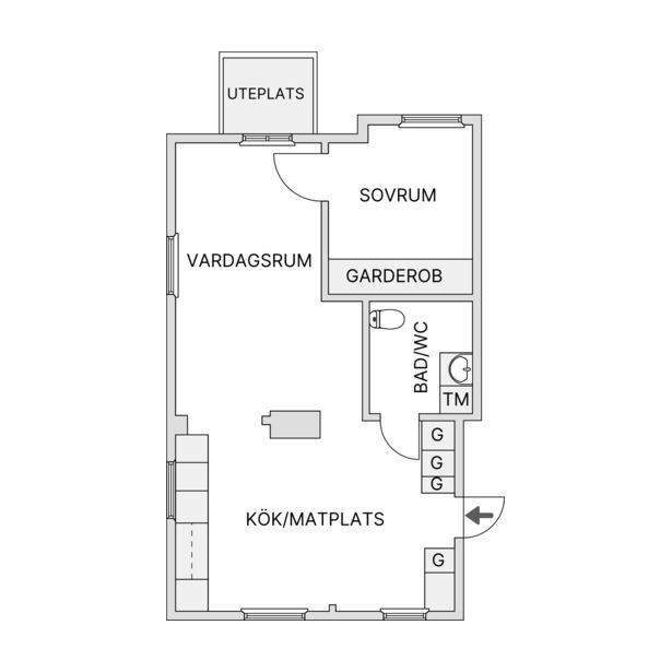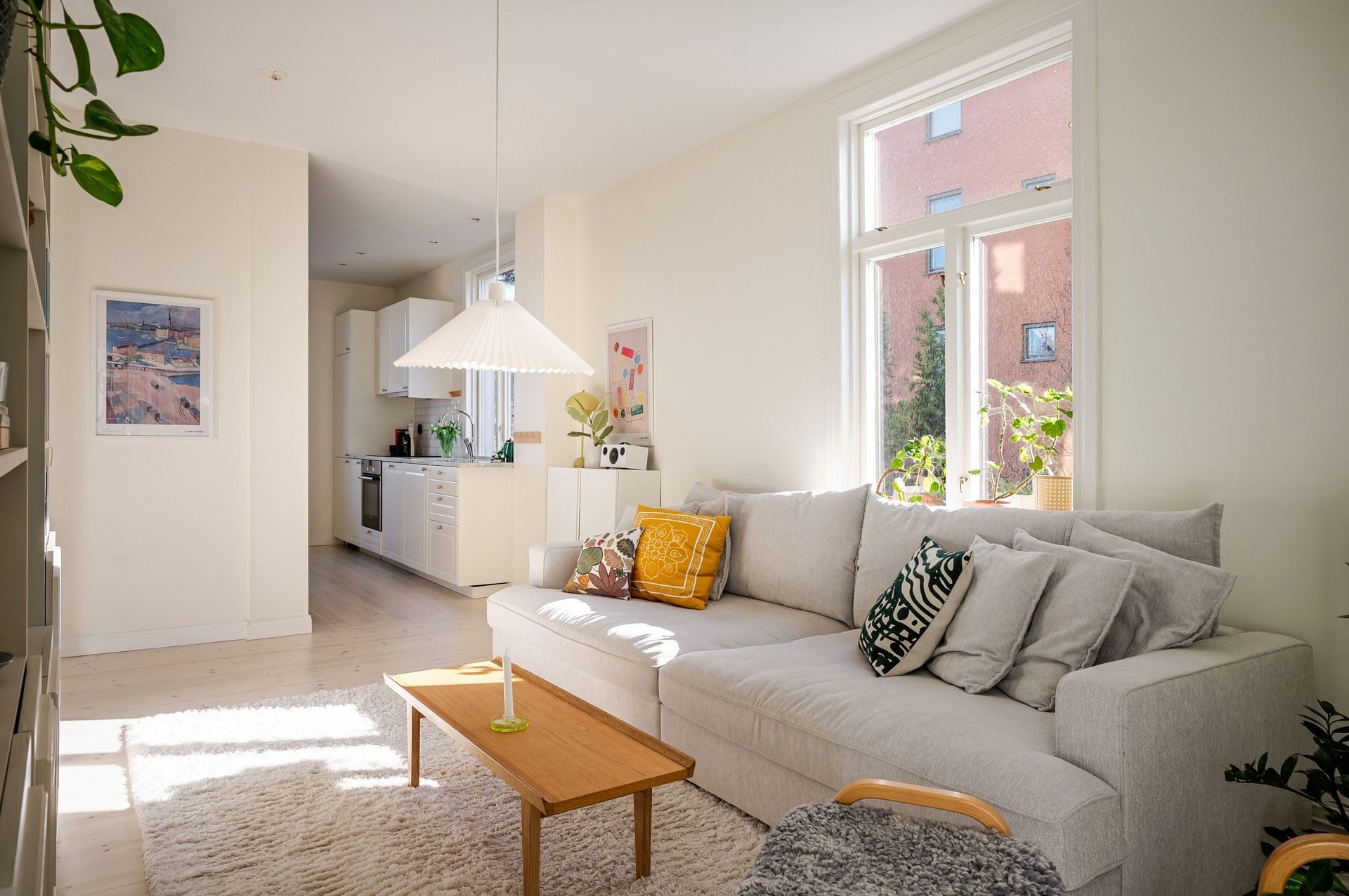 Redan vid entrén och i trapphuset möts du av en varm och inbjudande atmosfär. Bostaden upplevs som ljus, rymlig och social, med kök och vardagsrum i en öppen planlösning. Tillsammans har de flera fönster i olika riktningar samt utgång till uteplatsen. Här finns även ett rofyllt sovrum och ett stilrent badrum utrustat med egen tvättmaskin.