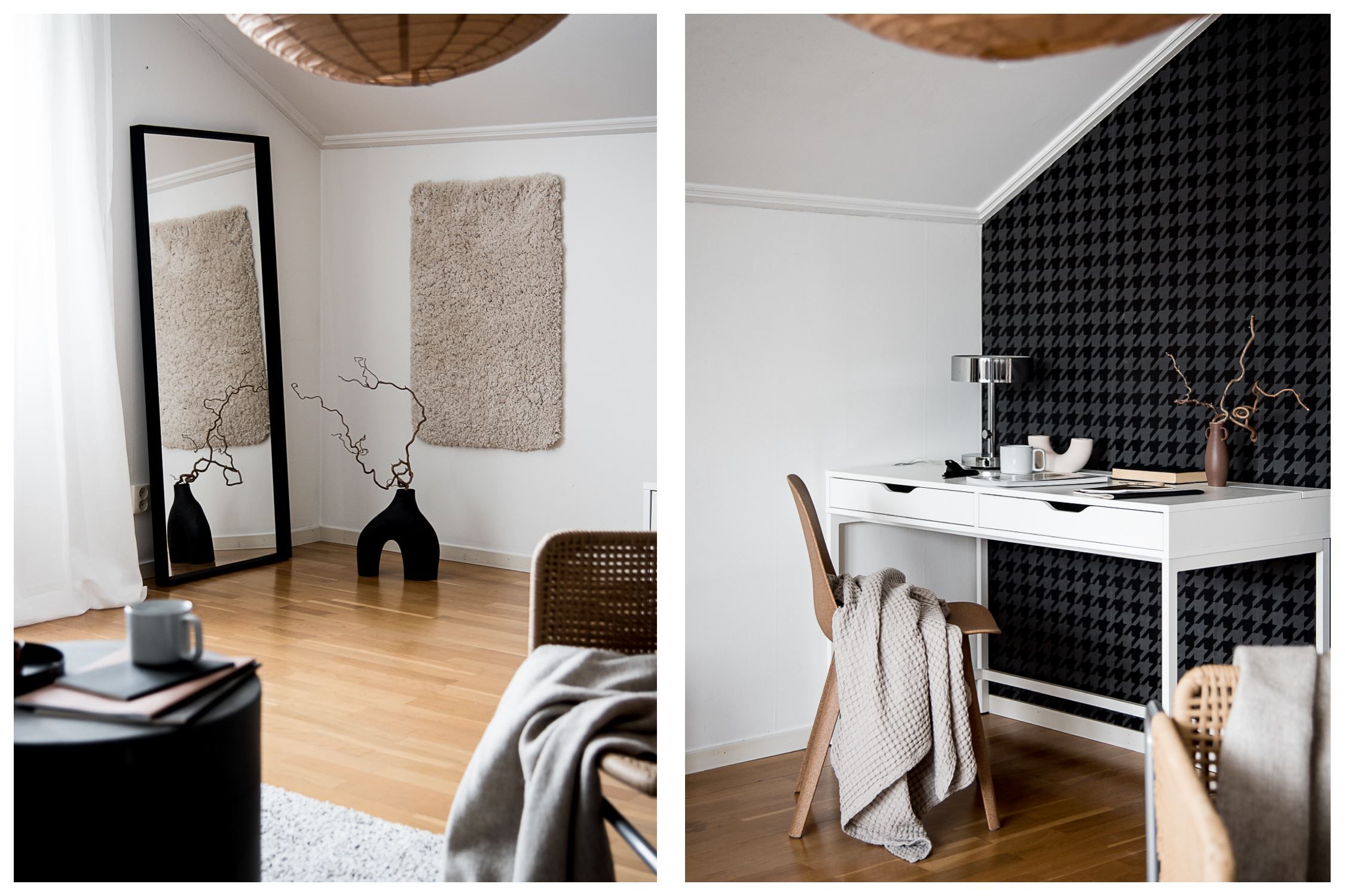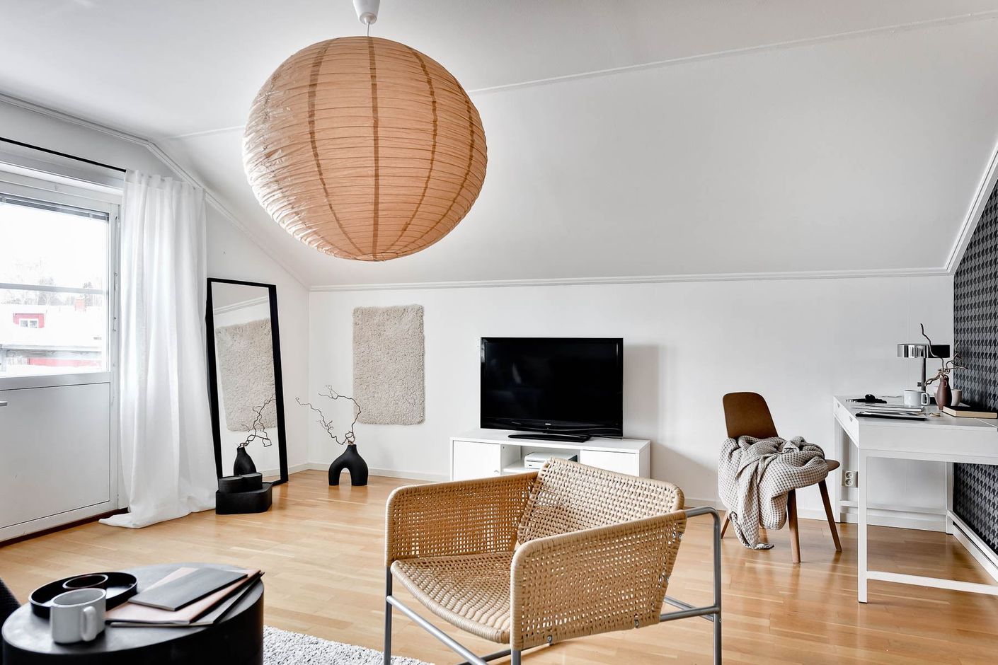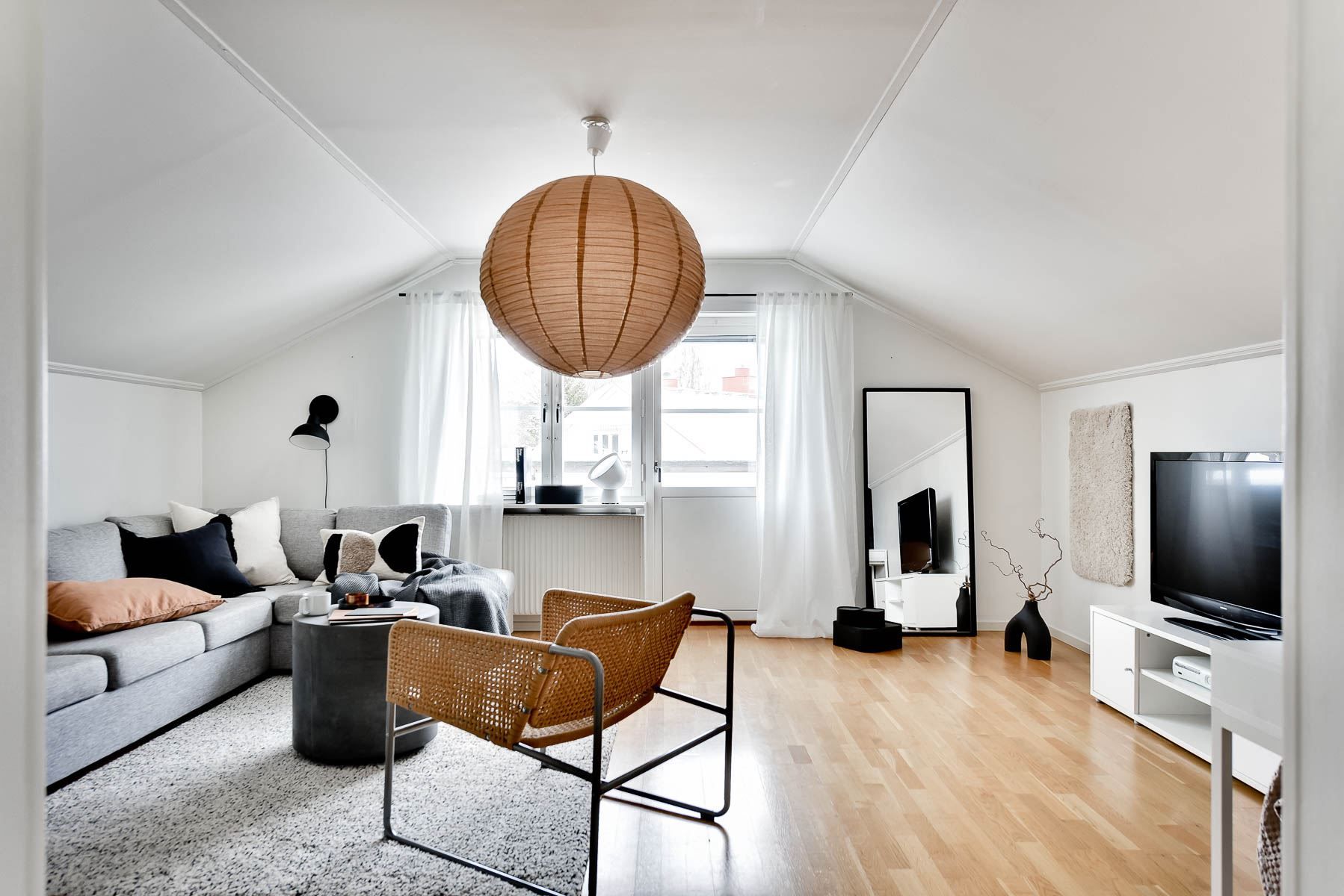 Lägenheten är genomgående ljus med ljusa ytskikt och ljusinsläpp från fönsterpartier.