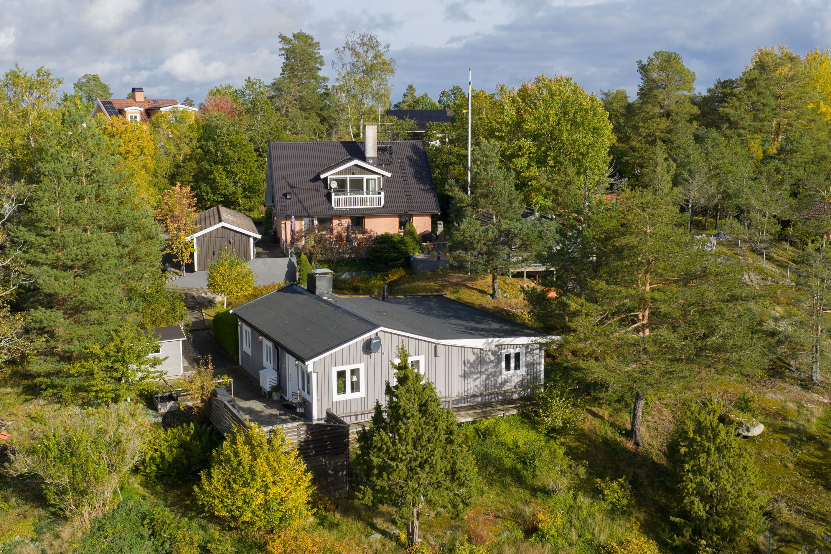 Längst in på tomten finns ytterligare ett hus, byggt 1930 som i dagsläget hyrs ut. Två sovrum, rymligt vardagsrum med öppen spis, kök renoverat 2015, badrum och tvättstuga. Fin altan med och det det höga läget ger en fantastisk utsikt. Egen uppfart med parkeringsplats på framsidan.