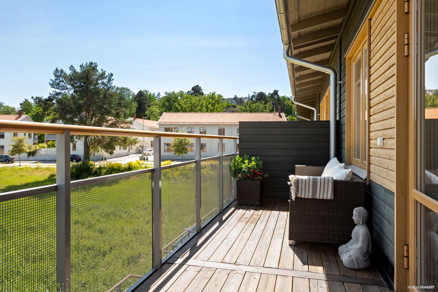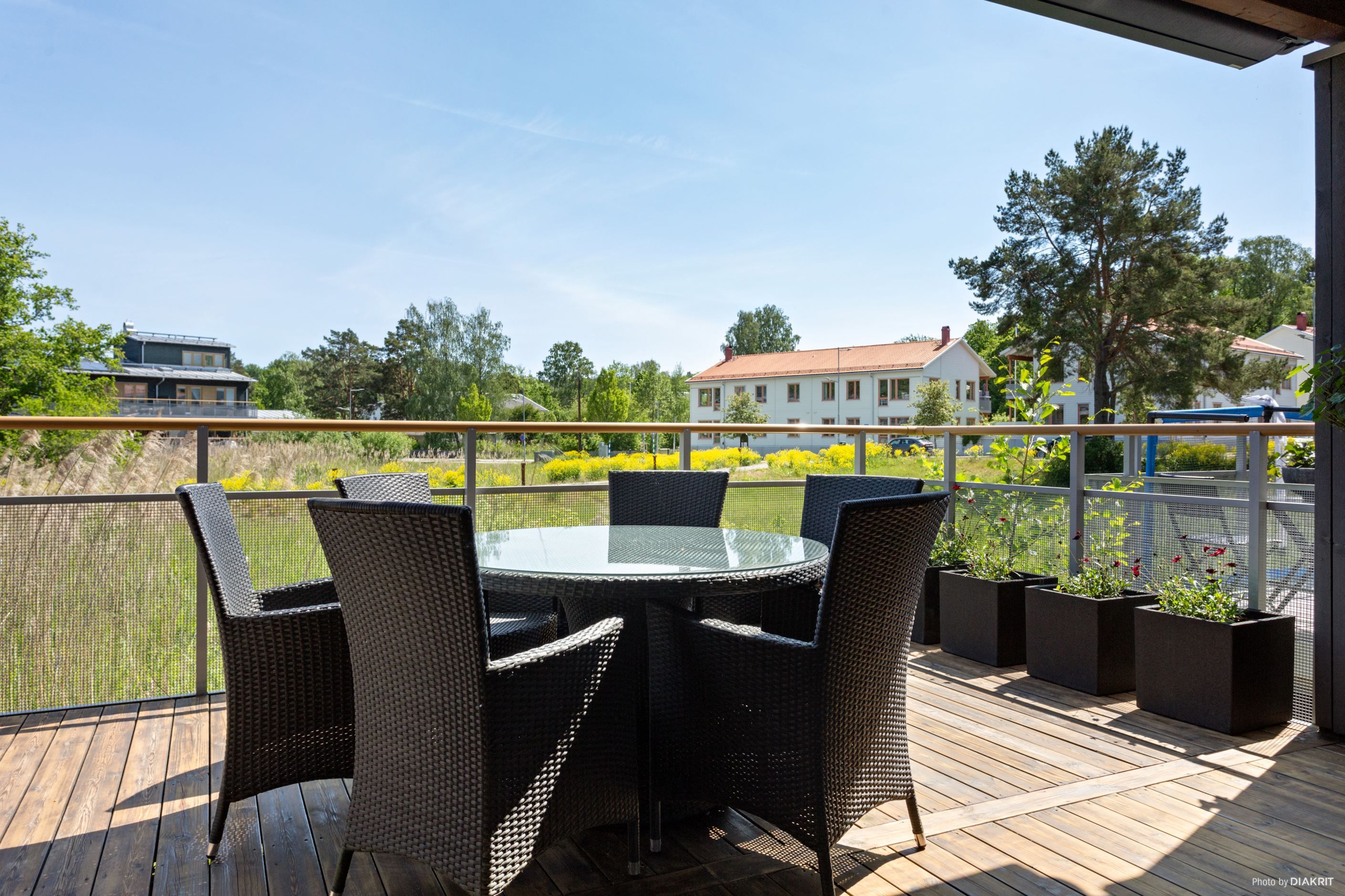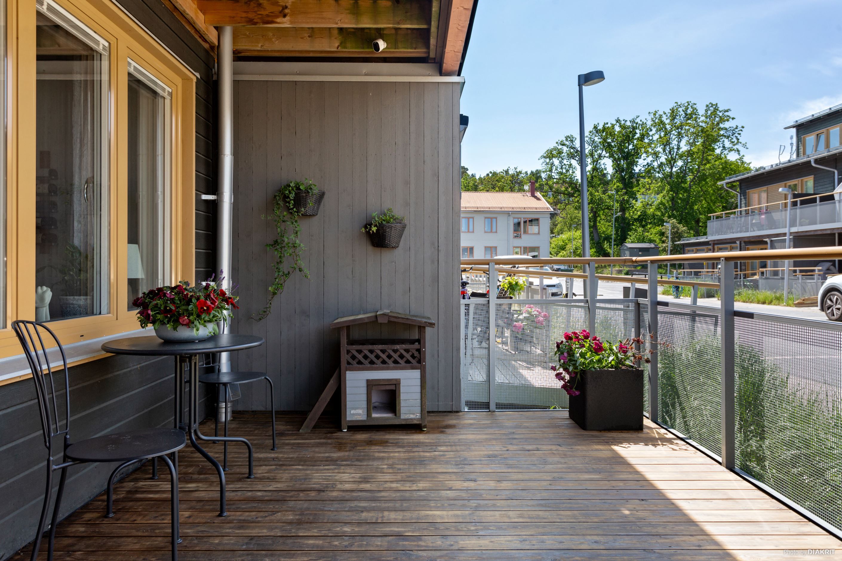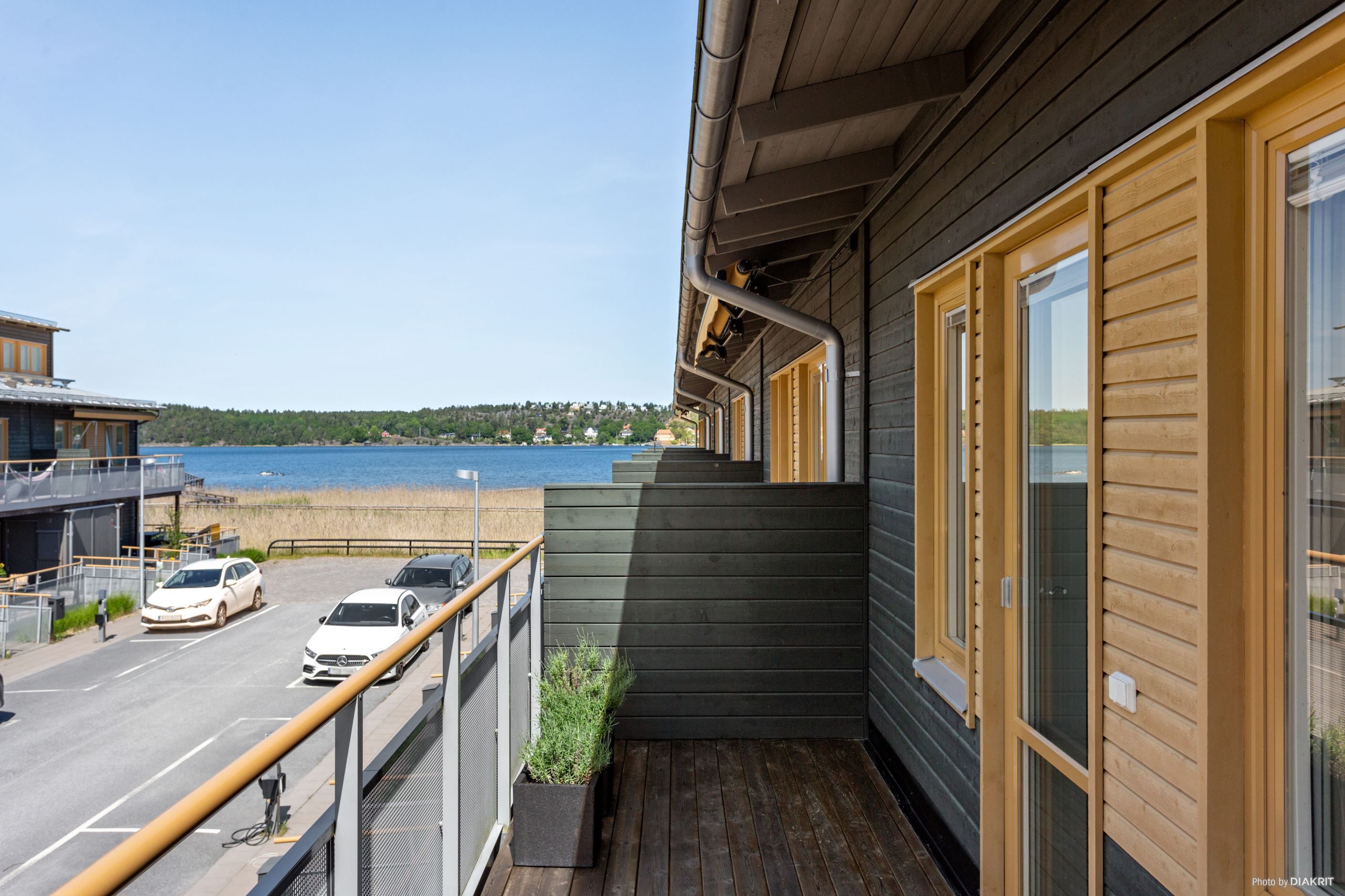 Bostadsrättsradhuset är byggt i två välplanerade våningsplan med utrymme för middagsbjudningar för både vänner och familj på någon av de två stora uteplatser samt möjlighet att njuta av sjöutsikten eller solen från någon av de två rymliga balkongerna.