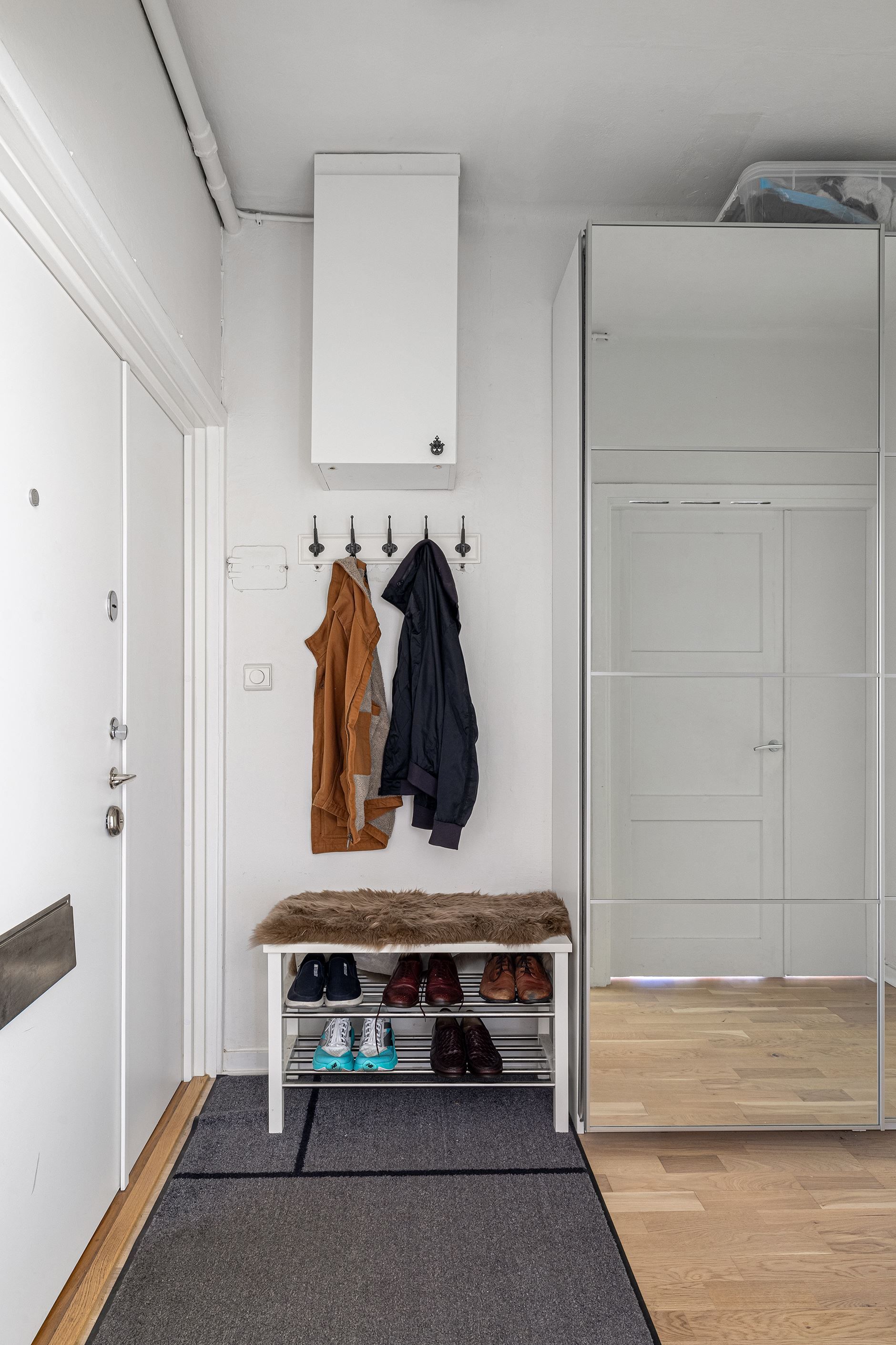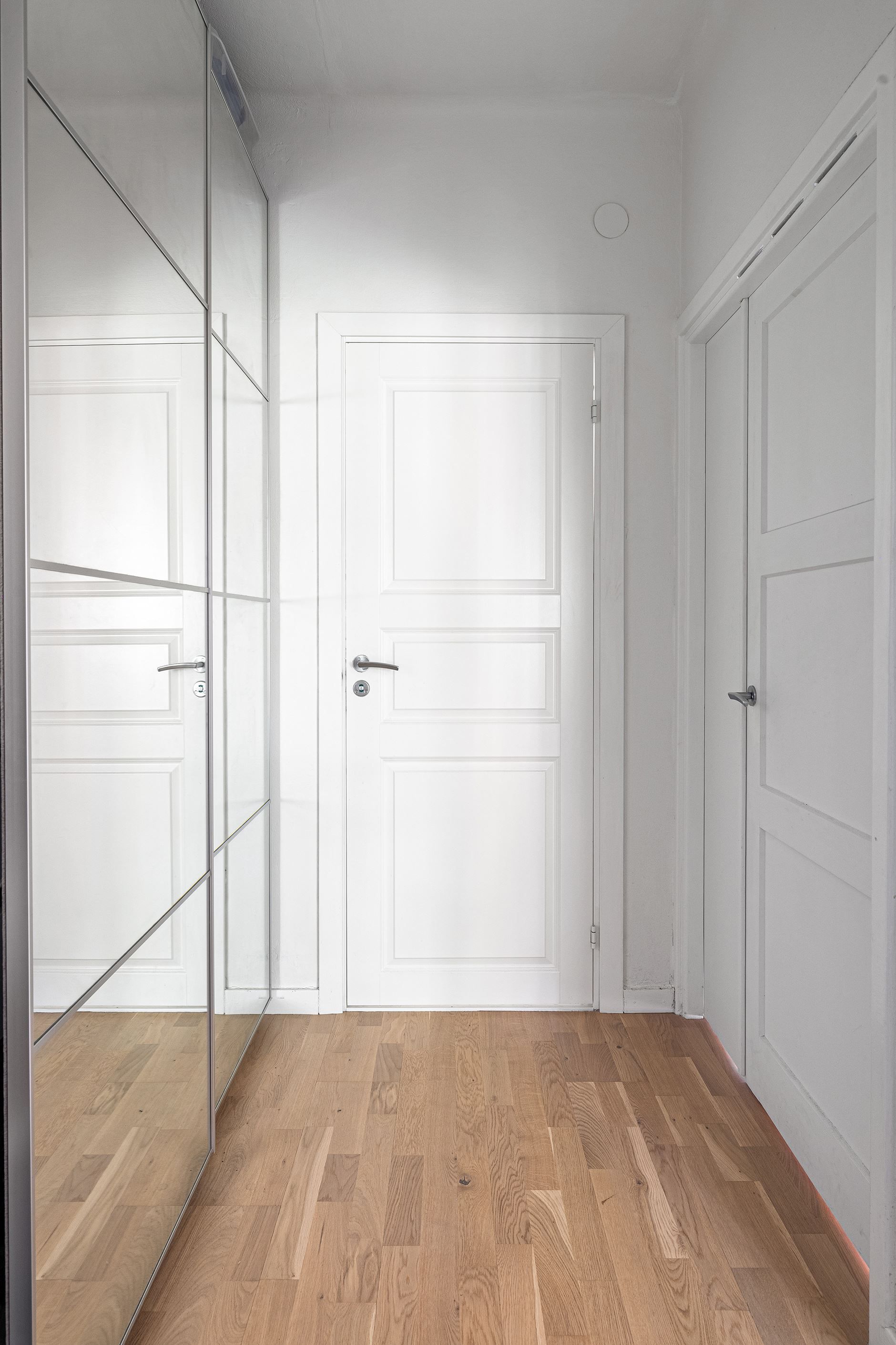 När du kliver in möts du av ett underbart ljusflöde som genomsyrar hela hemmet och bidrar till en trivsam och hemtrevlig känsla. Det genomgående ljusa golvet och de vita väggarna, kombinerat med en stilfull träpanel i vardagsrummet, ger bostaden både karaktär och värme.