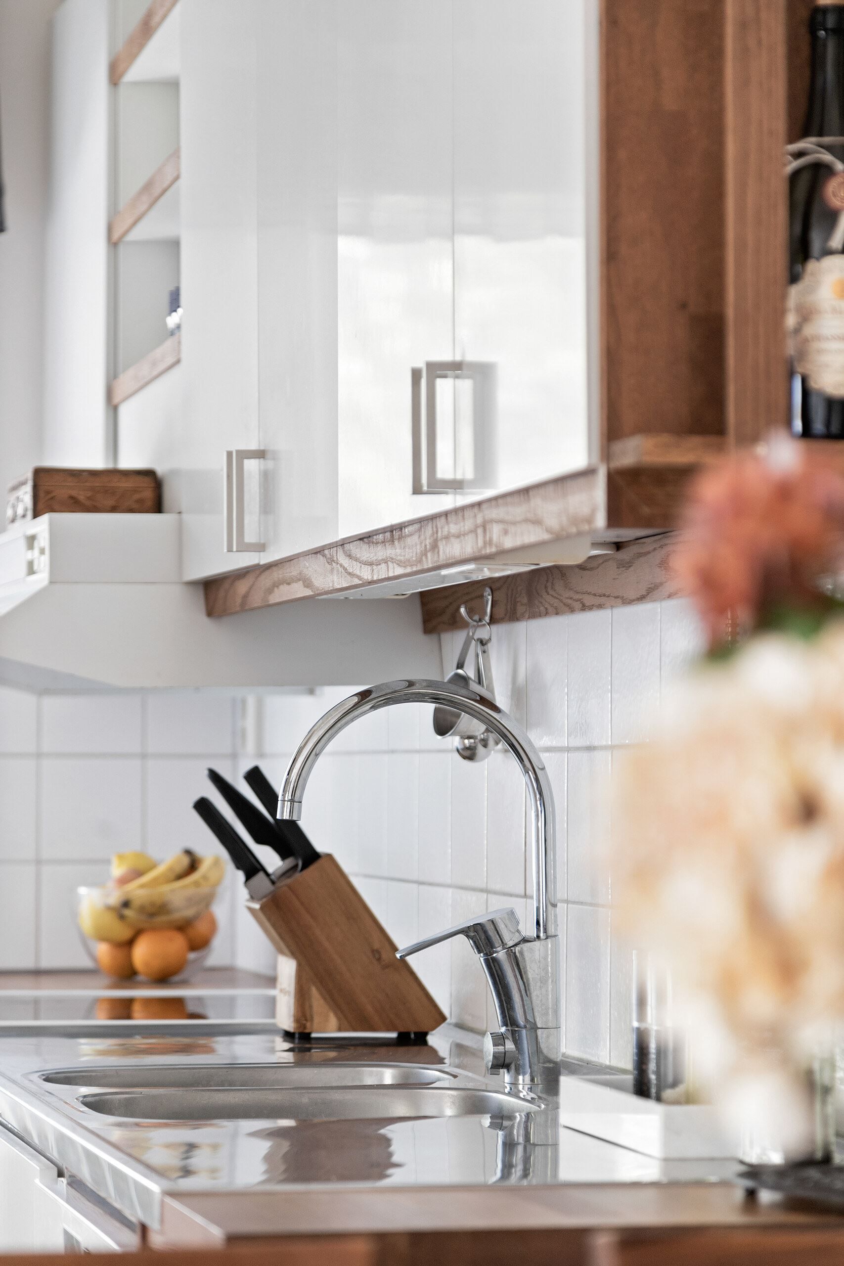 Kök - Bra arbetskök med gott om utrustning och förvaring i köket. Vita luckor från Marbodal, kakel i vitt och diskbänk i rostfritt. Köket är utrustat med kombinerad kyl/frys, spis/ugn och fläkt.