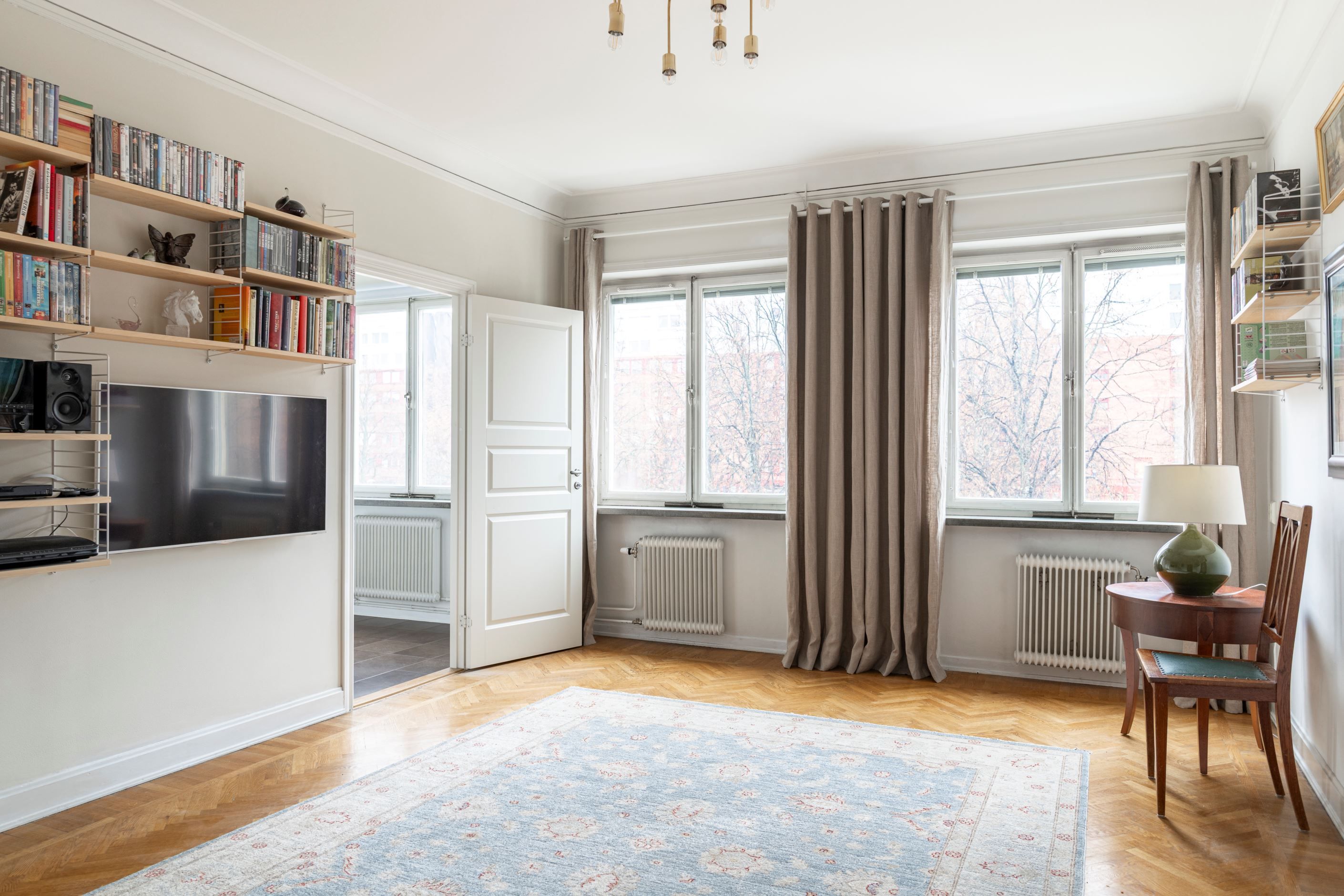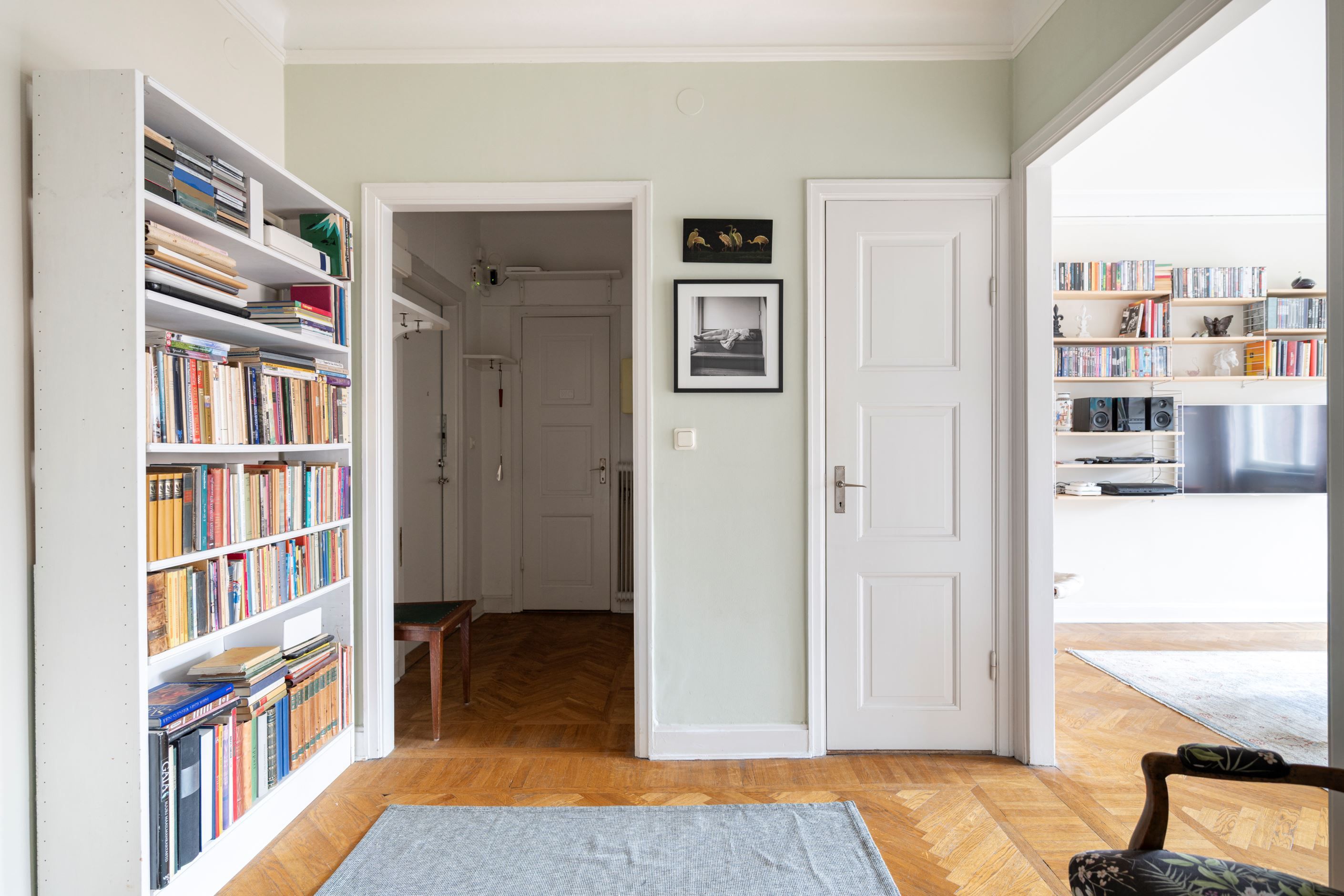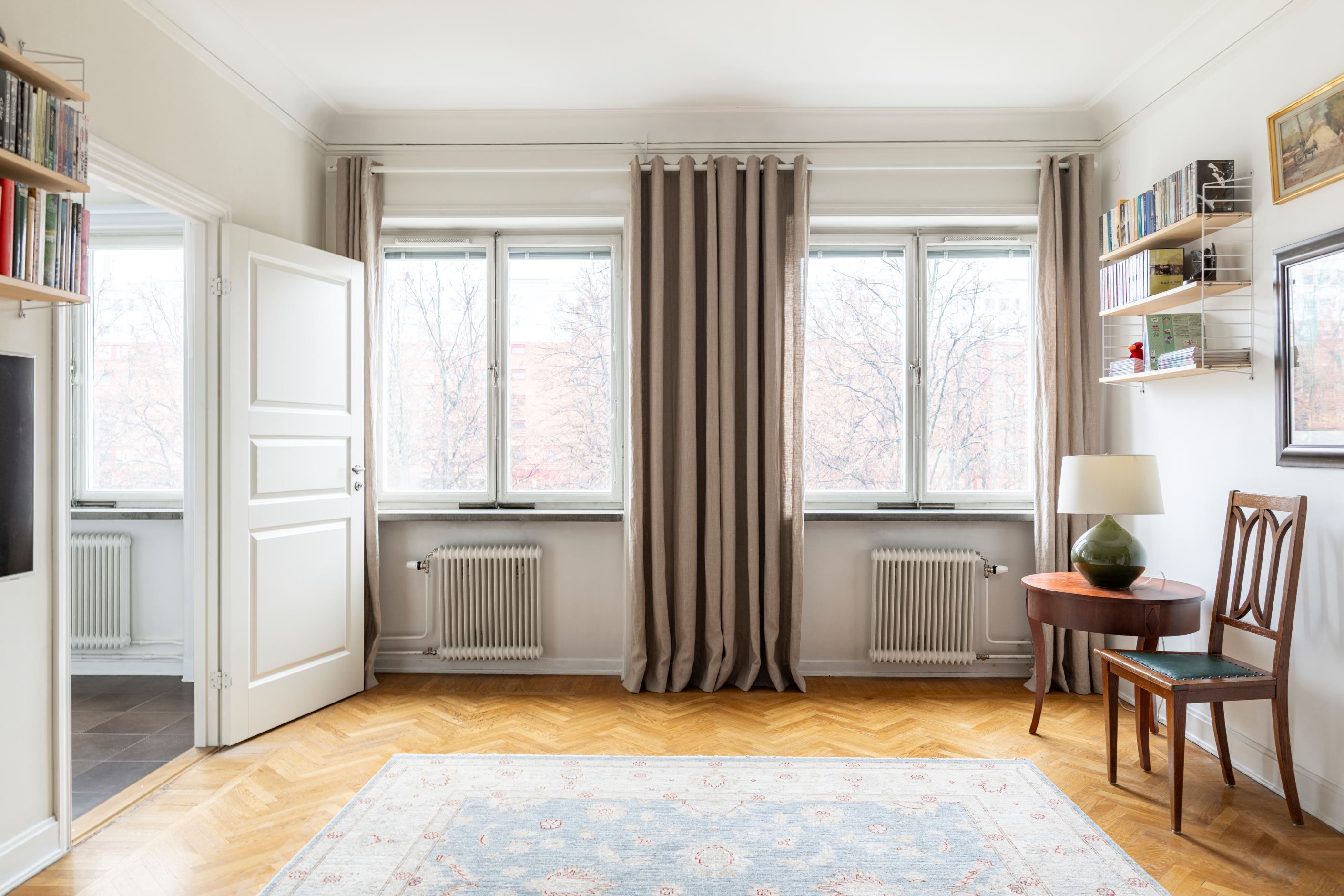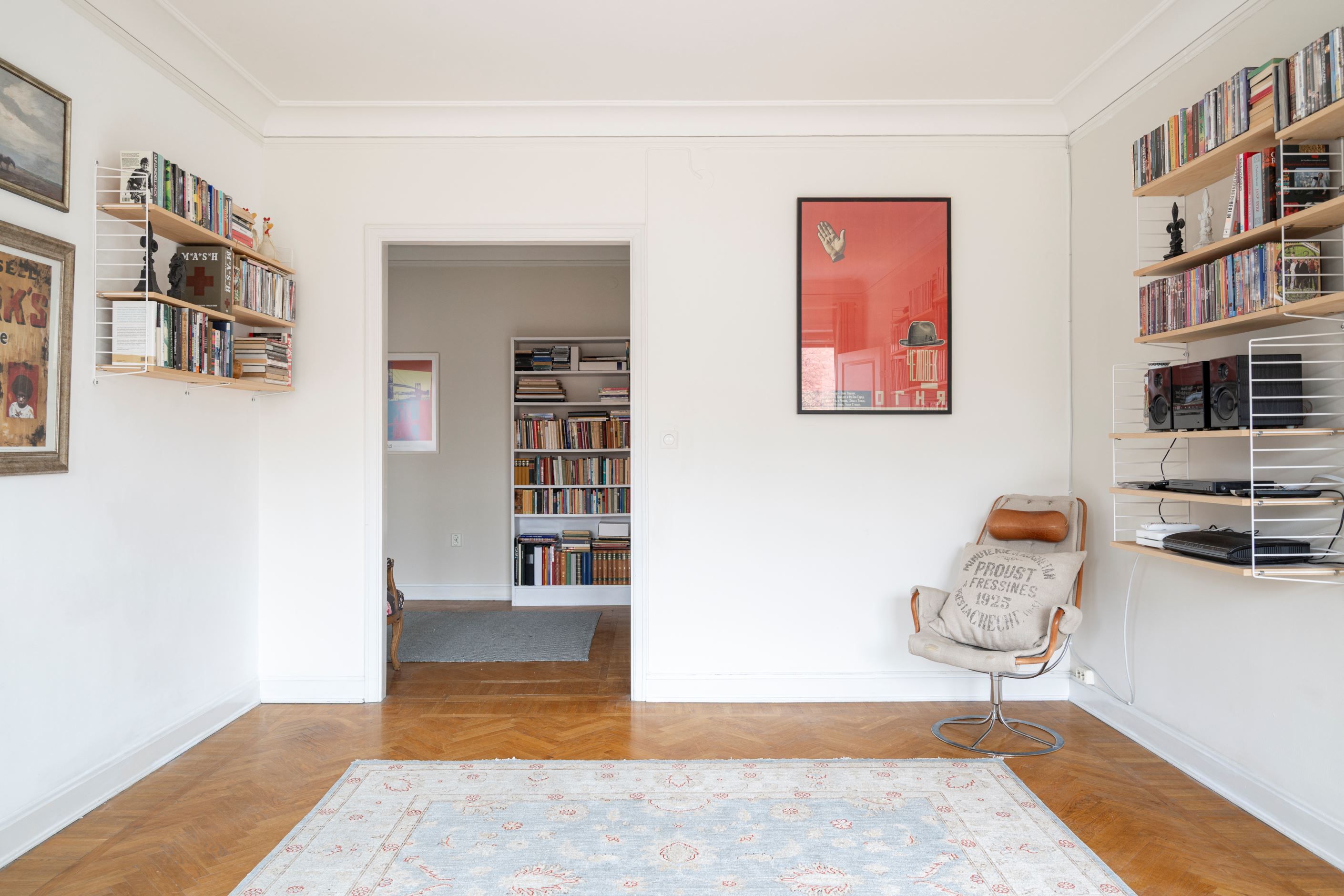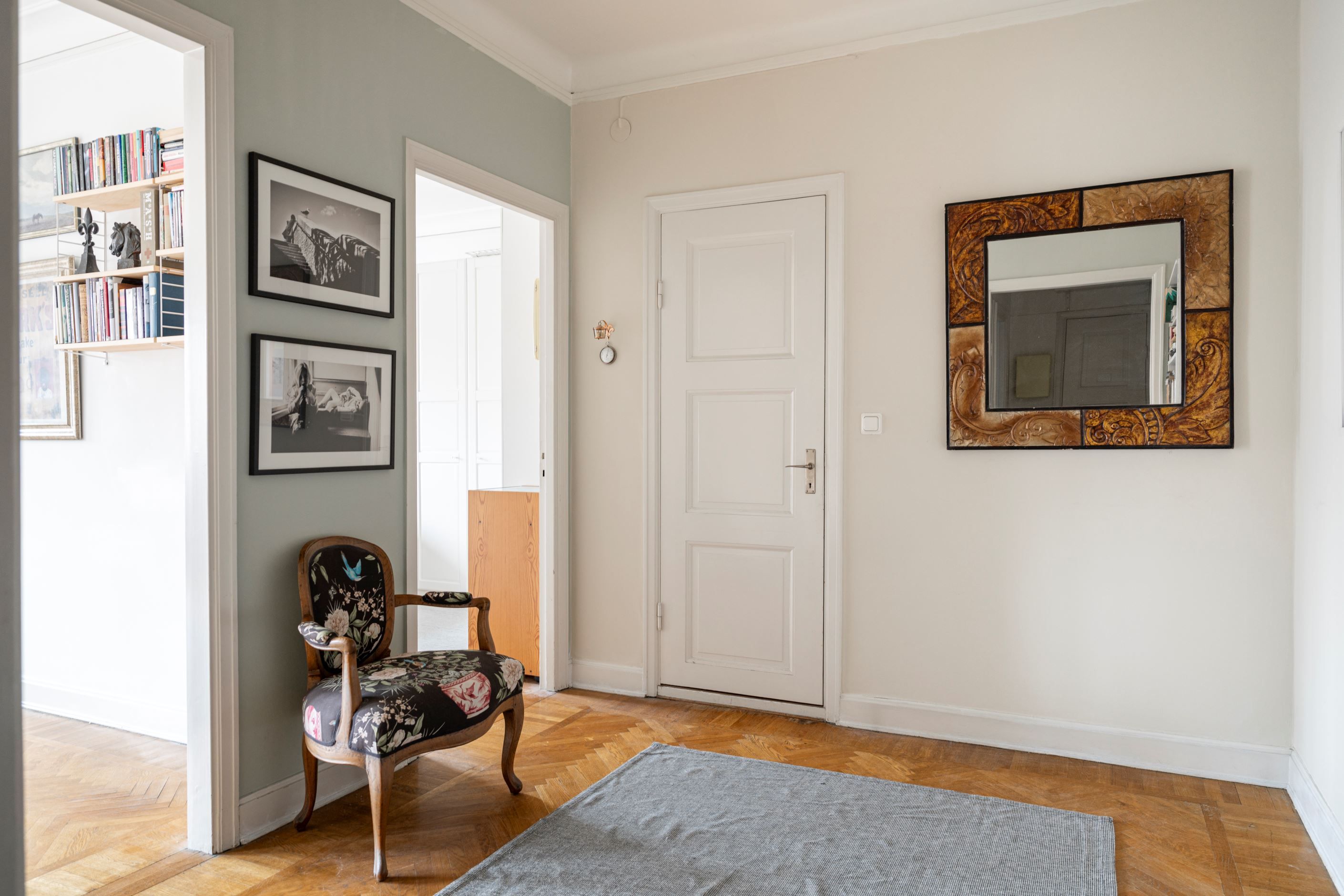 Här möts klassiska detaljer som generös takhöjd och vacker fiskbensparkett med en sober färgsättning och ett stilrent kök. Planlösningen är genomtänkt med rum i fil och en stor, möblerbar hall som med fördel kan användas som arbetsplats.