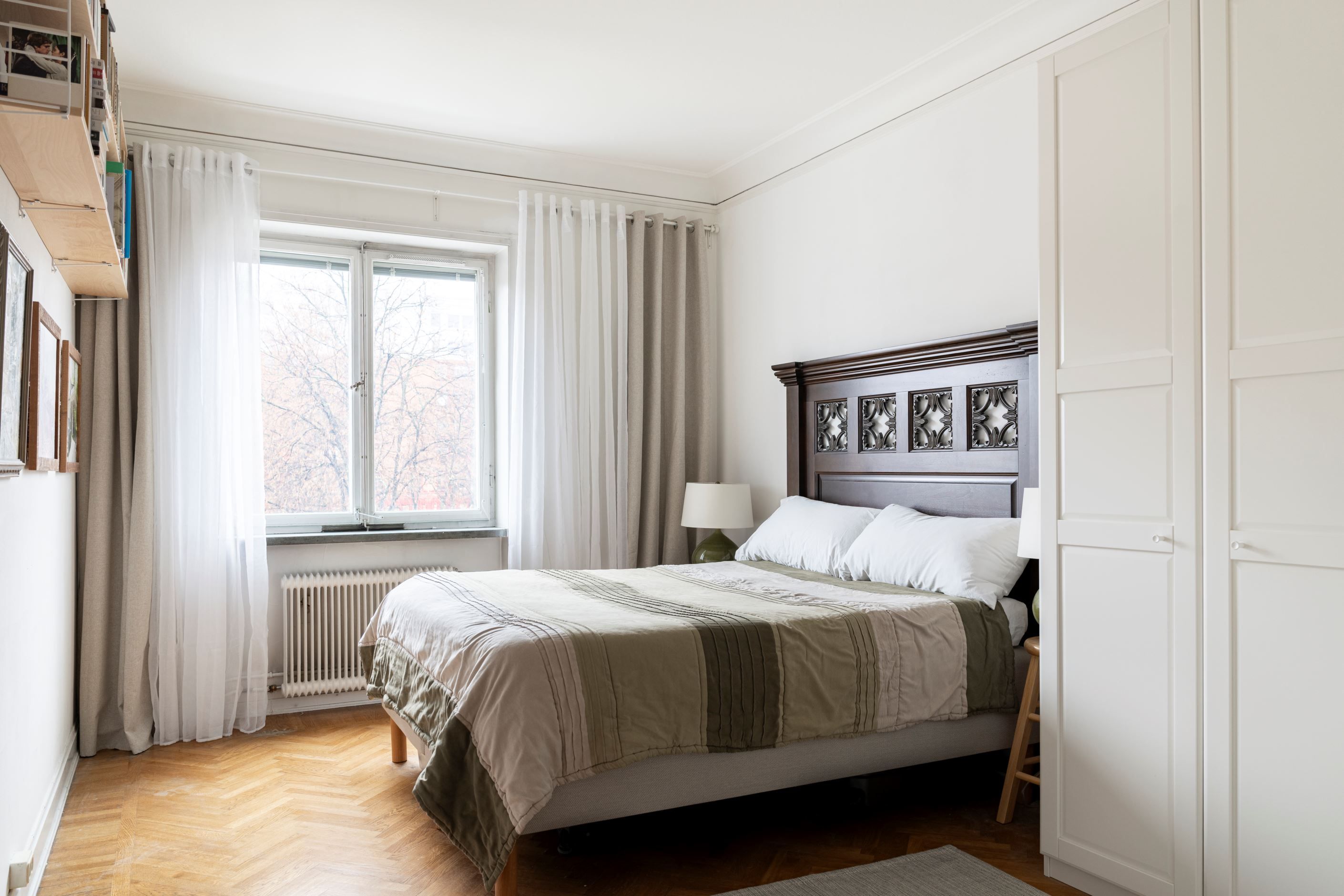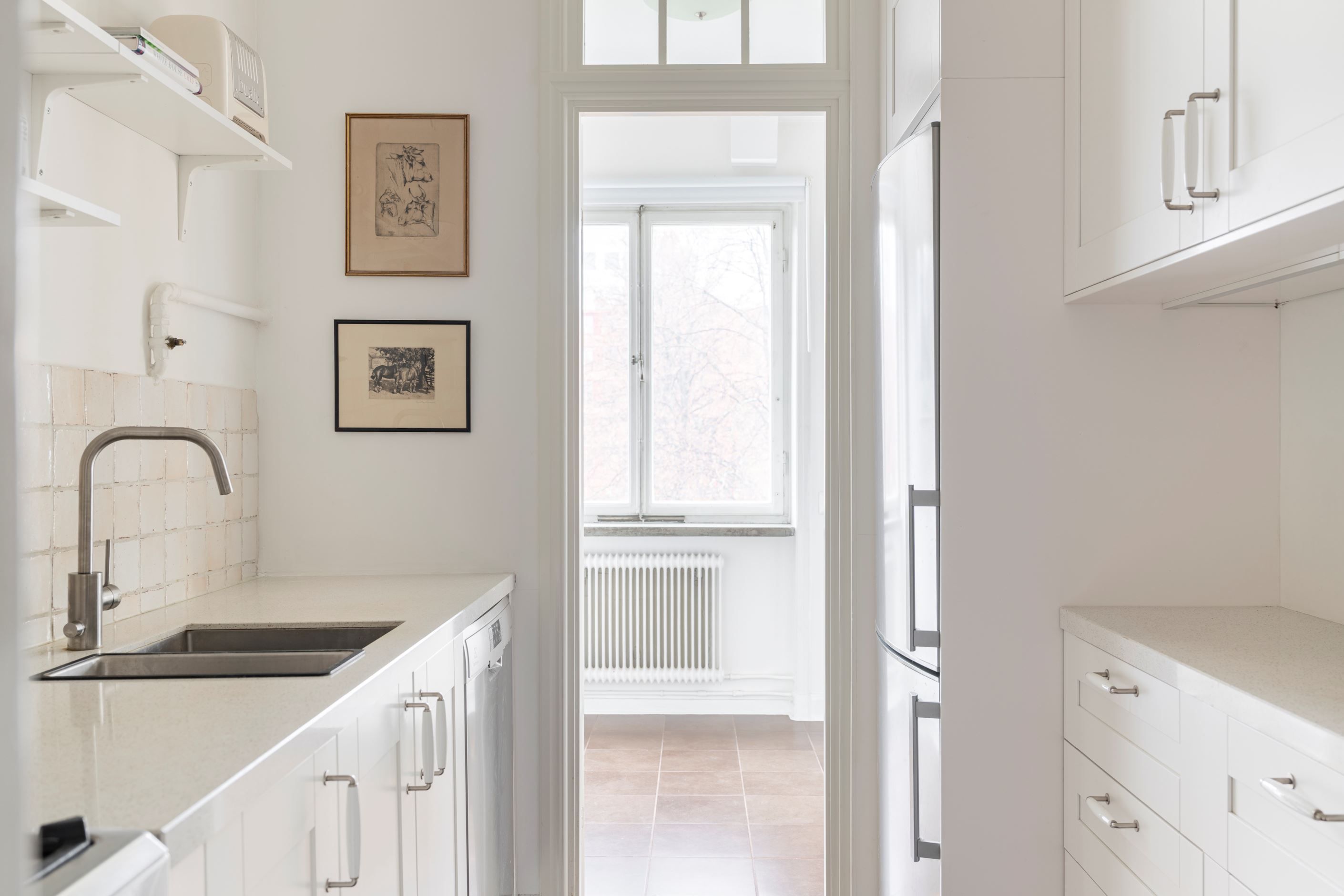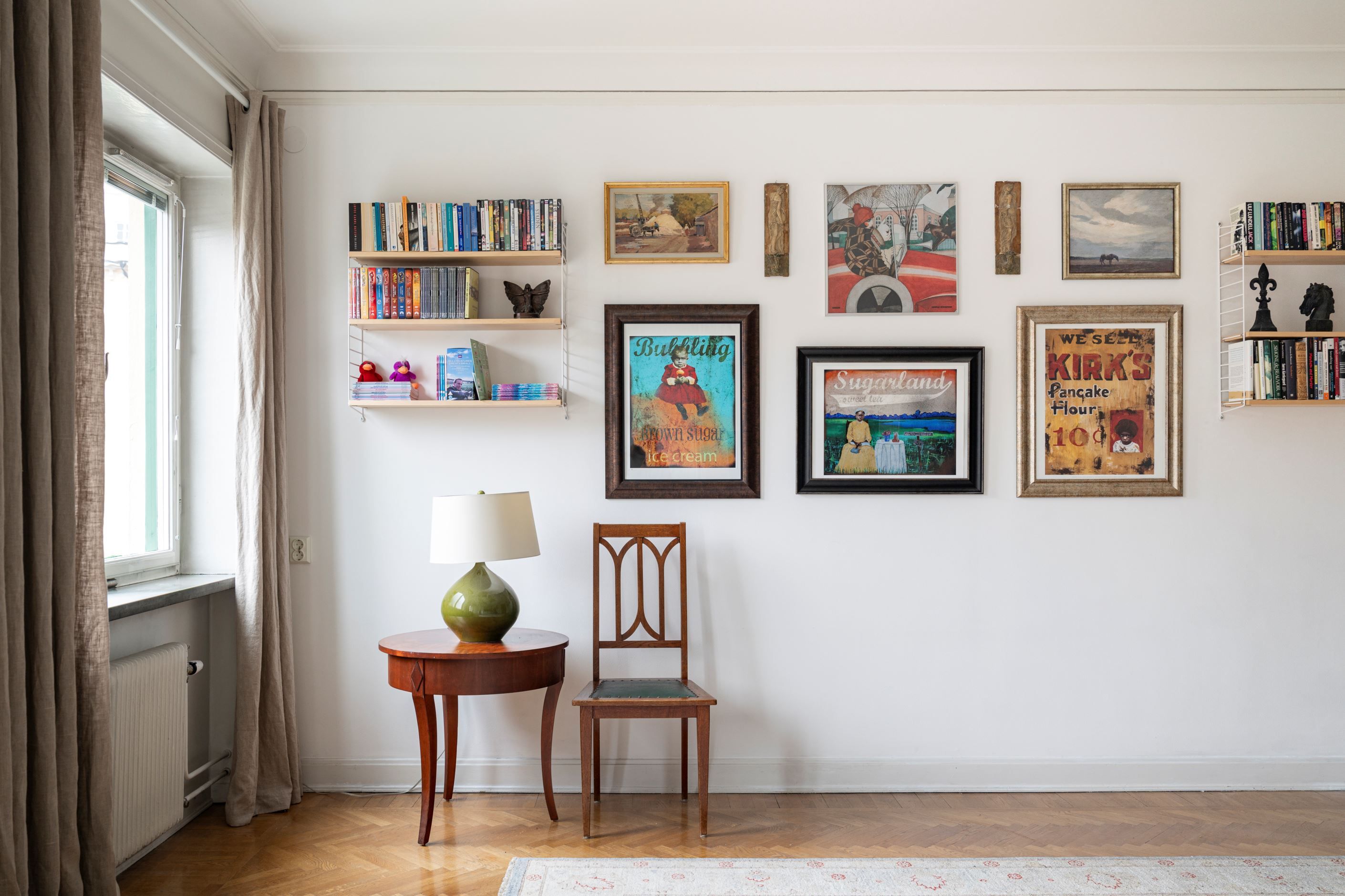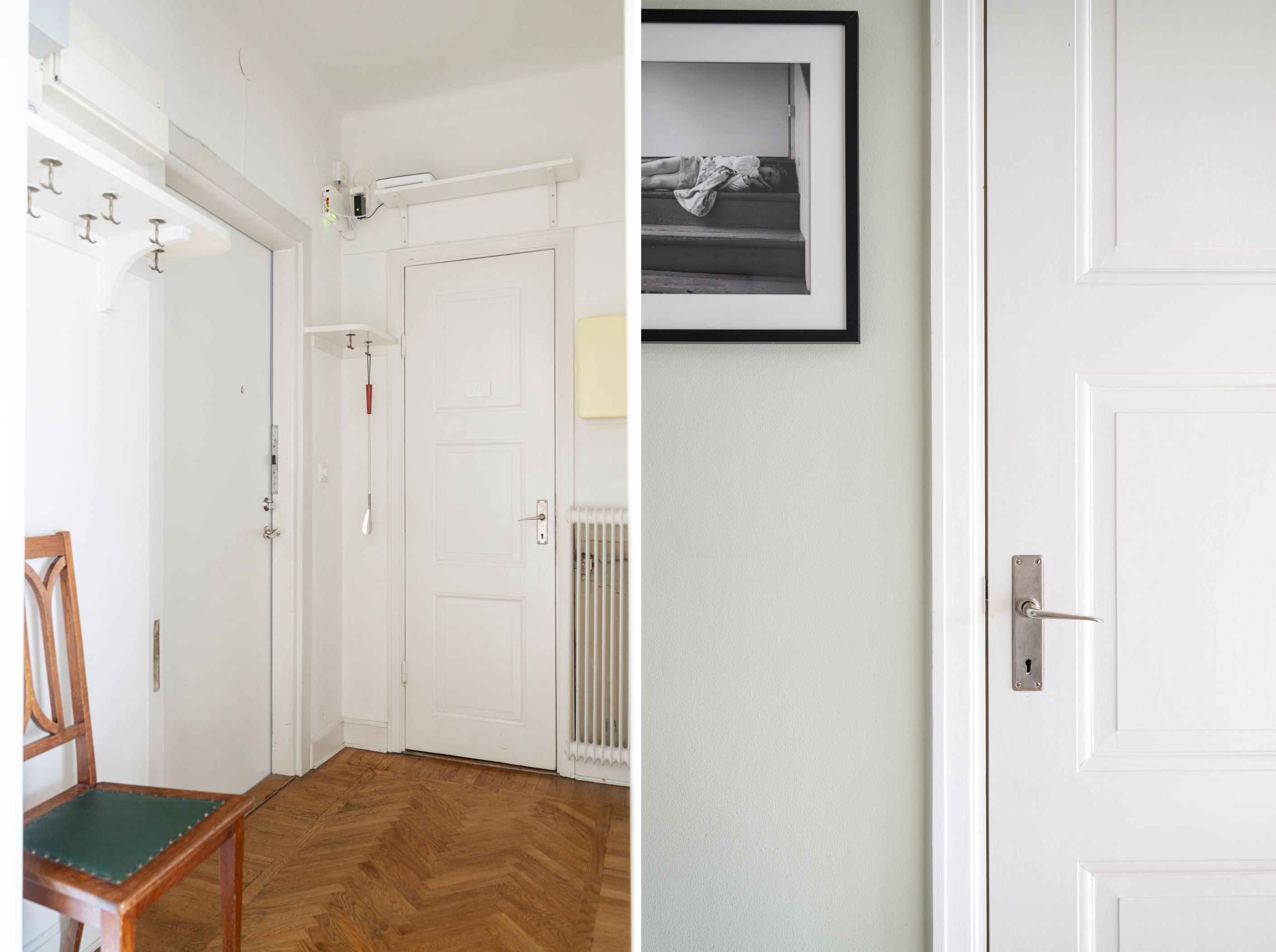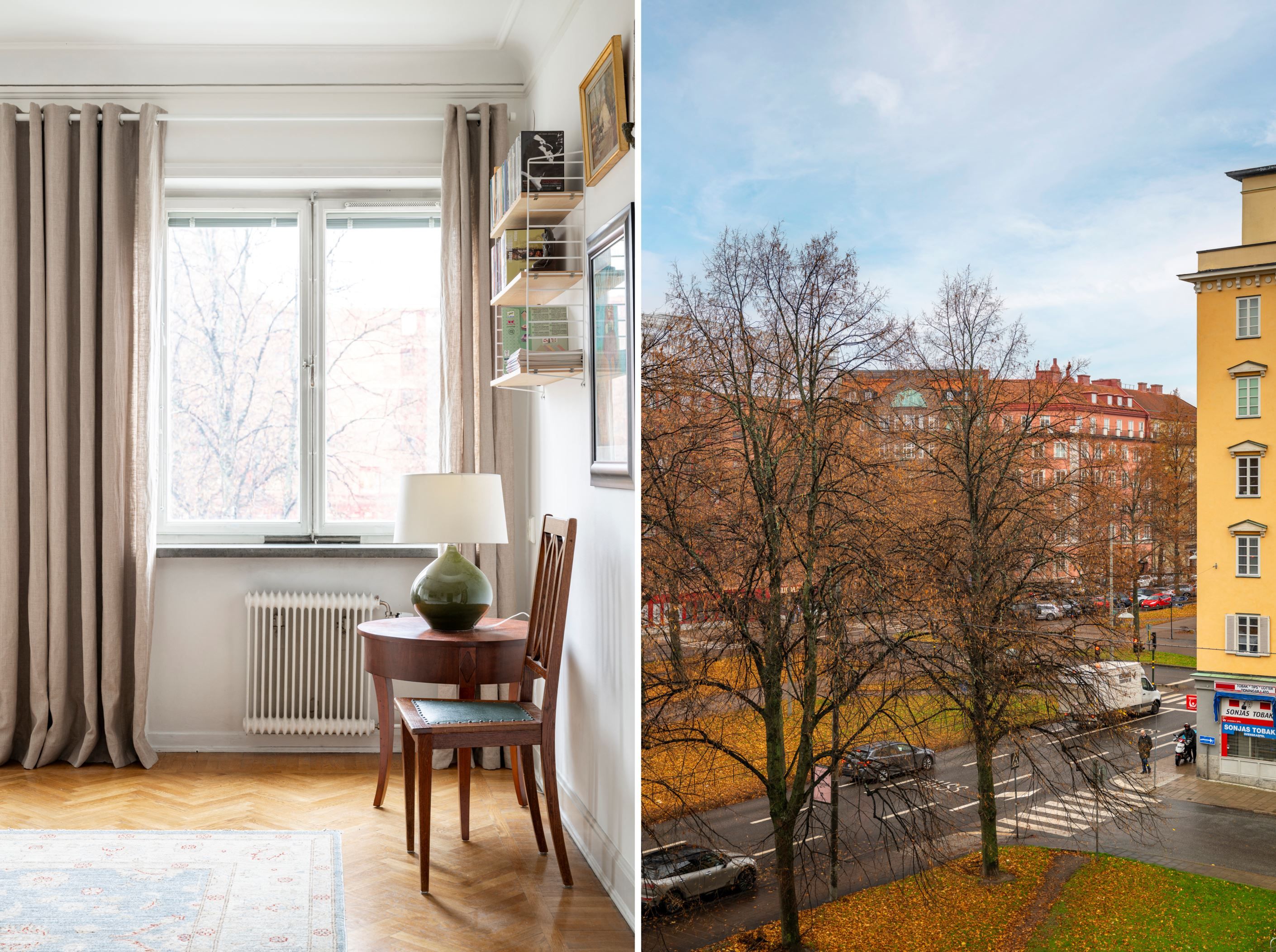 Här möts klassiska detaljer som generös takhöjd och vacker fiskbensparkett med en sober färgsättning och ett stilrent kök. Planlösningen är genomtänkt med rum i fil och en stor, möblerbar hall som med fördel kan användas som arbetsplats.