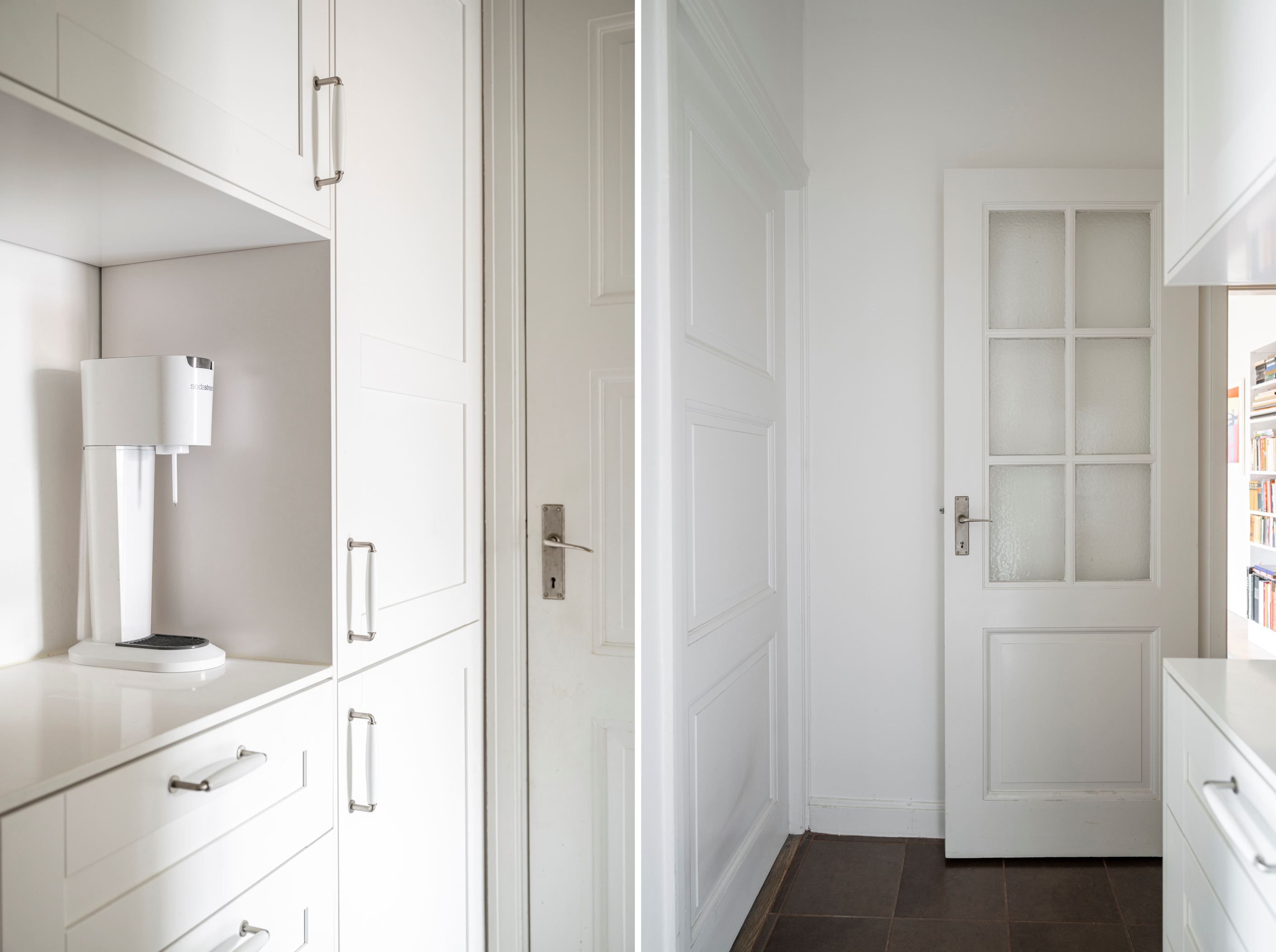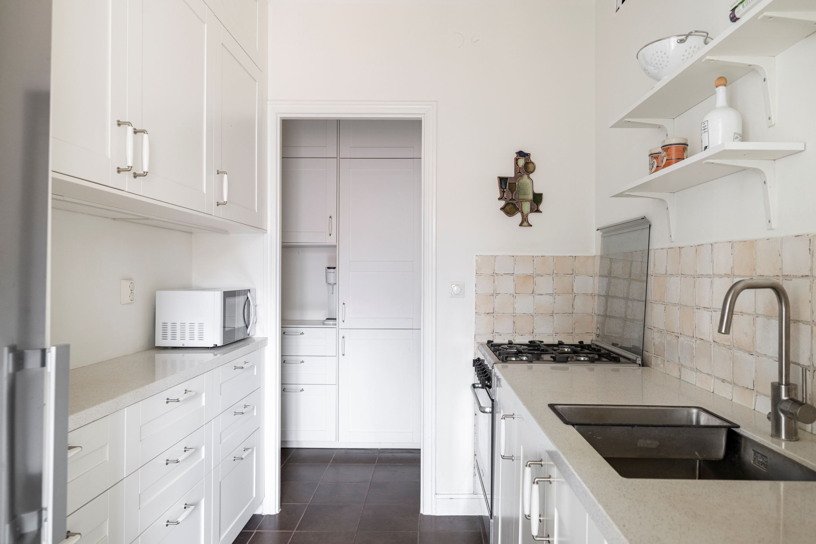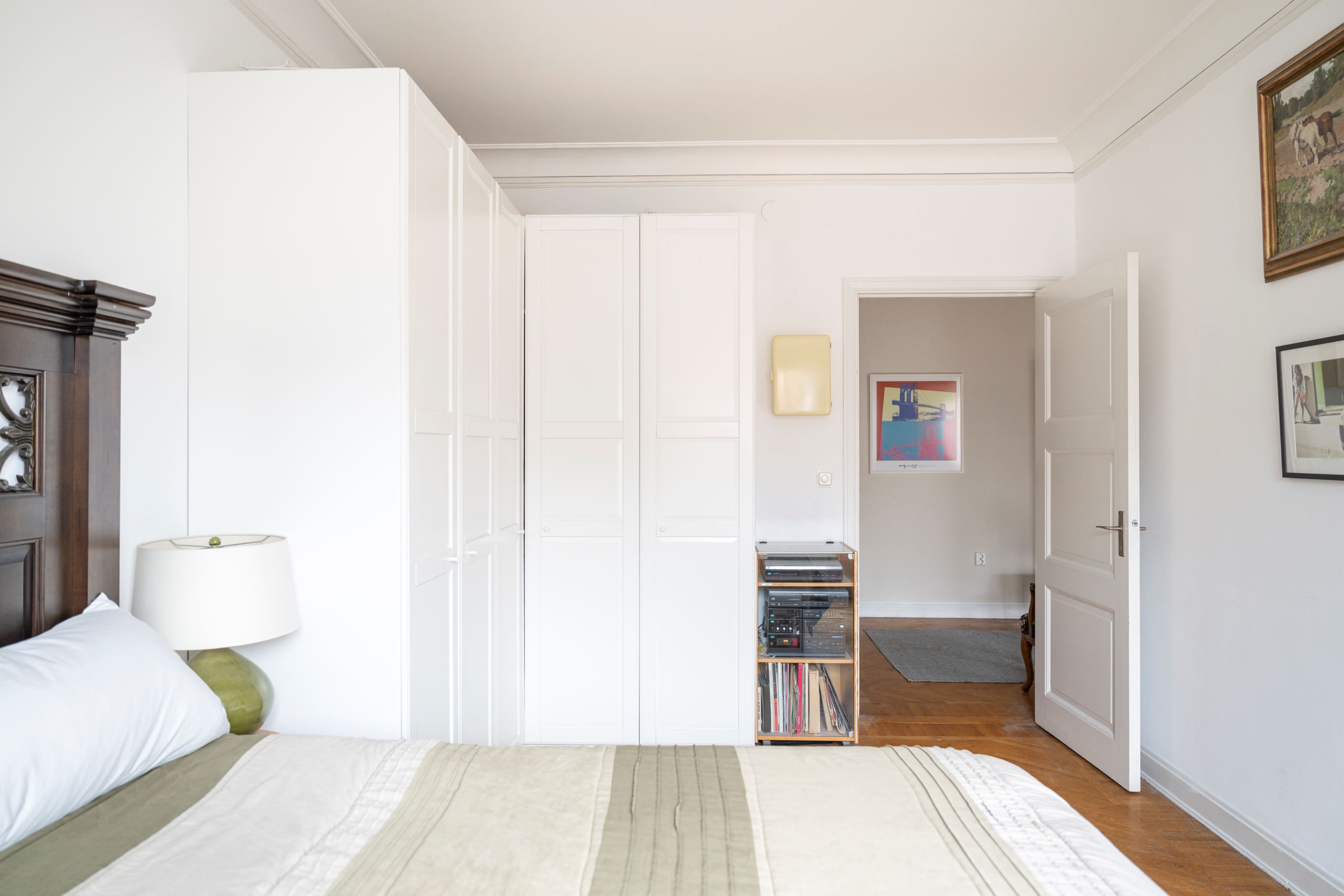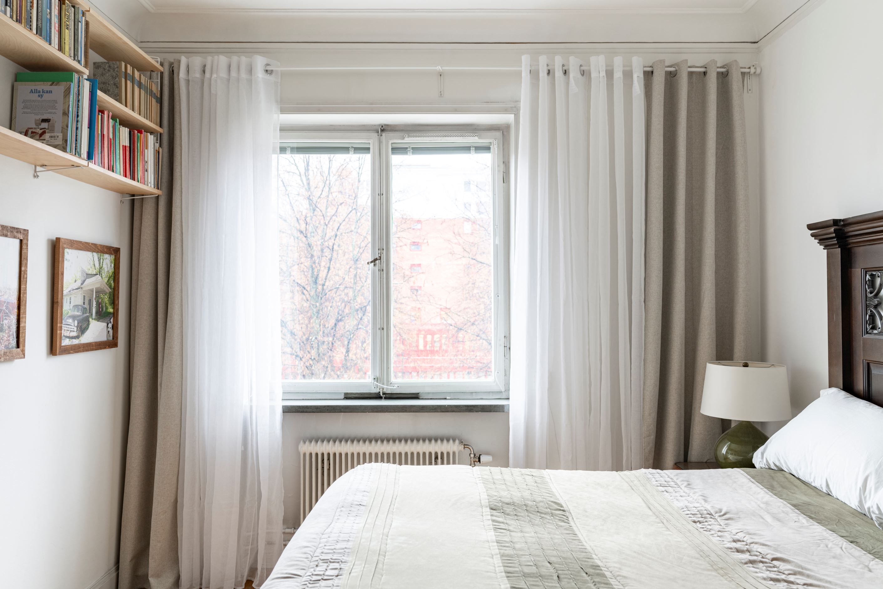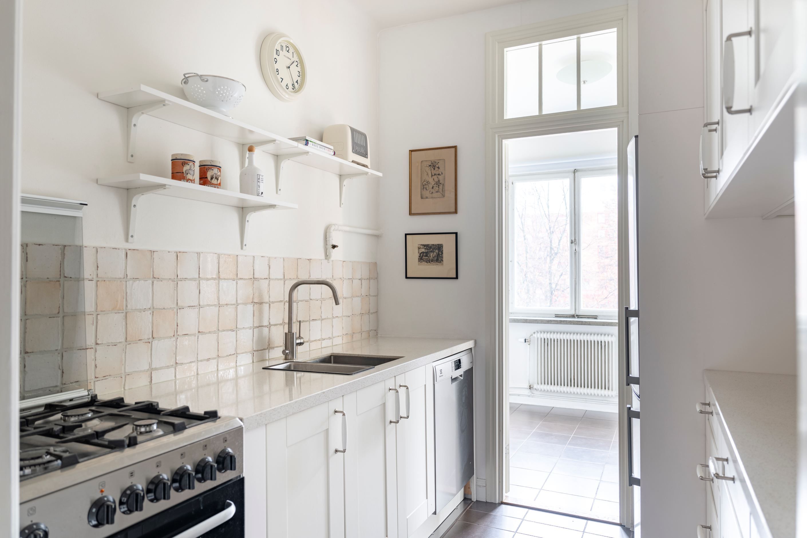 Här möts klassiska detaljer som generös takhöjd och vacker fiskbensparkett med en sober färgsättning och ett stilrent kök. Planlösningen är genomtänkt med rum i fil och en stor, möblerbar hall som med fördel kan användas som arbetsplats.