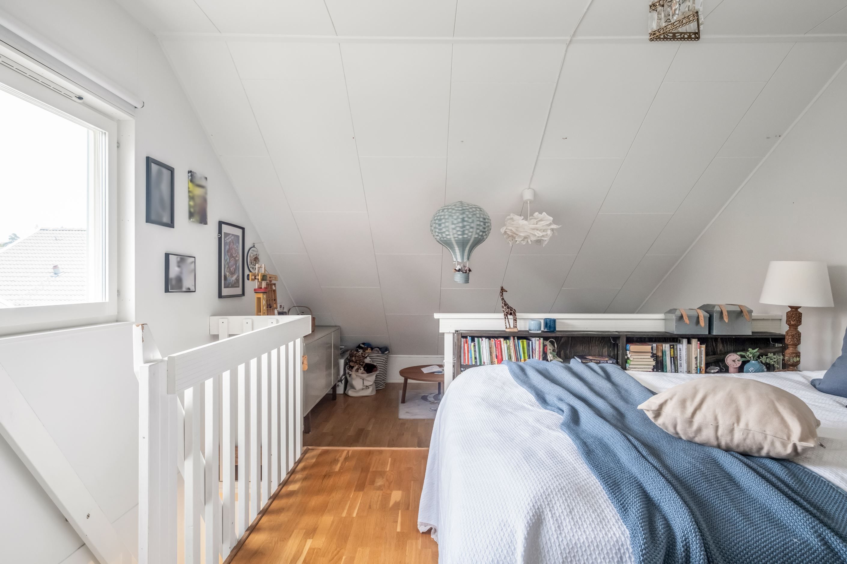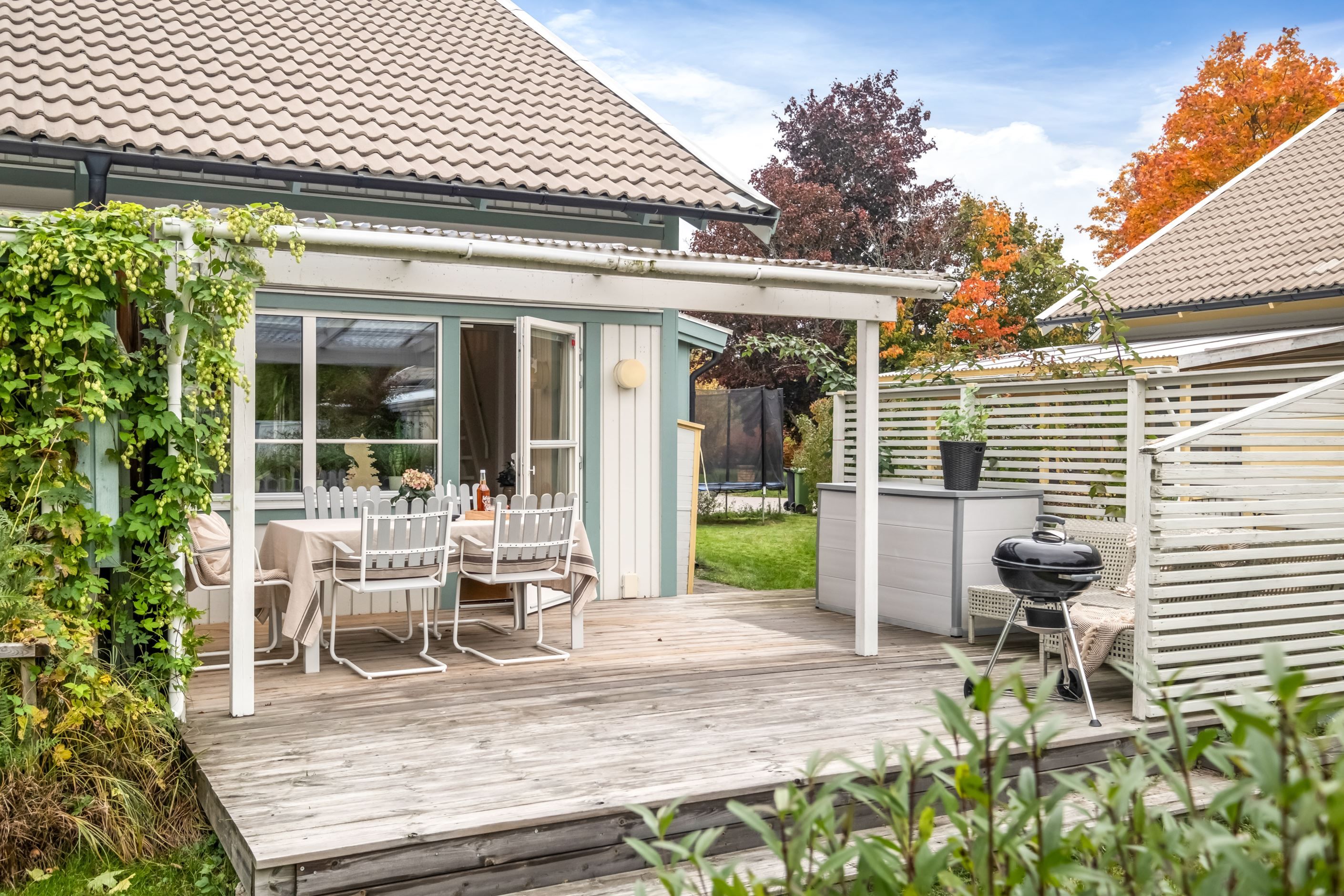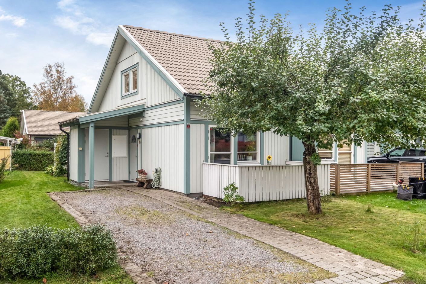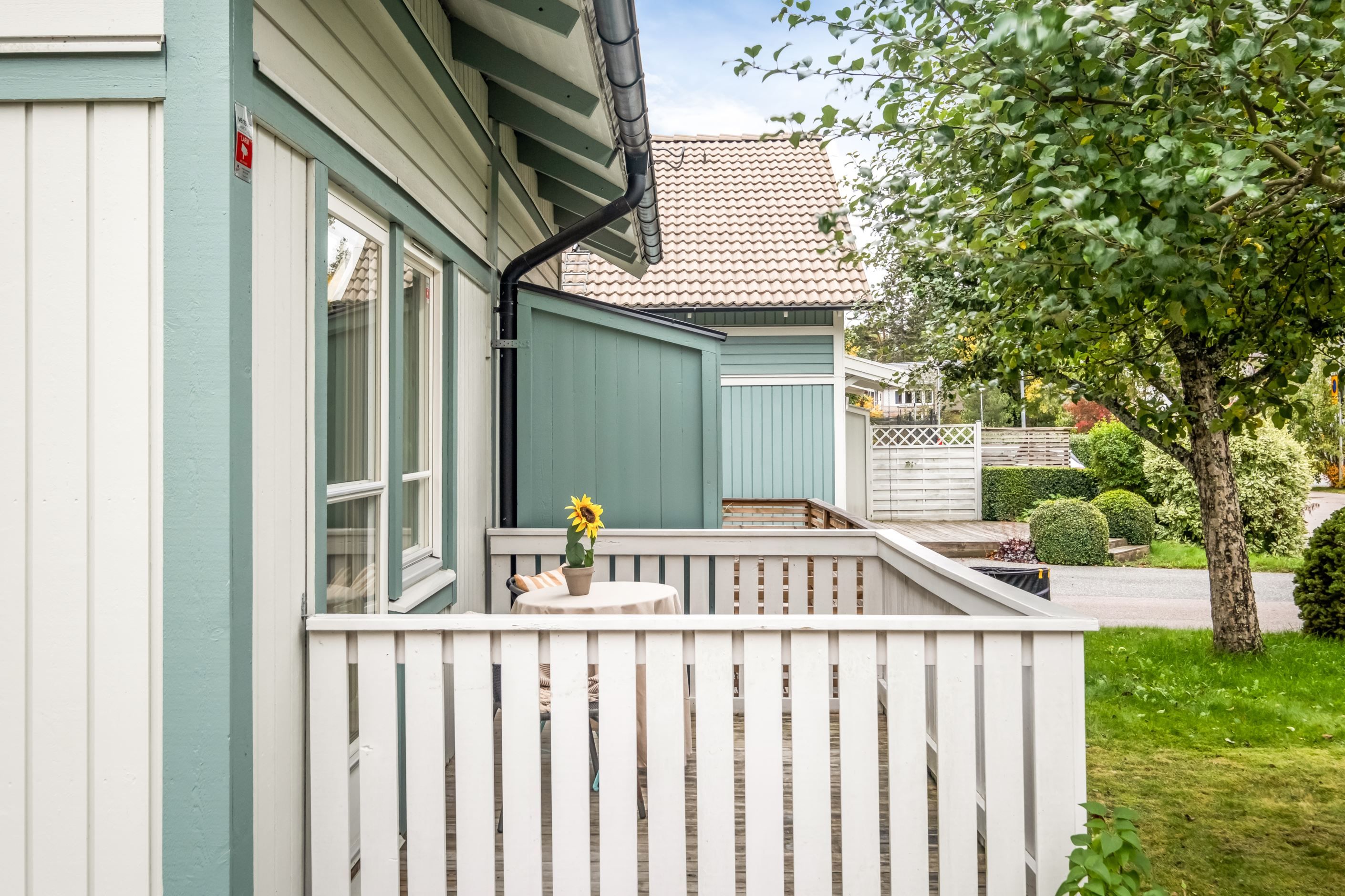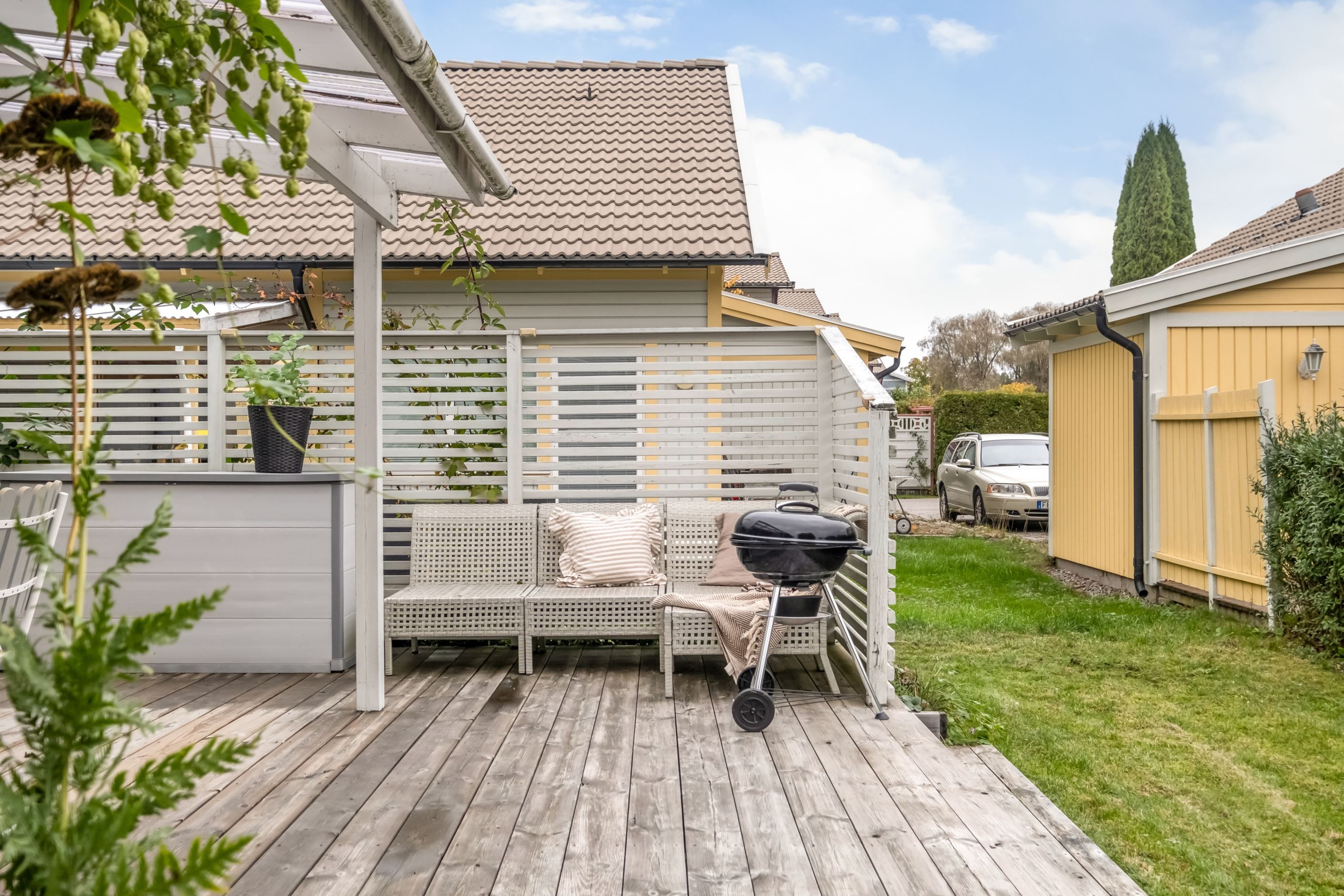 Gräsmattan är perfekt om du har barn, hund eller gröna odlingsfingrar. Invändigt erbjuds ett stort vardagsrum i öppen planlösning med matplatsen, ett stort badrum, ett separat kök samt 1-2 sovrum på loftet. Gott om förvaring finns i förråd på tomten. På framsidan finns en altan med sol större delar av dagen.