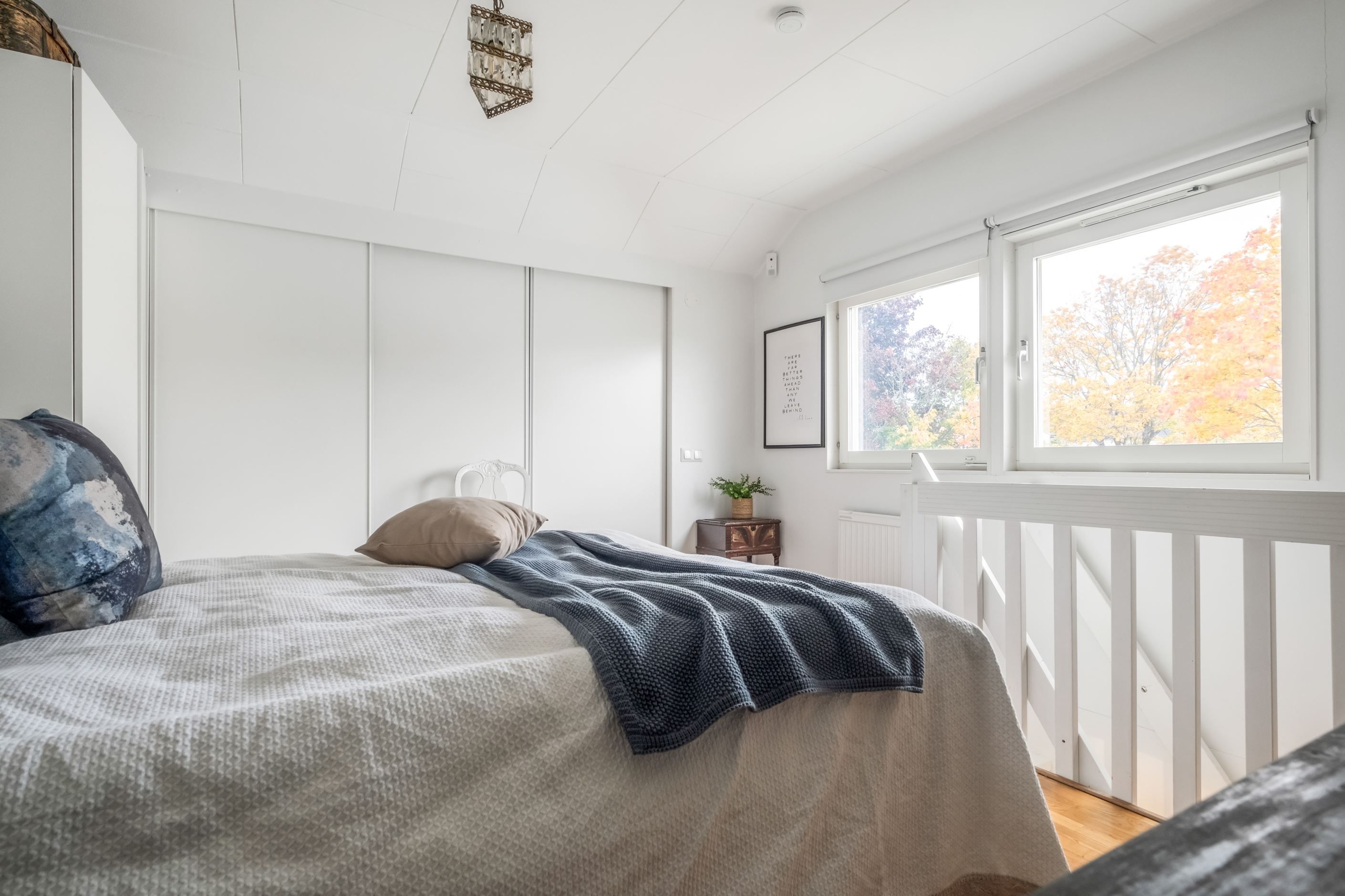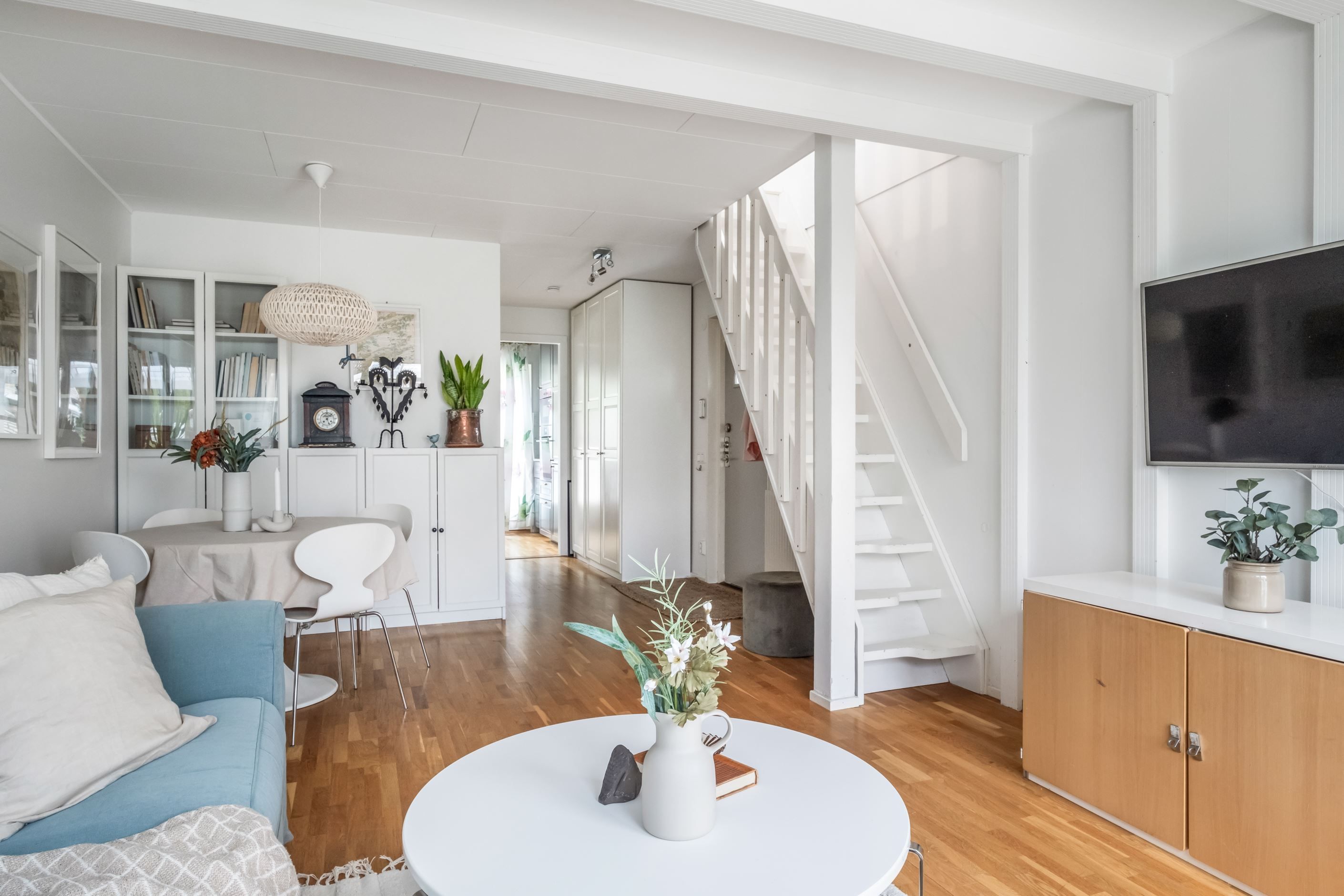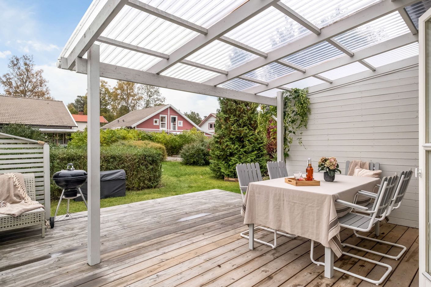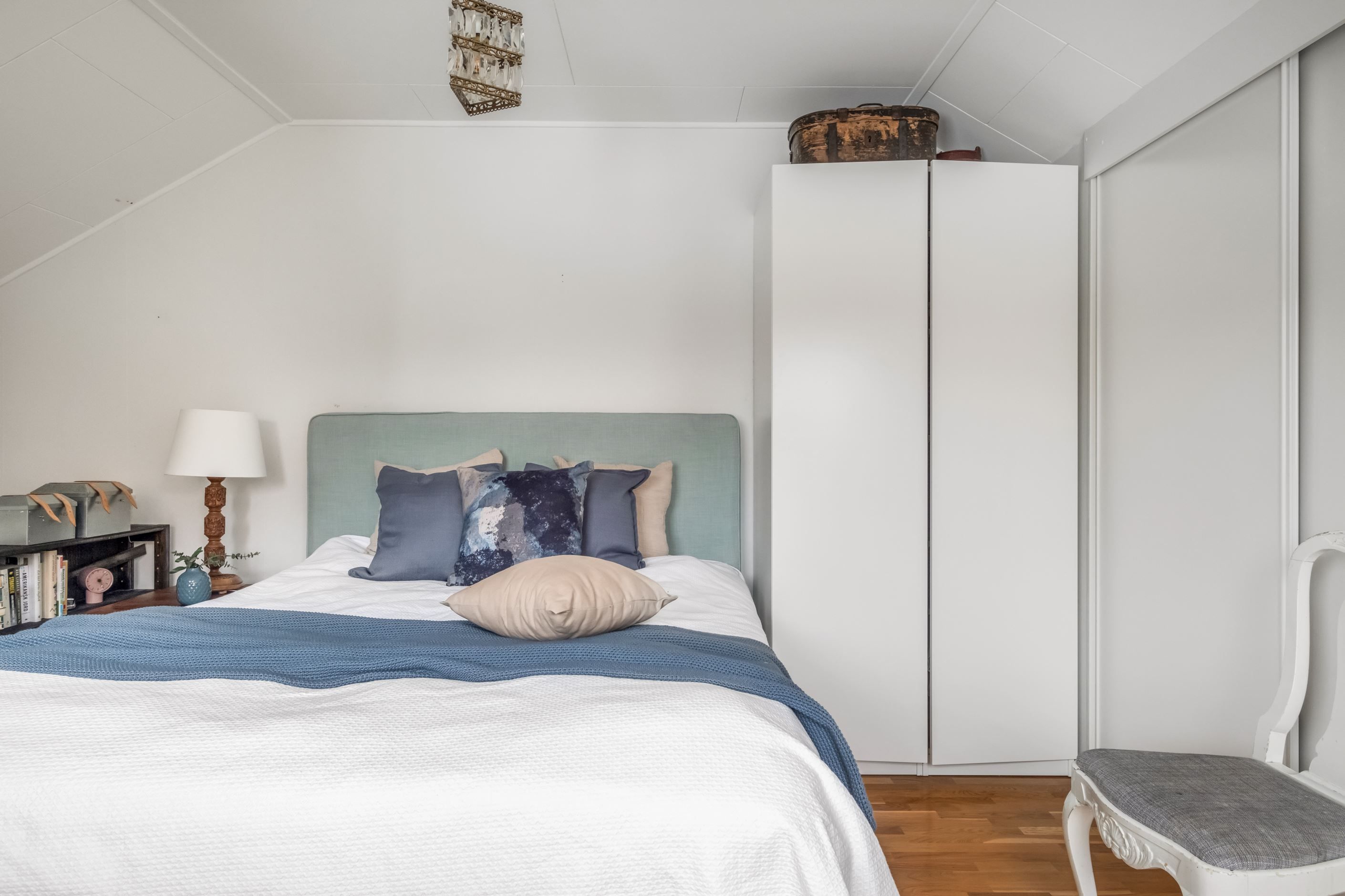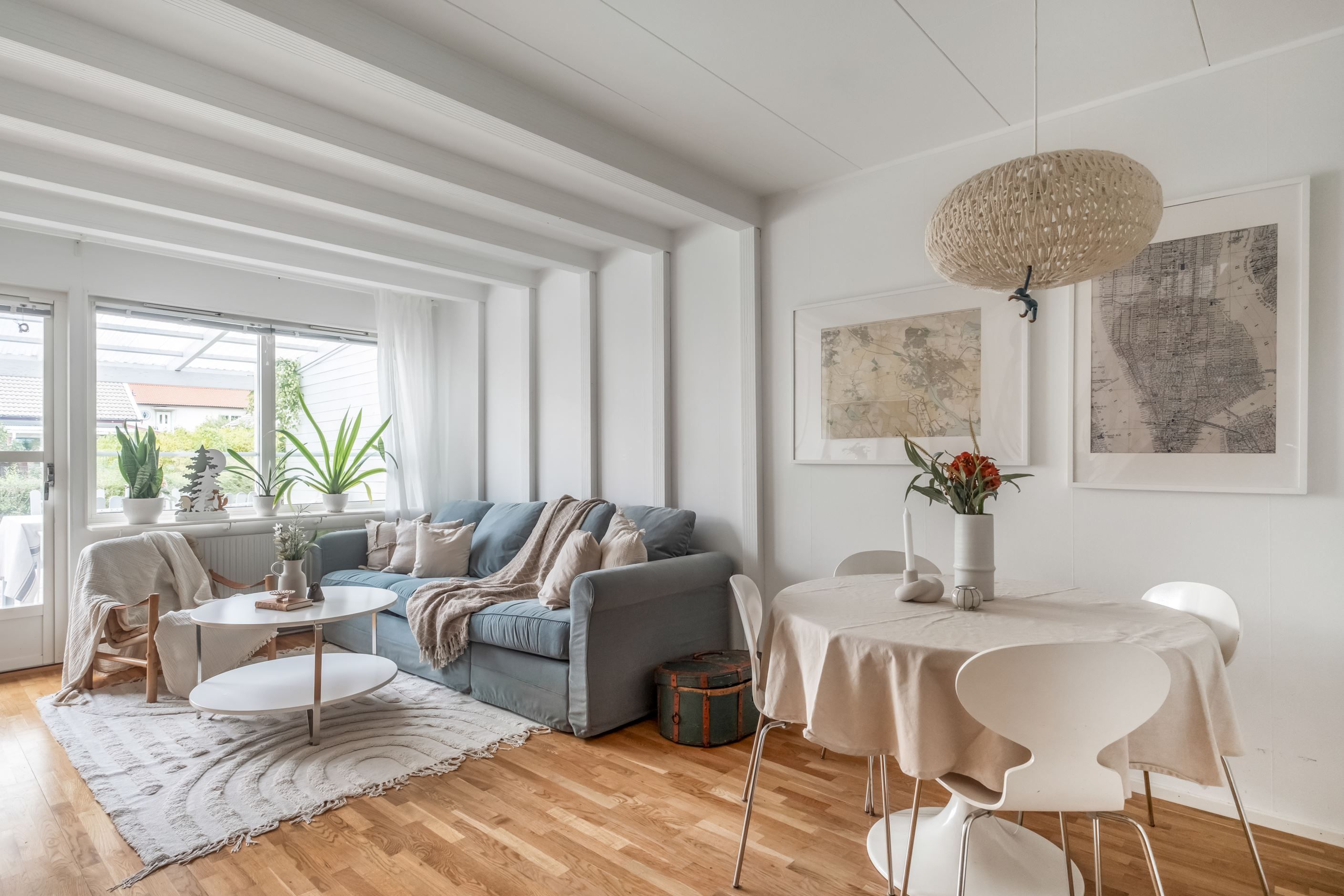 Gräsmattan är perfekt om du har barn, hund eller gröna odlingsfingrar. Invändigt erbjuds ett stort vardagsrum i öppen planlösning med matplatsen, ett stort badrum, ett separat kök samt 1-2 sovrum på loftet. Gott om förvaring finns i förråd på tomten. På framsidan finns en altan med sol större delar av dagen.