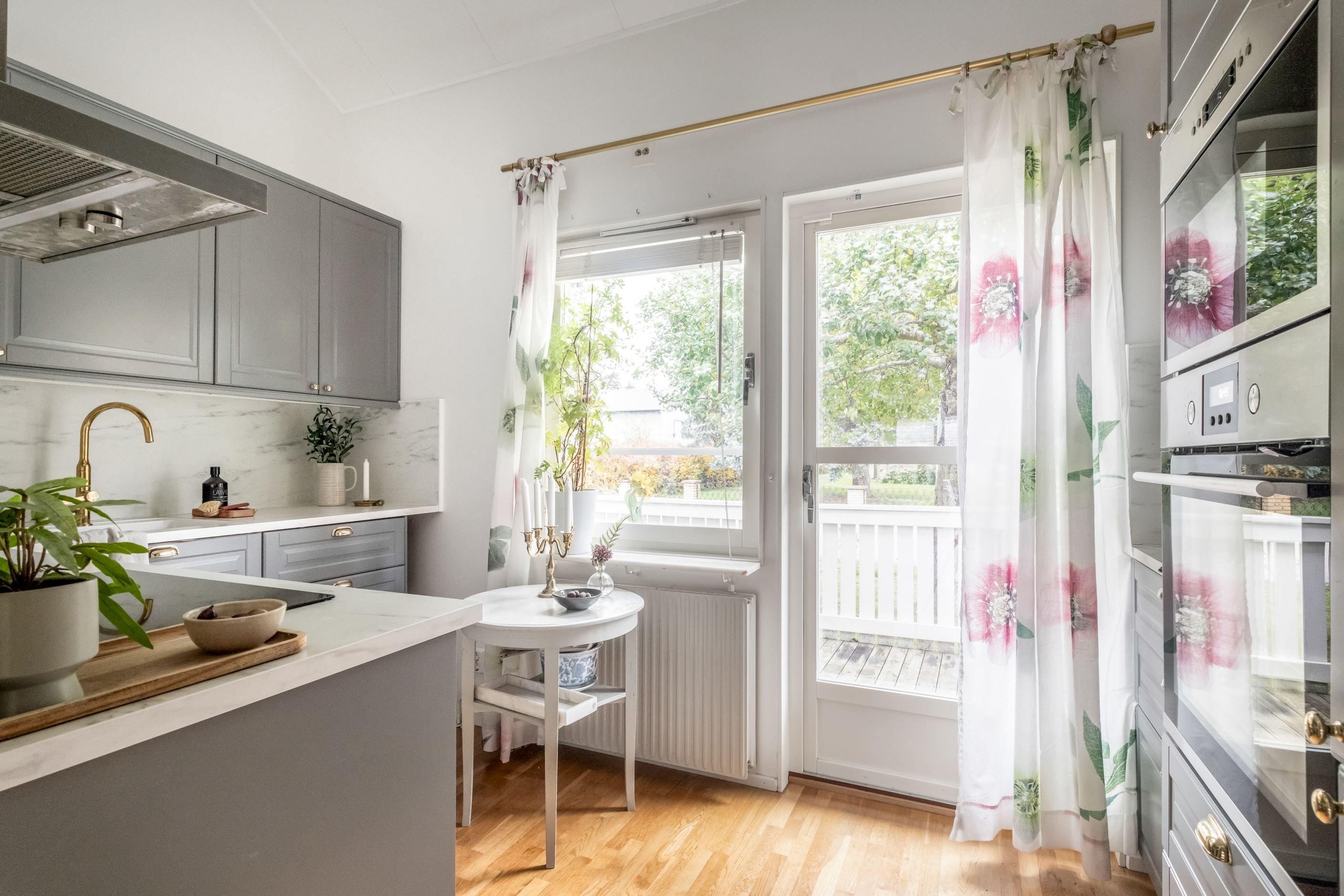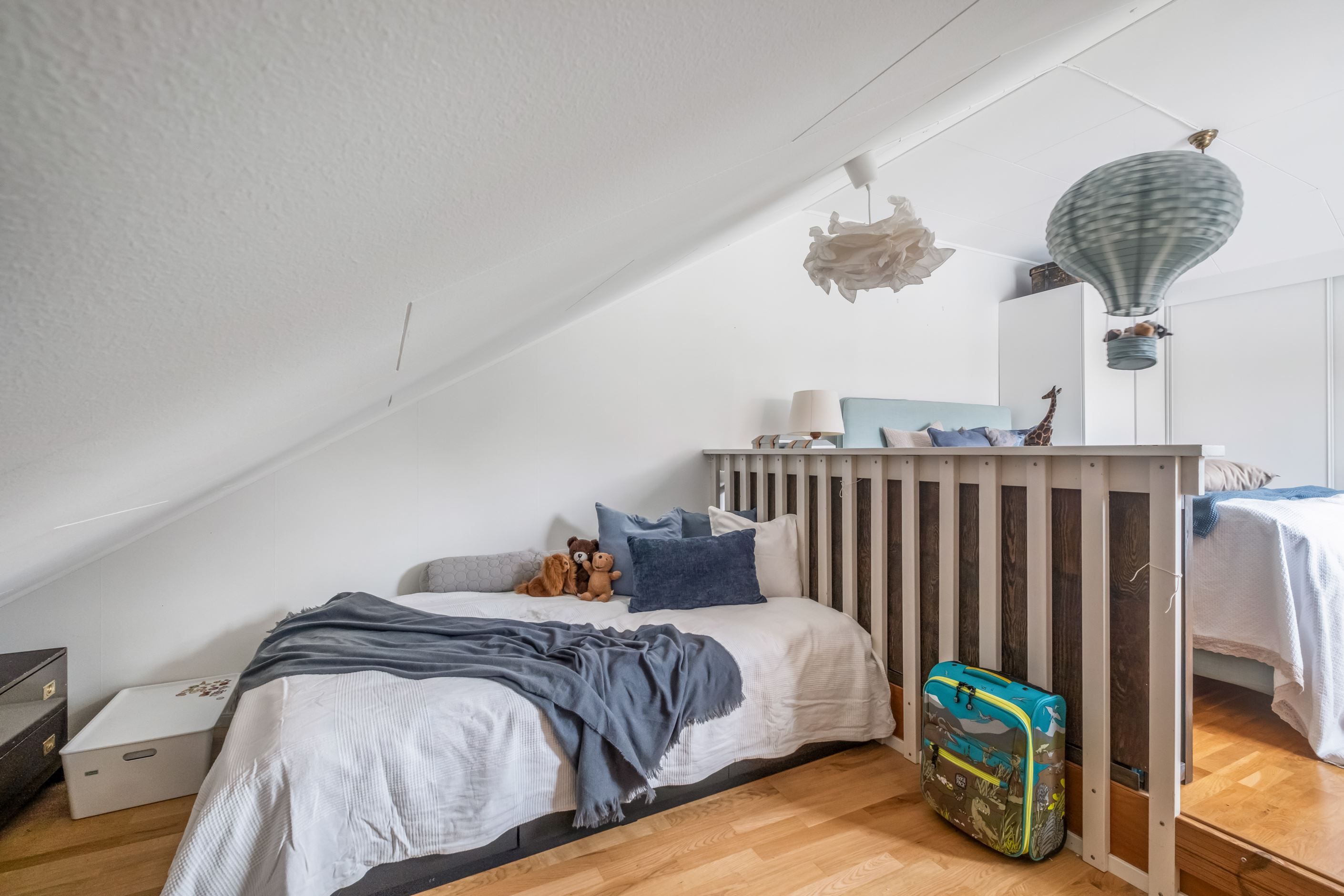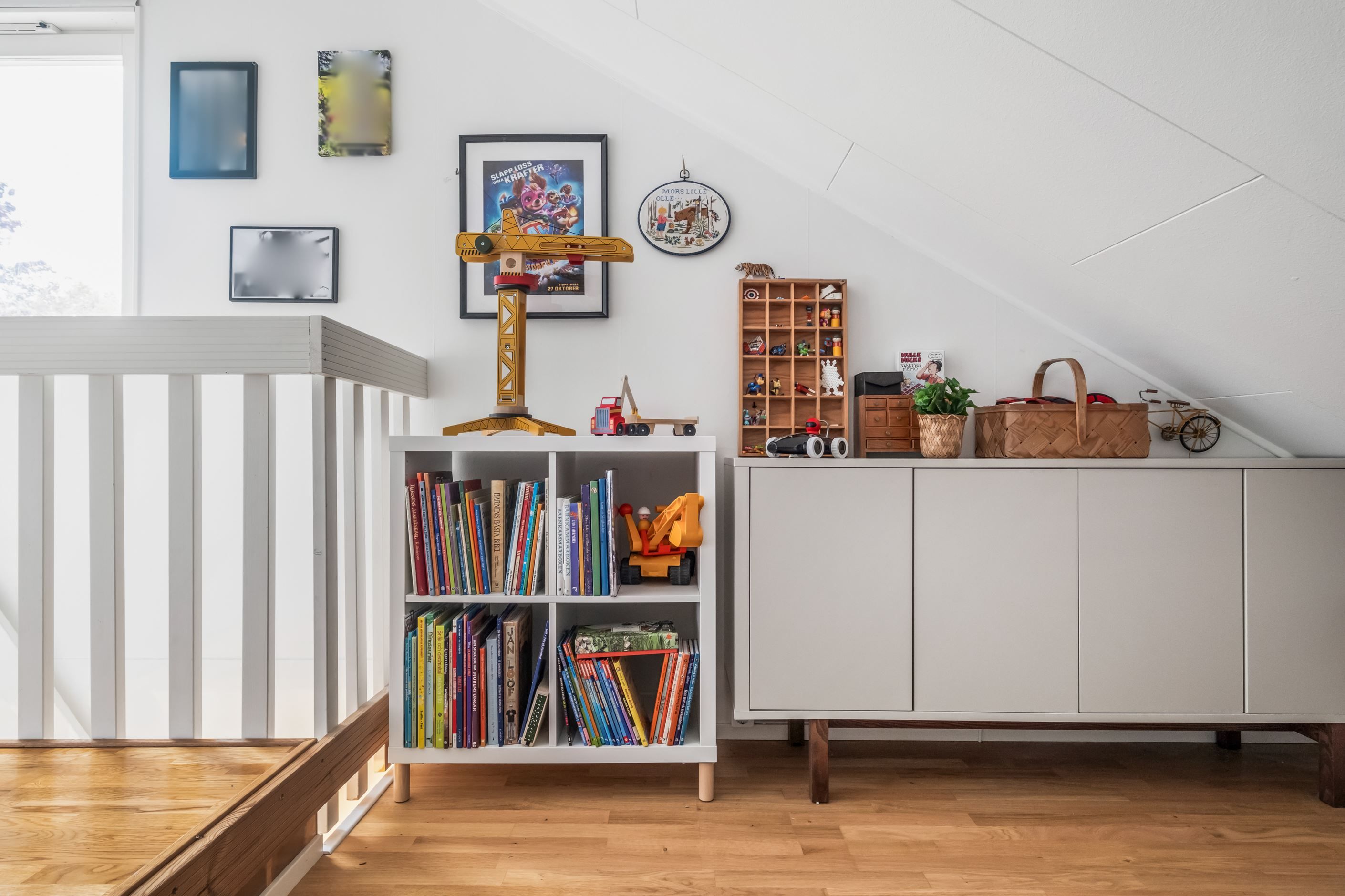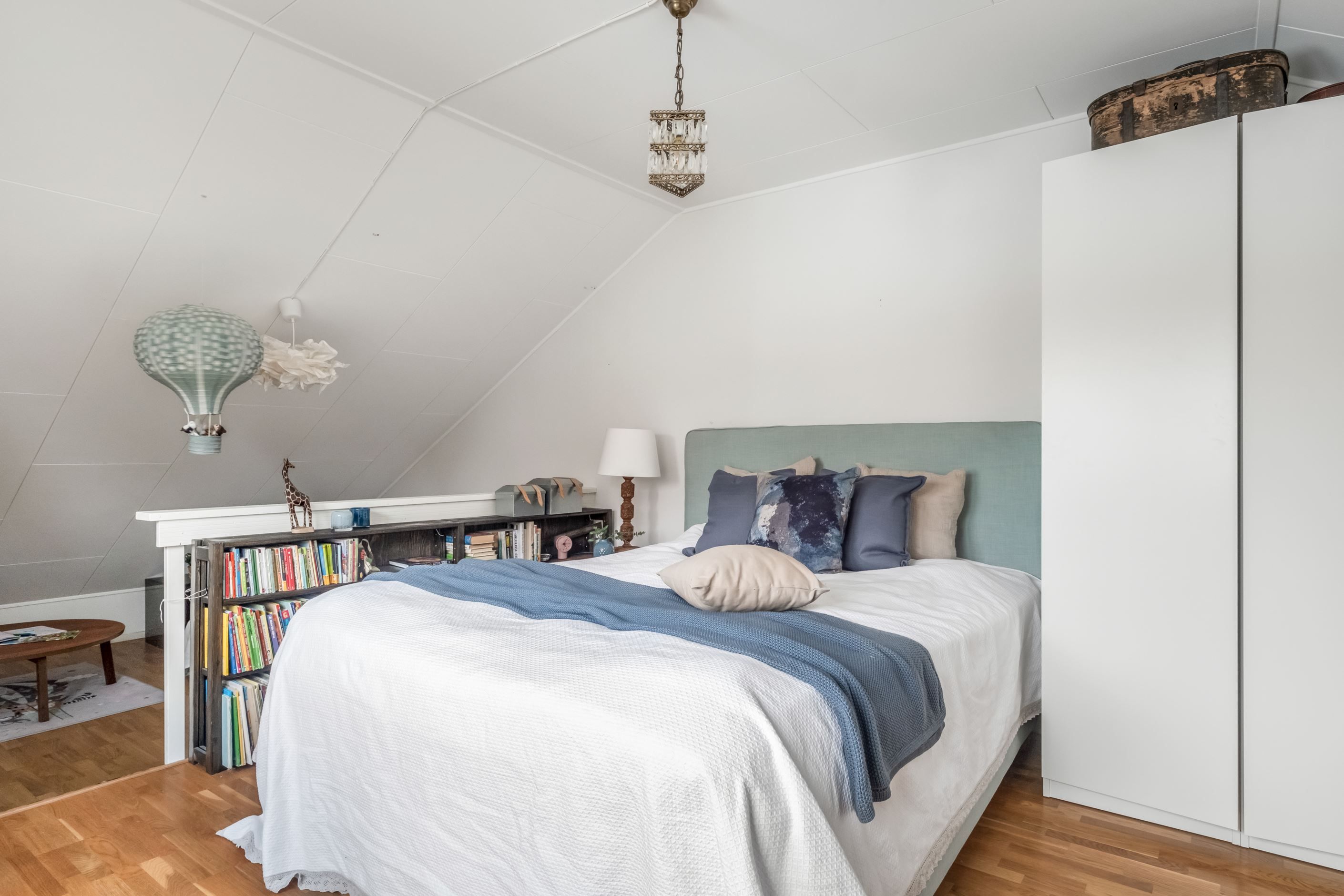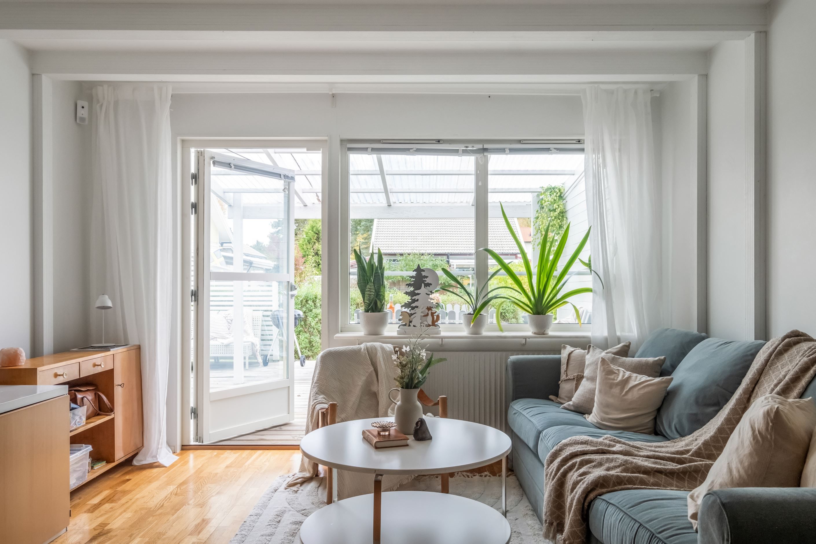 Gräsmattan är perfekt om du har barn, hund eller gröna odlingsfingrar. Invändigt erbjuds ett stort vardagsrum i öppen planlösning med matplatsen, ett stort badrum, ett separat kök samt 1-2 sovrum på loftet. Gott om förvaring finns i förråd på tomten. På framsidan finns en altan med sol större delar av dagen.