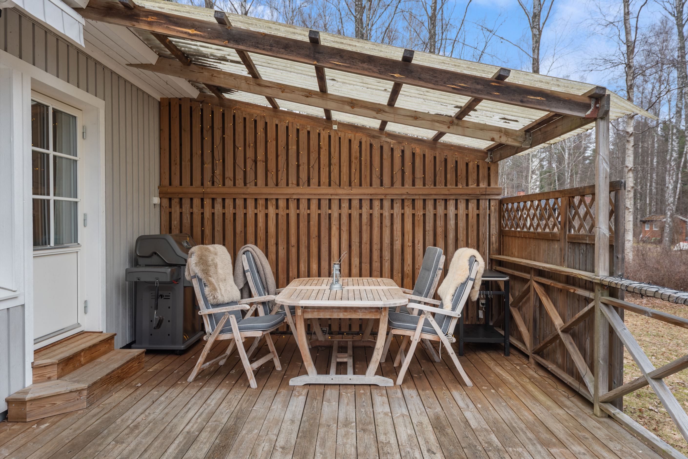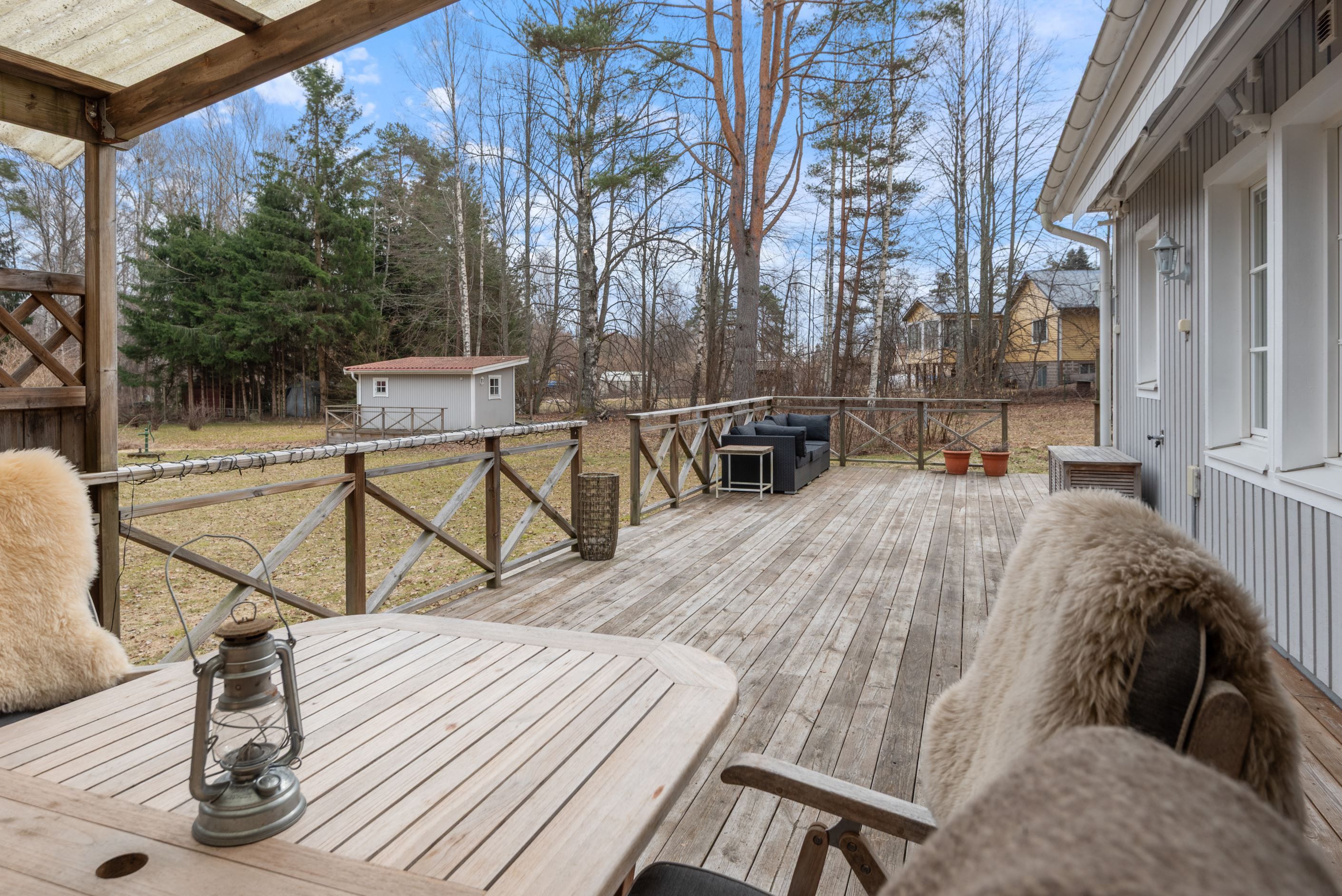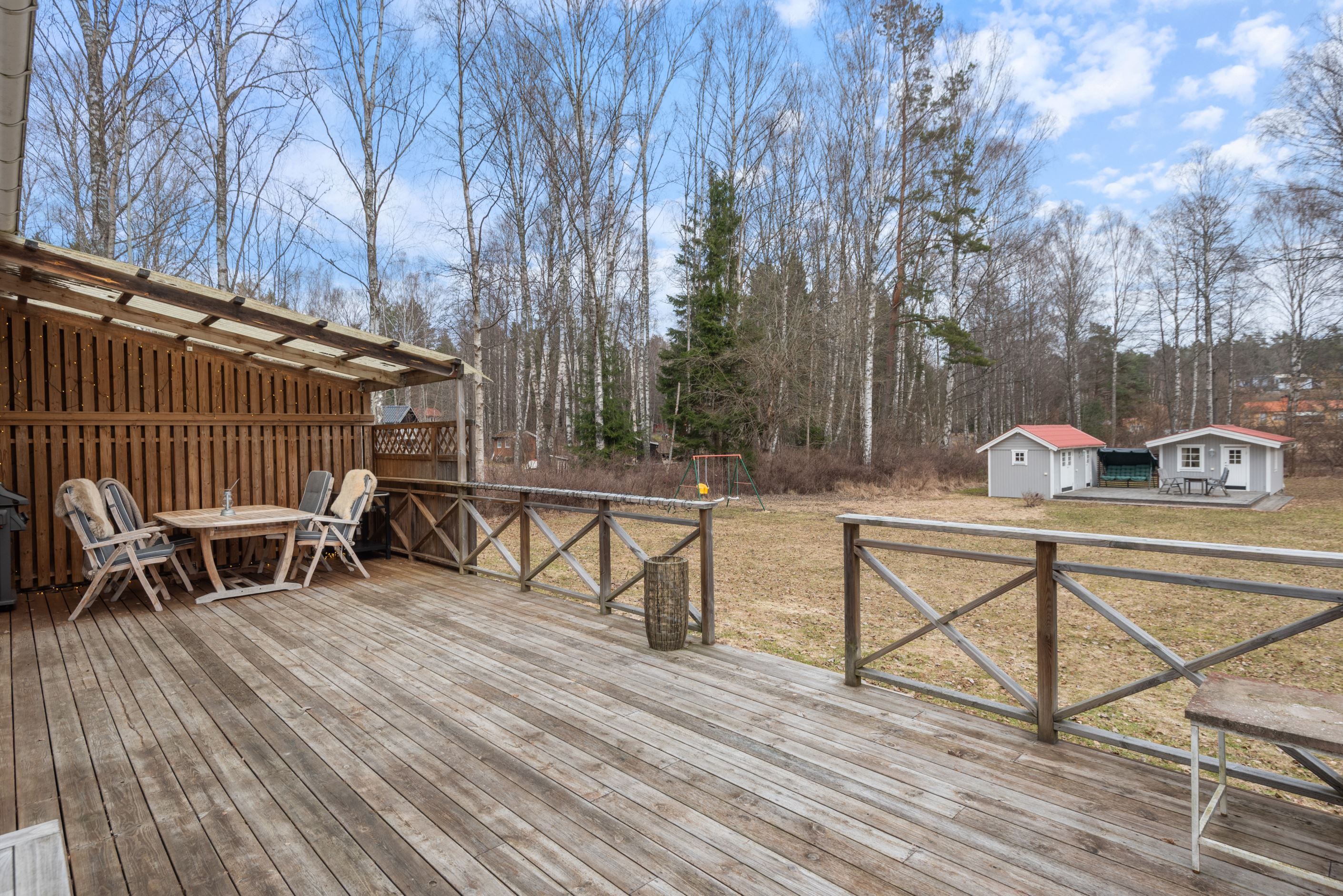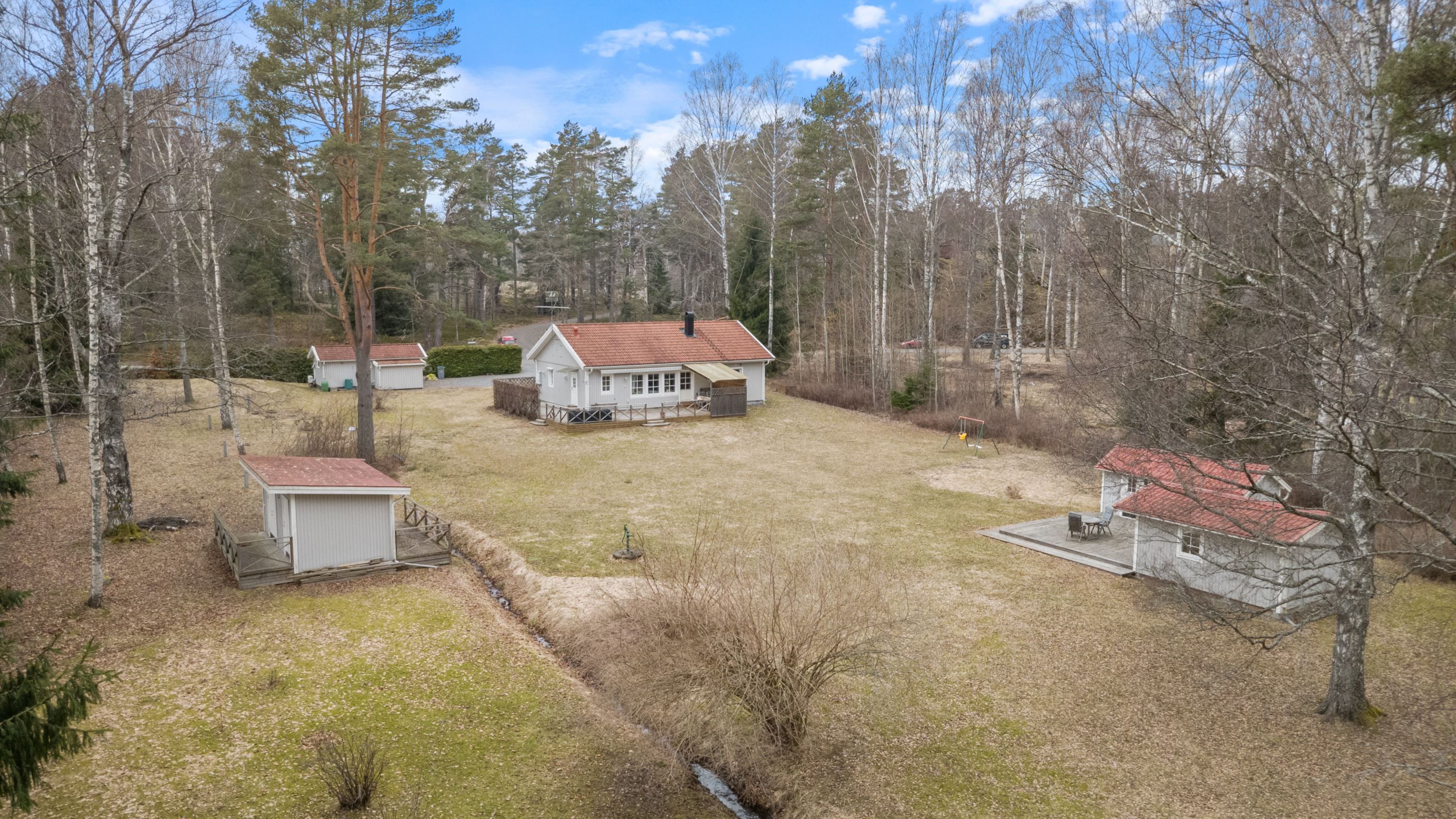 Tomten är plan till ytan och lättskött med inslag av hallonbuskar och vinbär. Huvudhuset om 103 kvm erbjuder en öppen och social planlösning med generösa sällskapsytor, påkostade materialval, goda förvaringsmöjligheter och en stämningsfull braskamin. Från huset nås en härlig altan som löper runt den östra och södra sidan och bjuder in till sol hela dagen. På tomten finns även ett isolerat gästhus med indragen el om cirka 25 kvm, två stycken förråd samt garage.