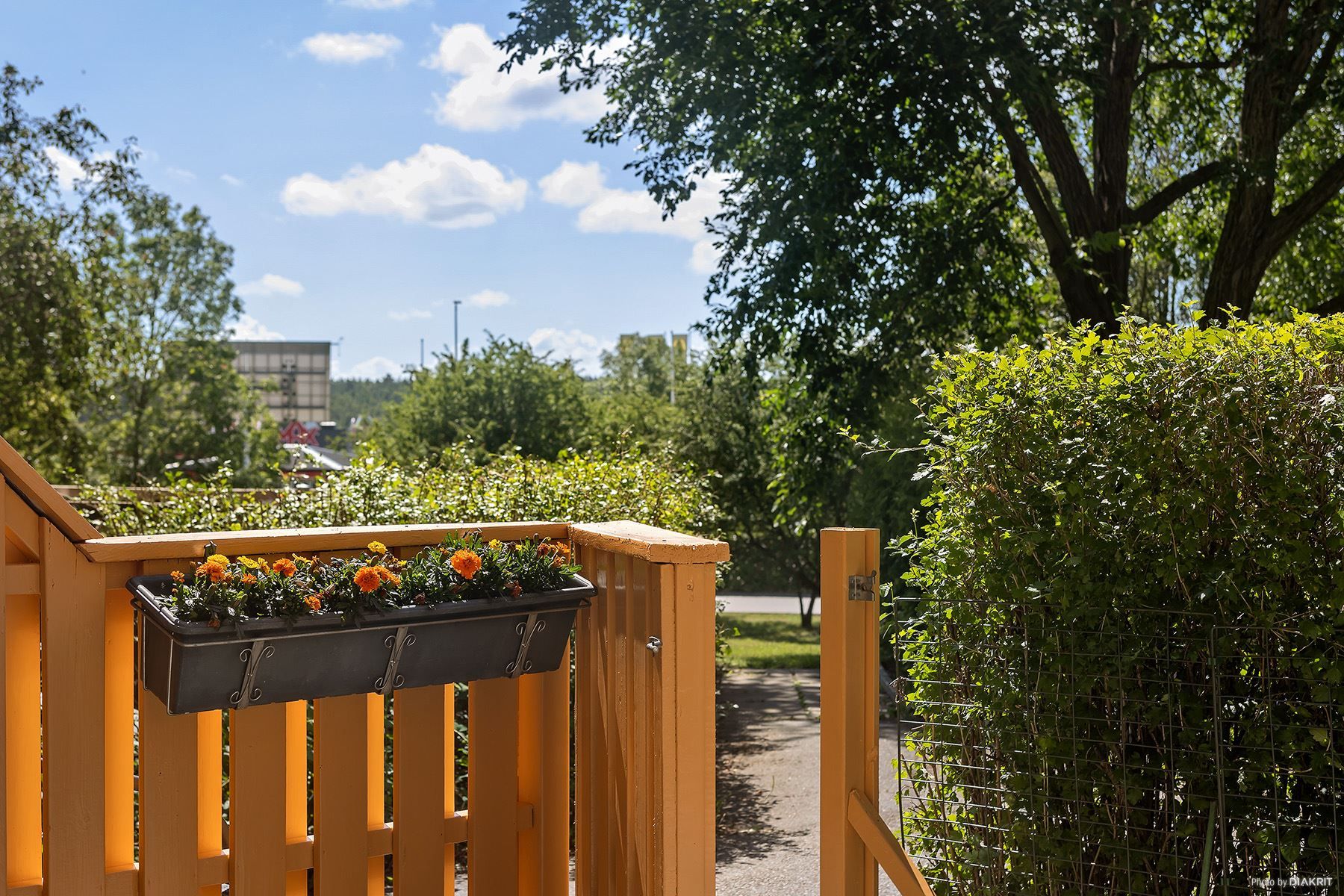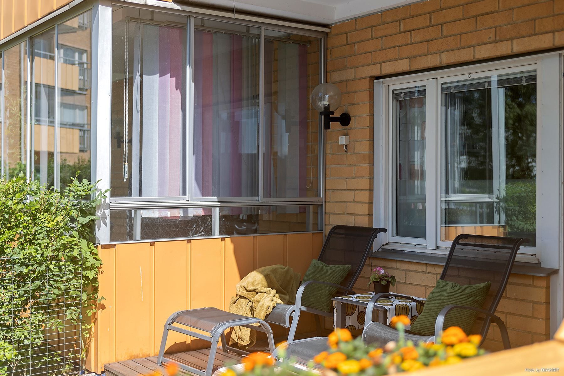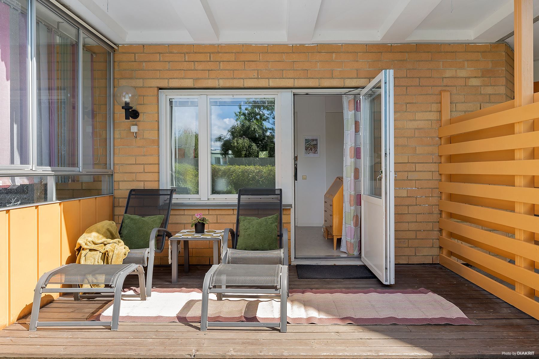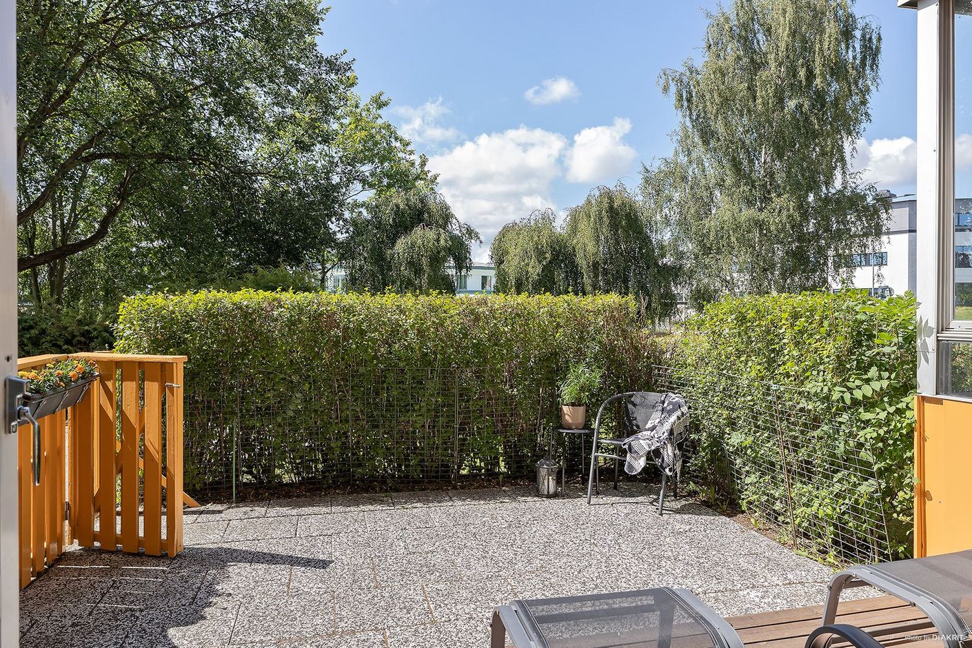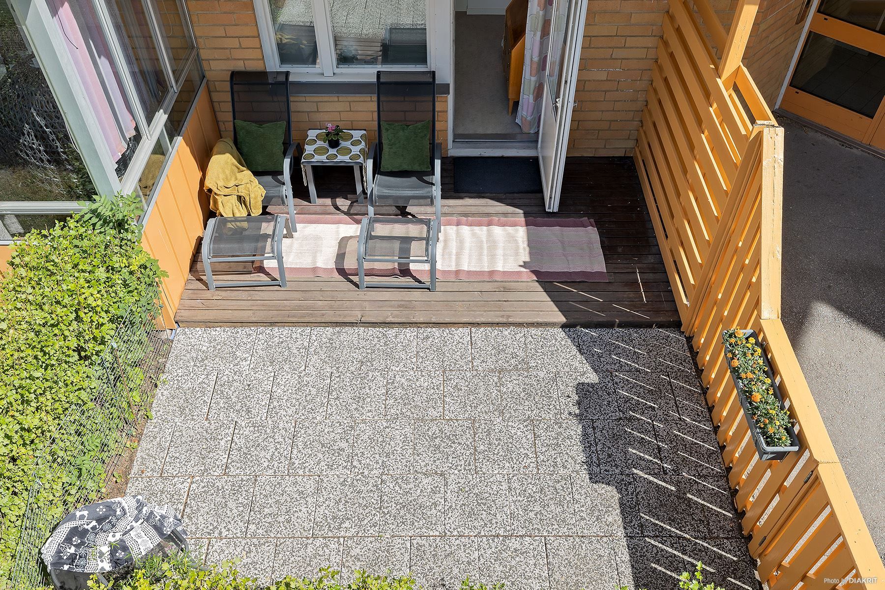 Stor 1:a om hela 55 kvm där nuvarande ägare använder ett av dom stora förråden i bostaden som sovrum. Den stora uteplatsen har gott om plats för olika typer av möblemang efter behov, här finns gott om plats att njuta av en lugnt stund eller ett socialt liv med familj och vänner.
