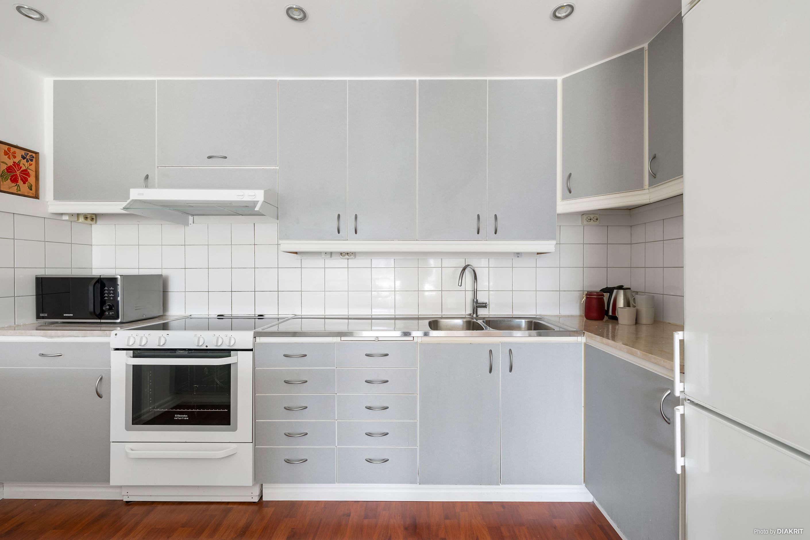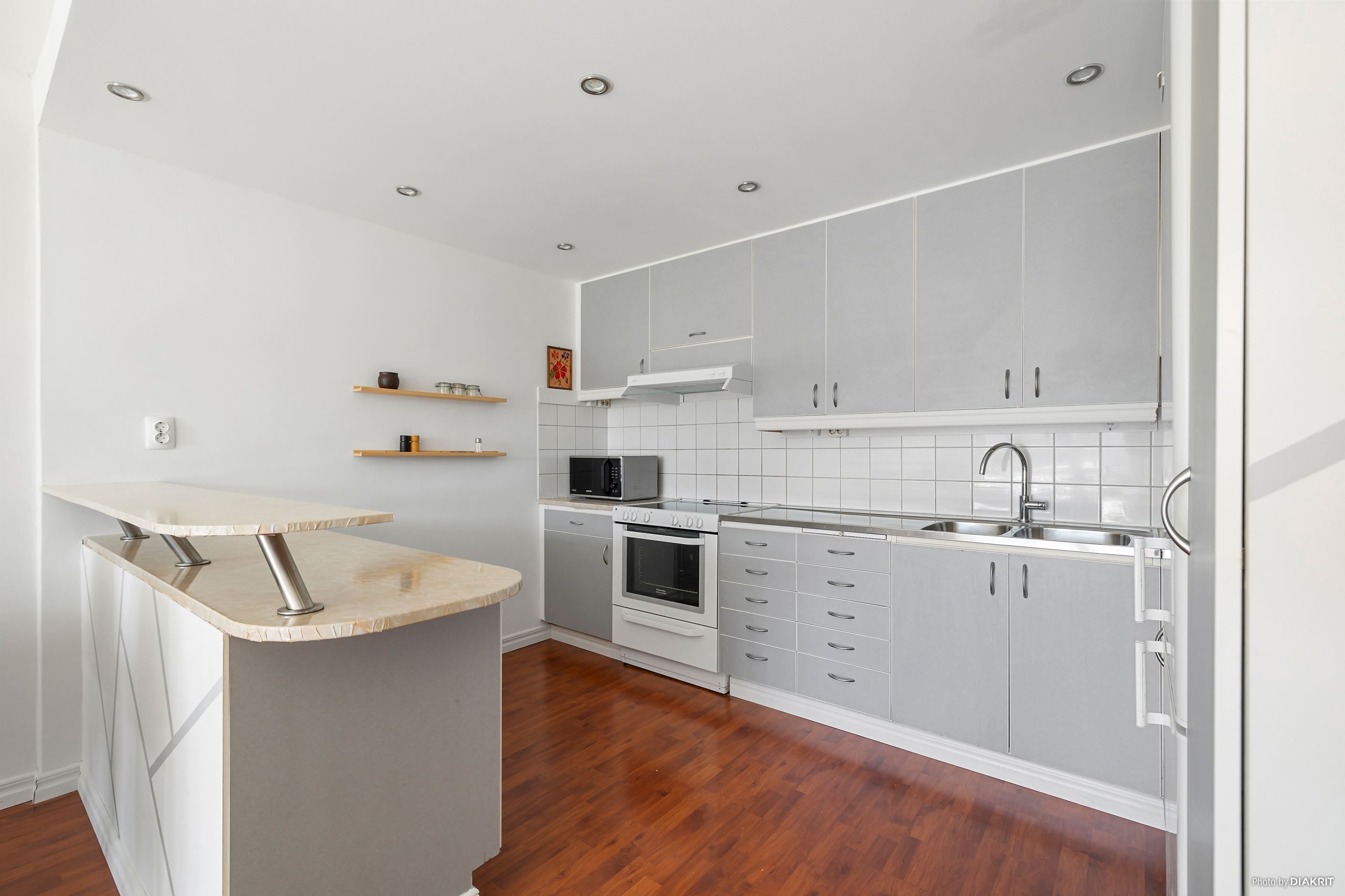 Bostaden erbjuder en tydlig och funktionell disposition där kök och vardagsrum samspelar i en öppen och social del av hemmet. Här skapas en naturlig plats för både umgänge och avkoppling, med gott om utrymme för såväl soffgrupp som matplats. Köket är stilrent och praktiskt utformat, med spotlights som ger en modern känsla och bra arbetsljus.