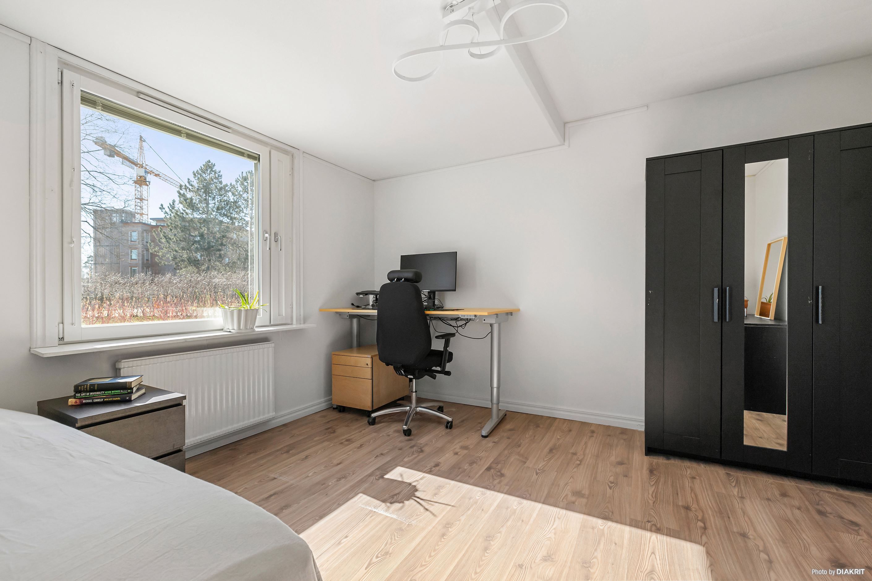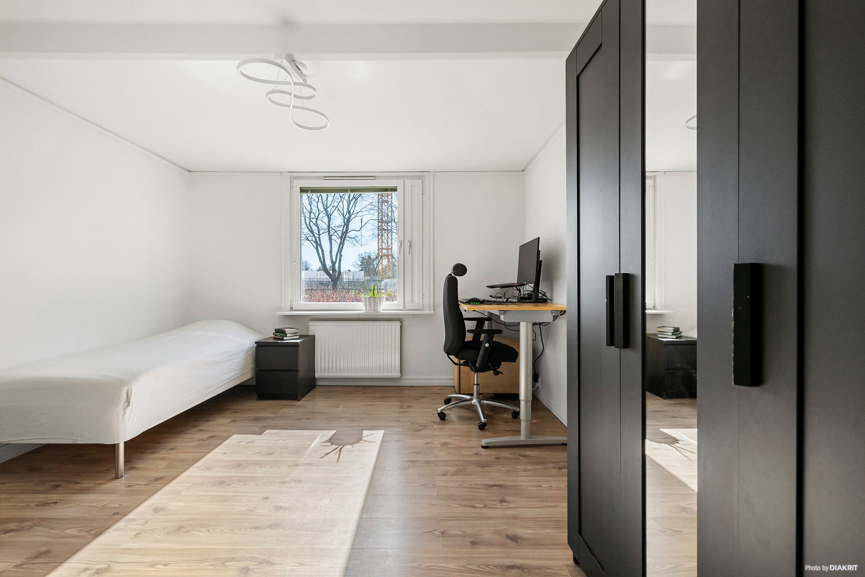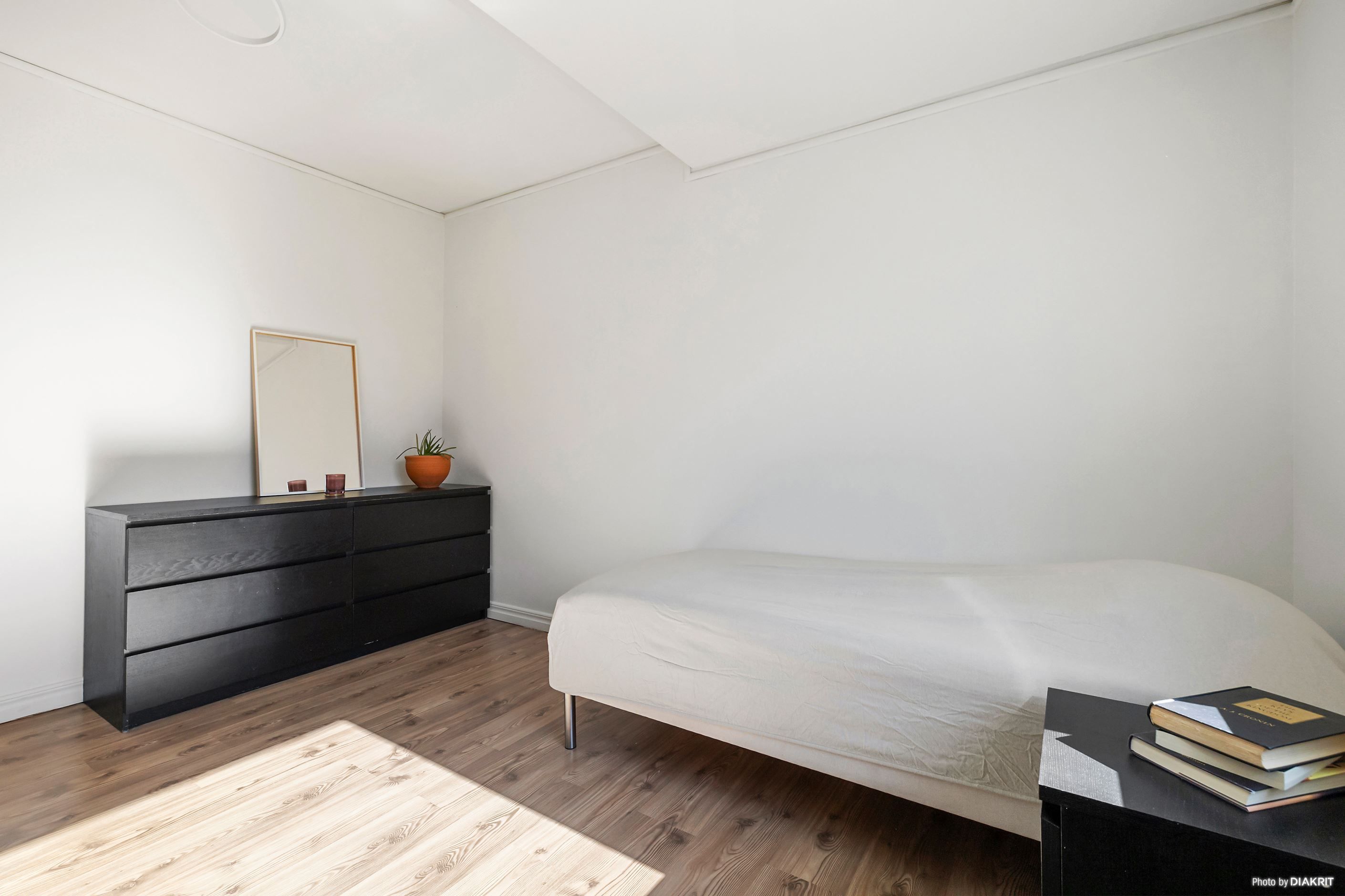 Sovrummet är rofyllt beläget och erbjuder plats för dubbelsäng samt förvaring, vilket gör det till en lugn och avskild del av bostaden. Planlösningen skapar en fin balans mellan sociala ytor och privata utrymmen.