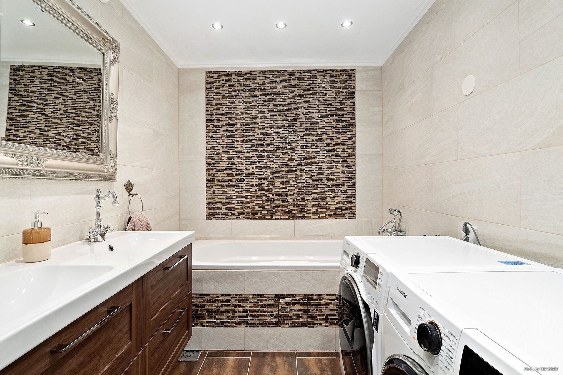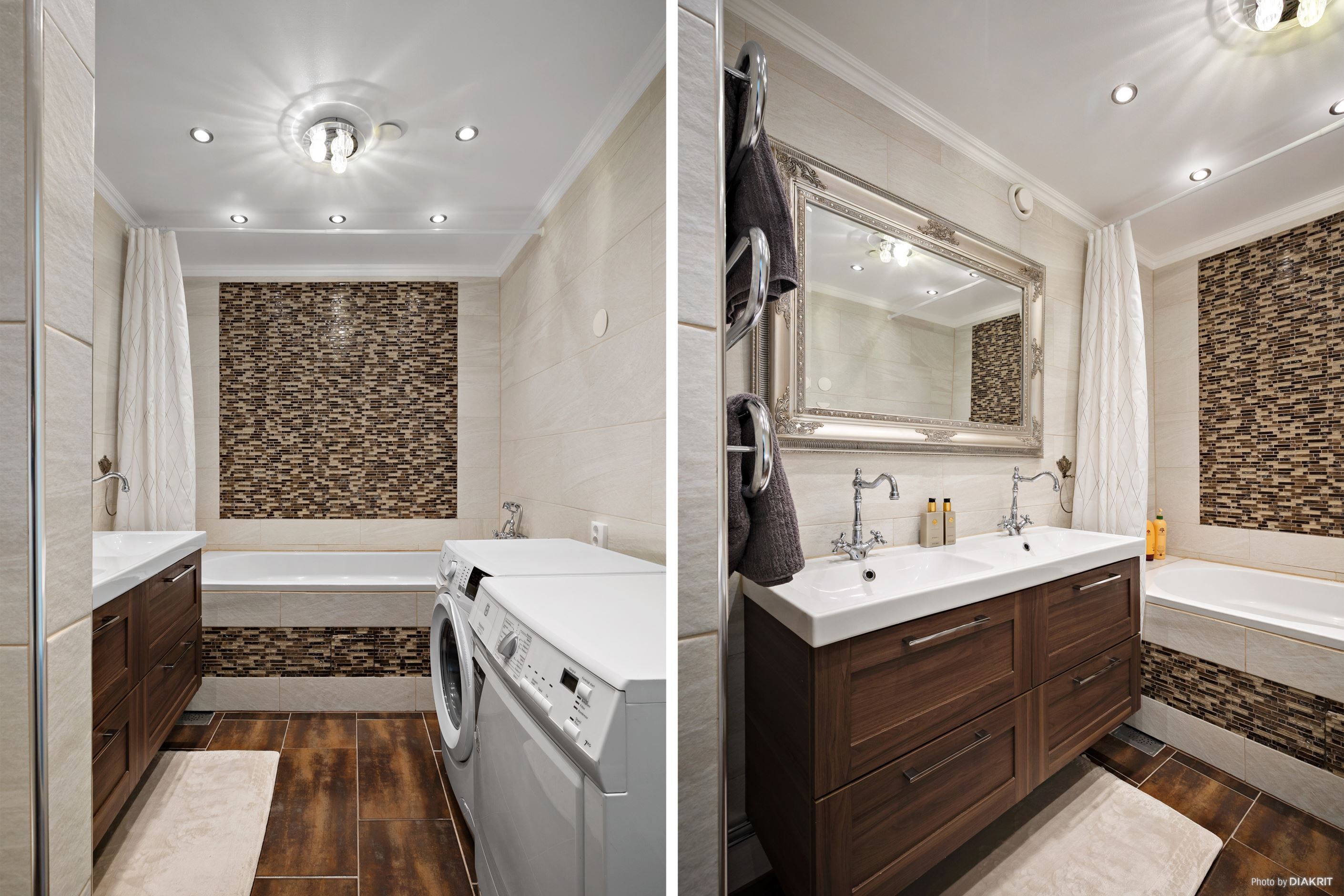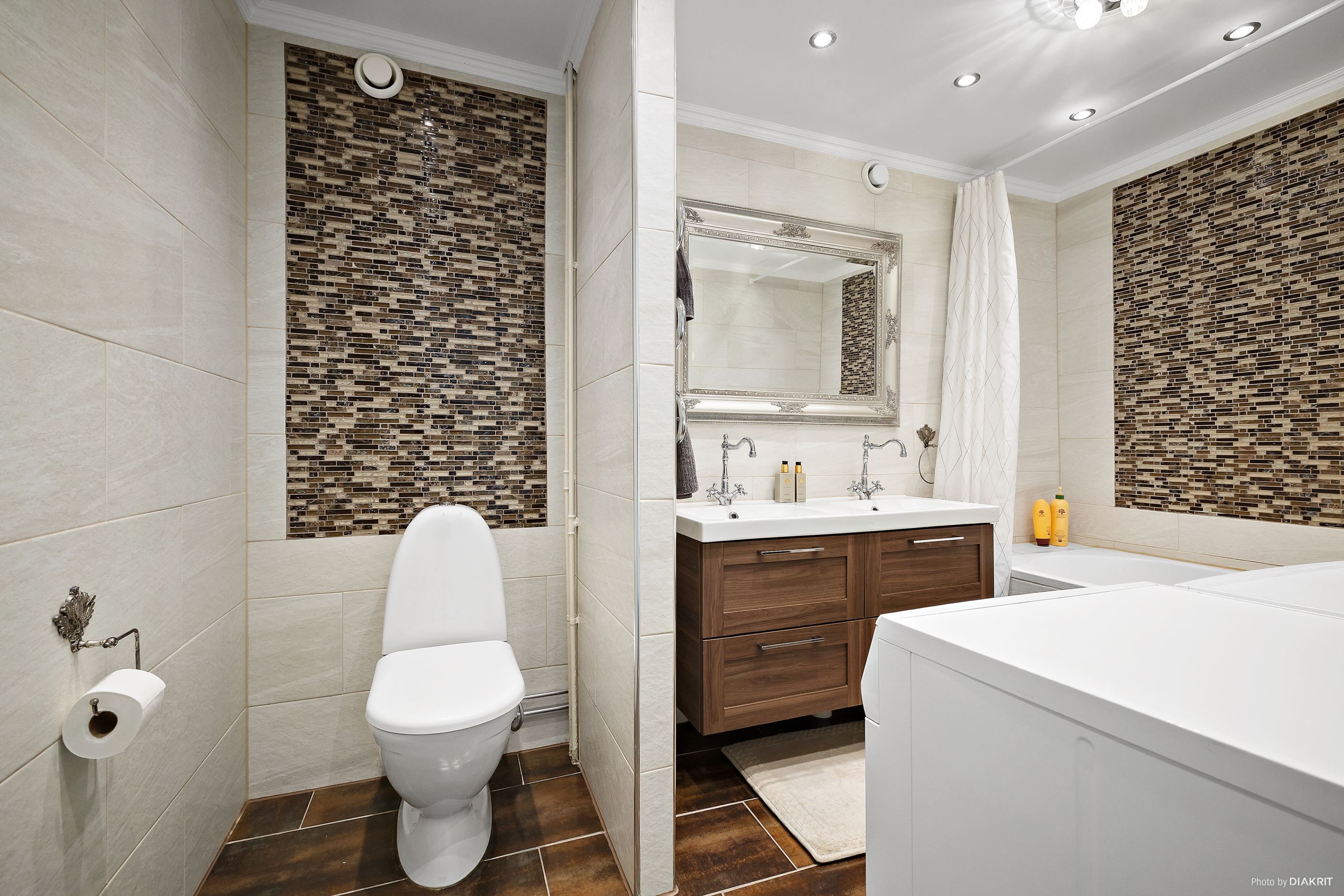 Det helkaklade badrummet från 2017 håller en hög standard och är utrustat med klinkergolv, dubbla handfat, spotlights med dimmer samt både tvättmaskin, torktumlare och wc – en kombination av komfort och funktion.