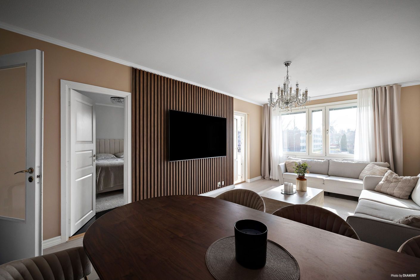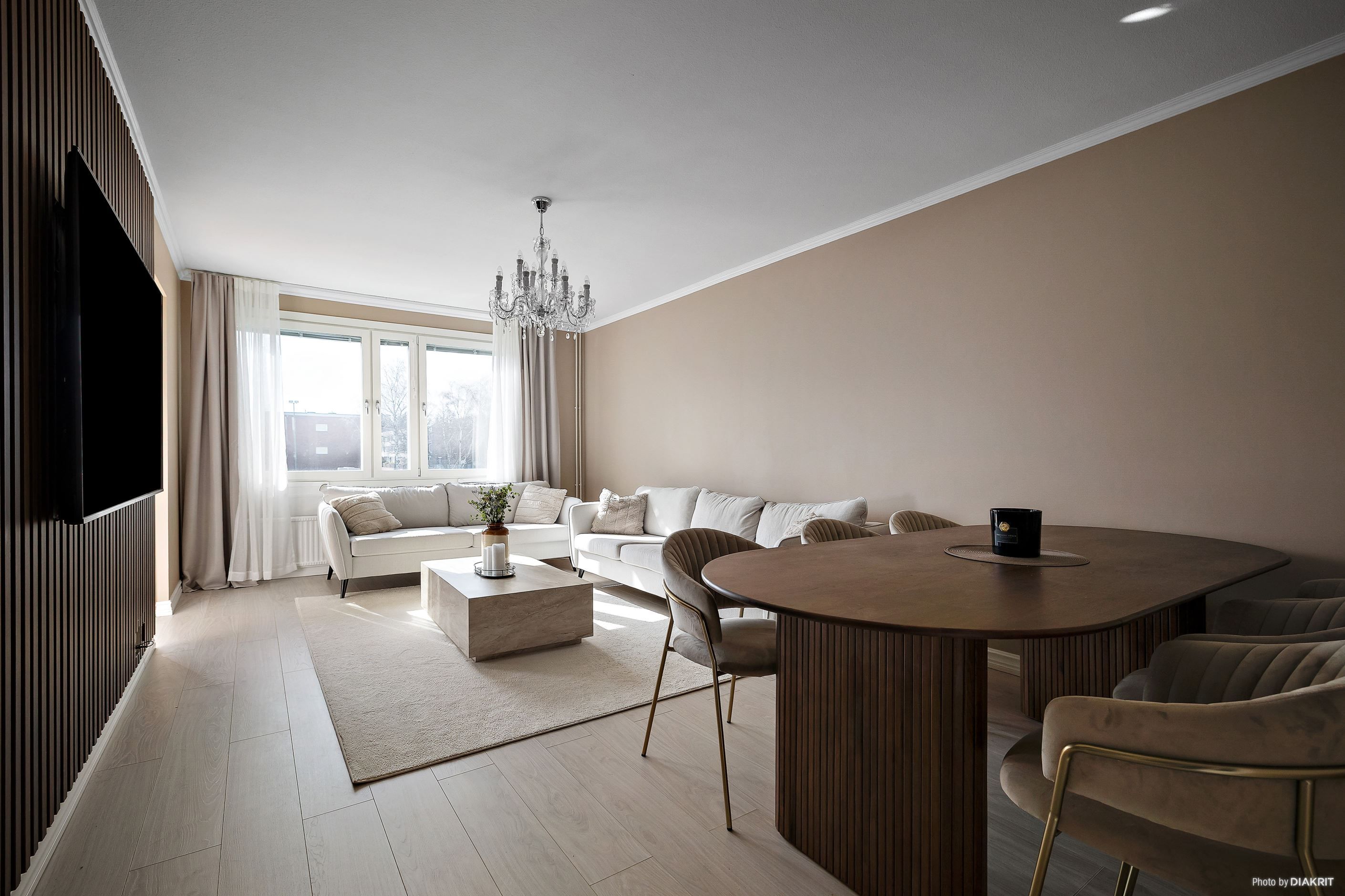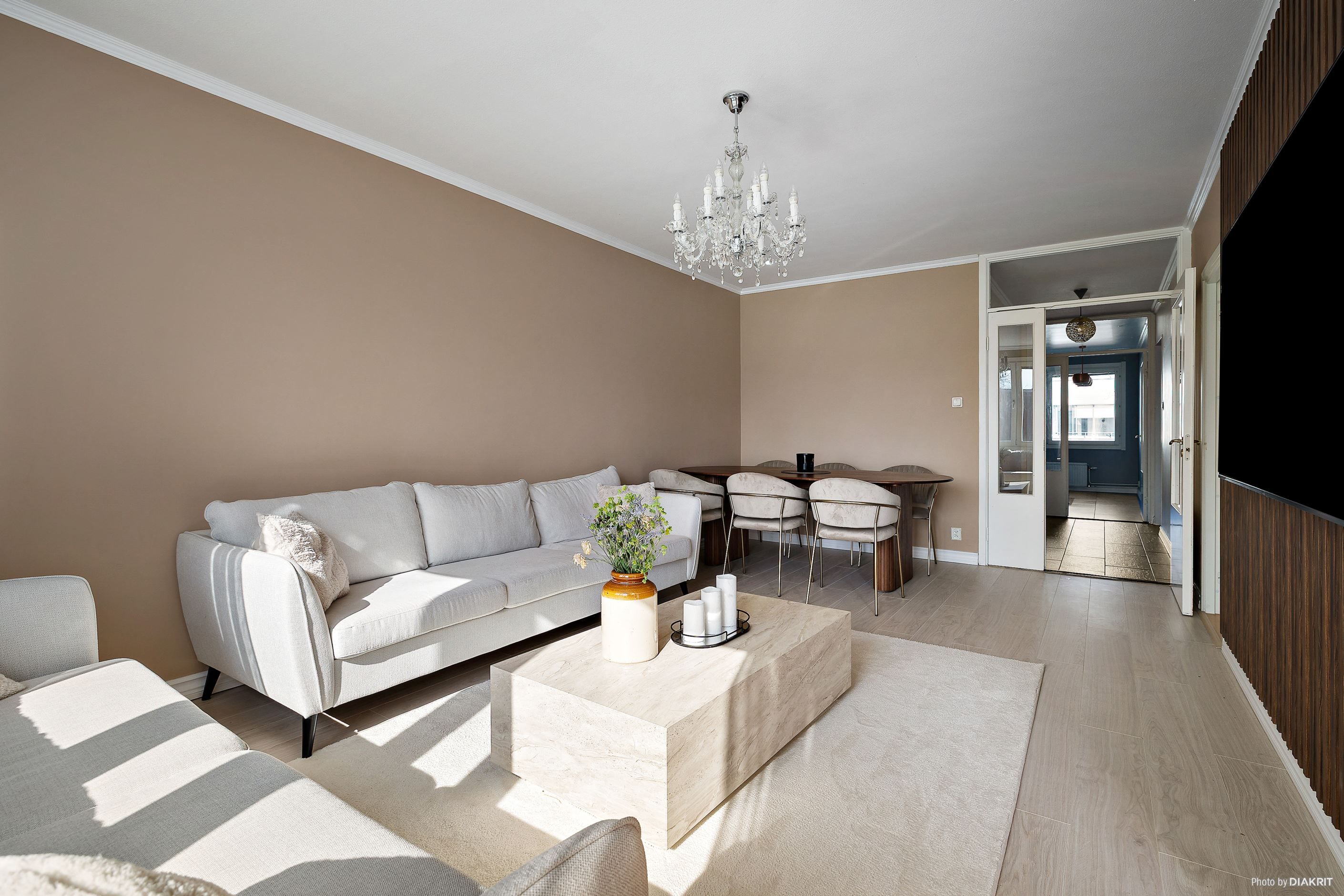 Det rymliga vardagsrummet bjuder in till umgänge och har direkt utgång till den inglasade balkongen, vilket skapar en härlig förlängning av bostaden. Väggarna är genomgående nymålade 2023, vilket ger ett fräscht och modernt intryck.