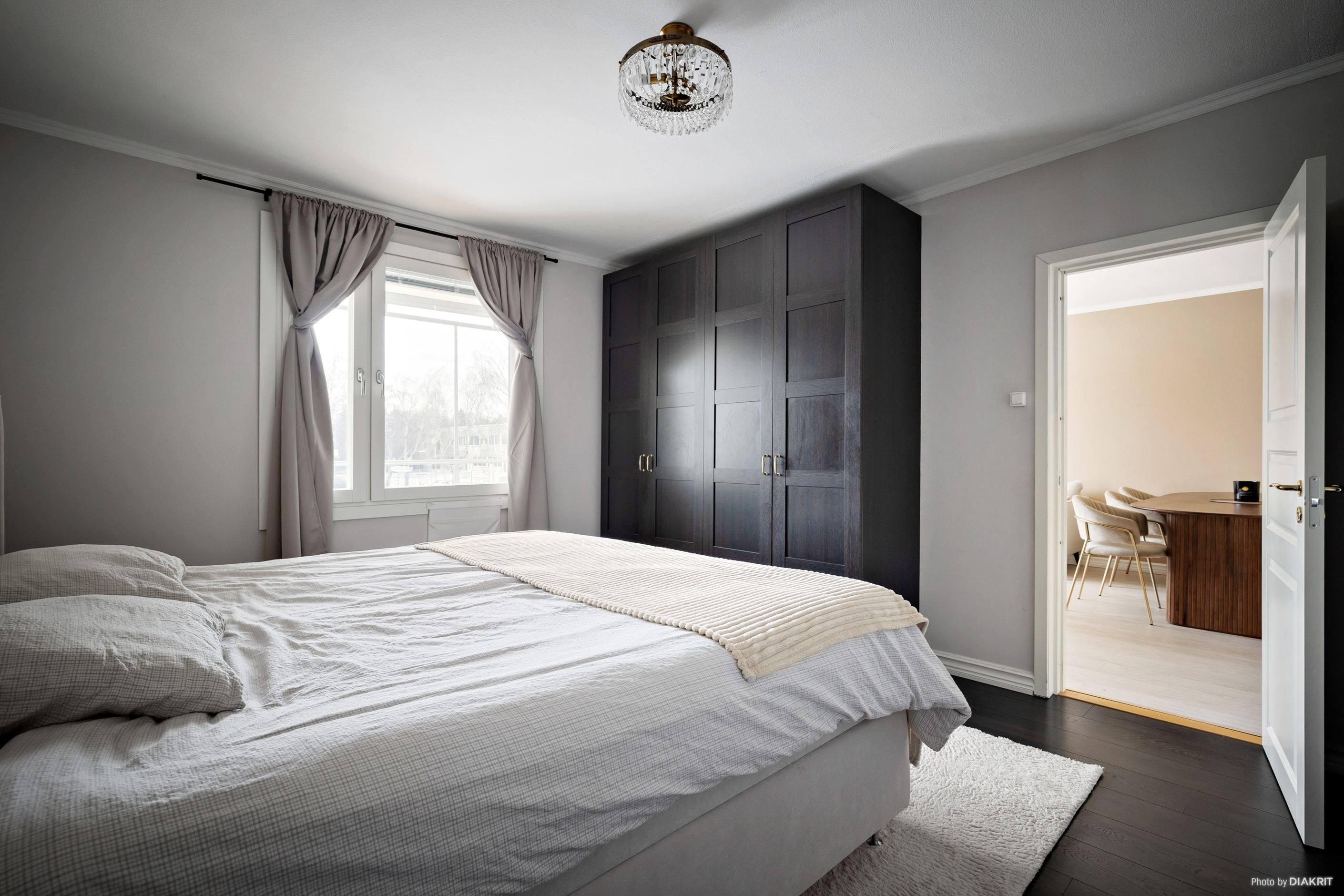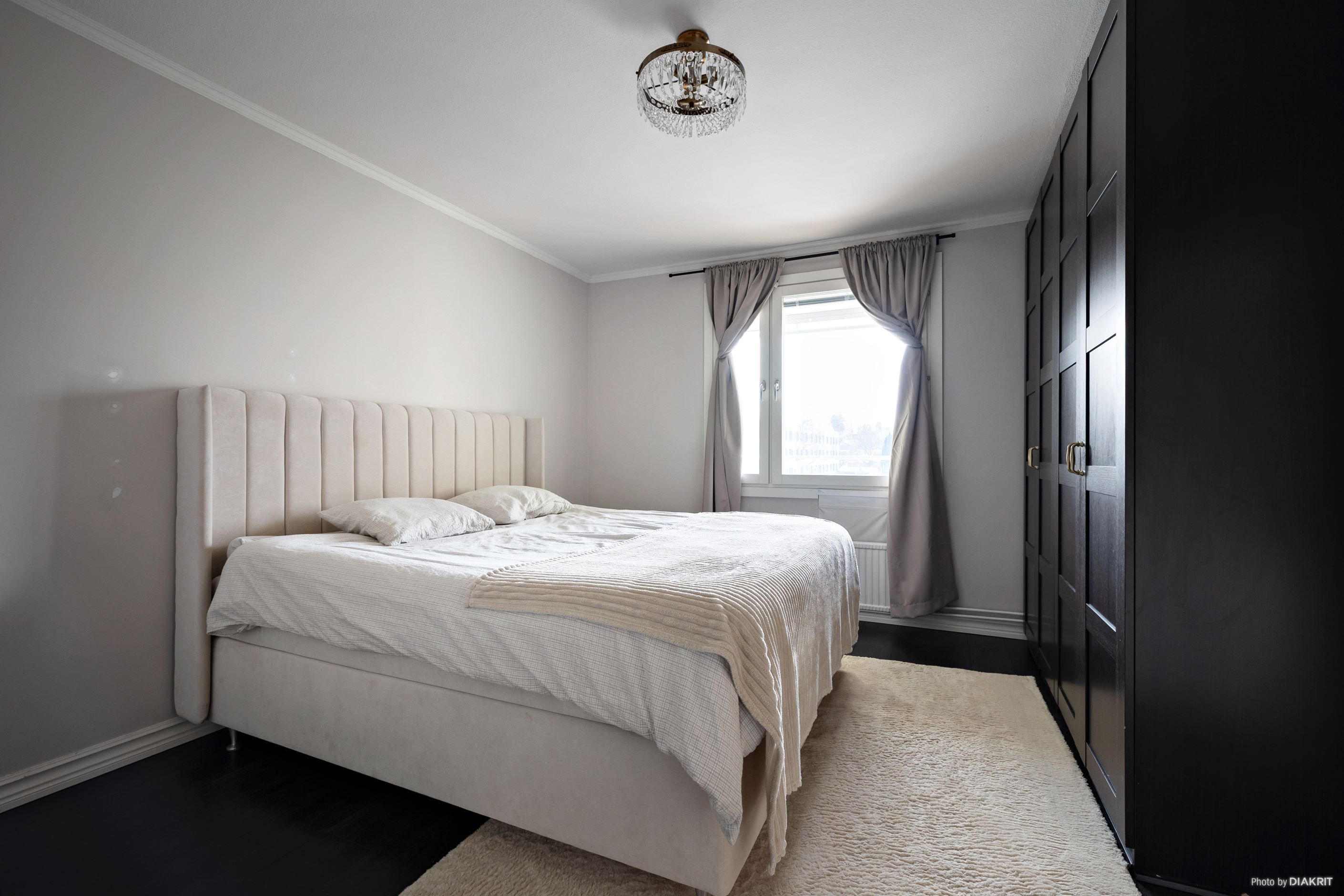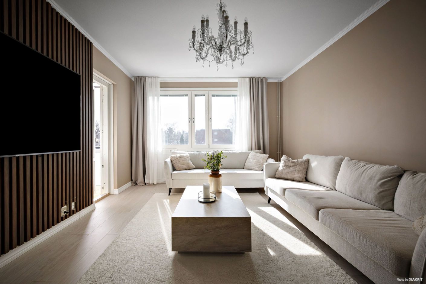 Det rymliga vardagsrummet bjuder in till umgänge och har direkt utgång till den inglasade balkongen, vilket skapar en härlig förlängning av bostaden. Väggarna är genomgående nymålade 2023, vilket ger ett fräscht och modernt intryck.