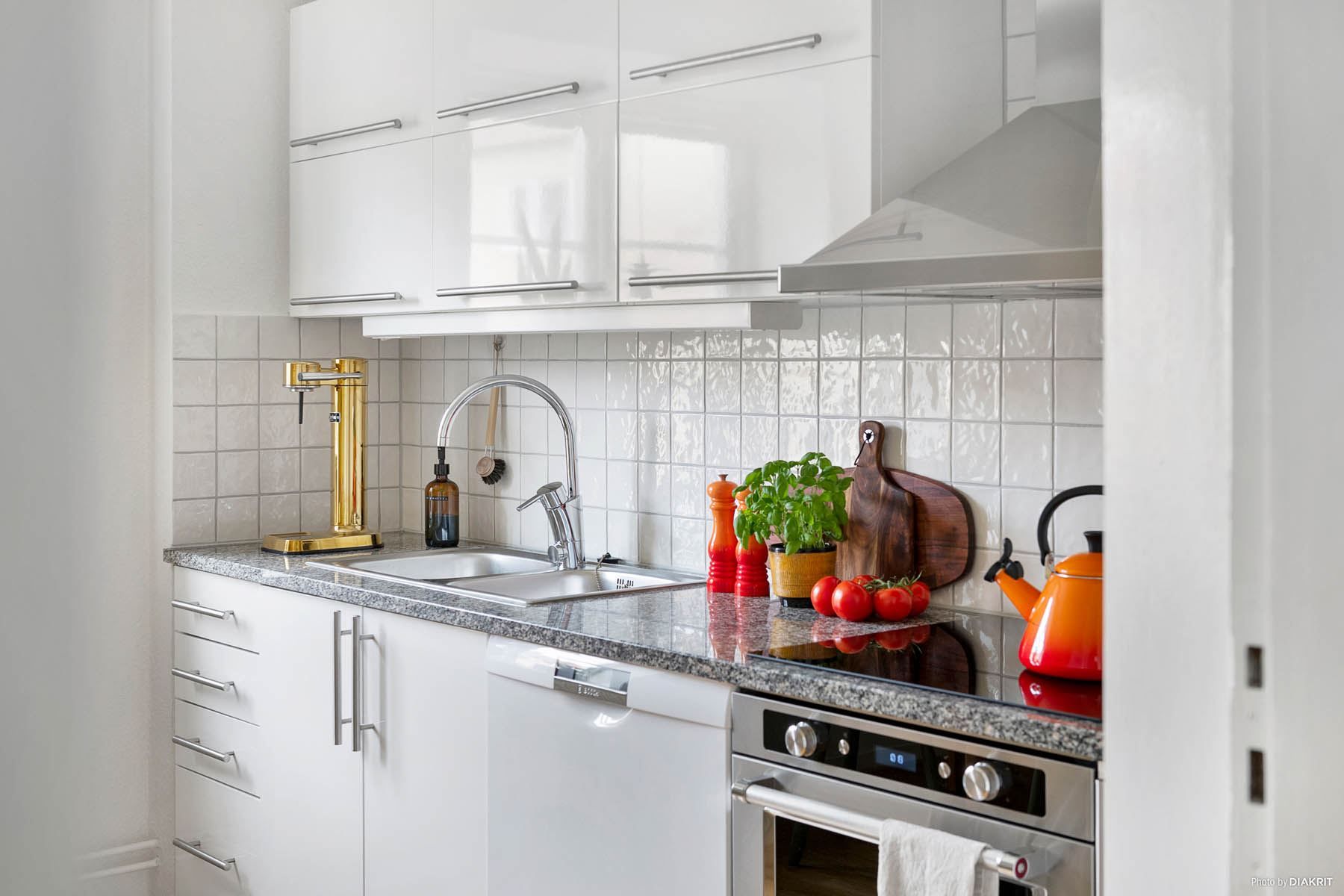 Vi välkomnas in i bostaden av en hall med kaklat golv samt utrymme för att förvara skor och ytterkläder. Det parkettbelagda golvet leder oss vidare till köket, vilket även blir en social del i bostaden tack vare den rymliga matplatsen. De vita skåpsluckorna gifter sig fint med bänkskivan i granit och detaljer i rostfritt stål. Här finns utrustning i form av kyl/frys, induktionshäll, spisfläkt, diskmaskin samt en påkostad ugn från Kitchen Aid.