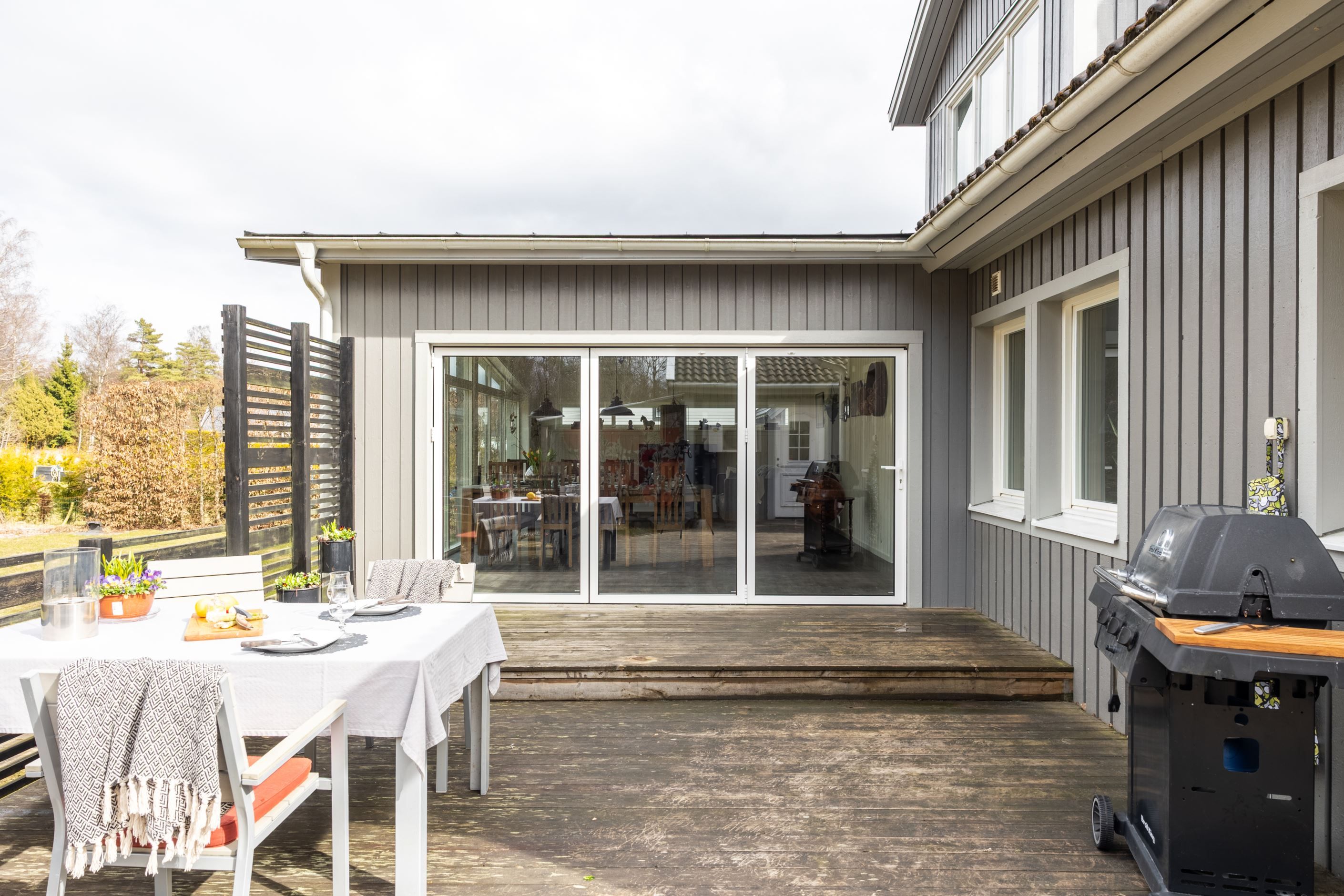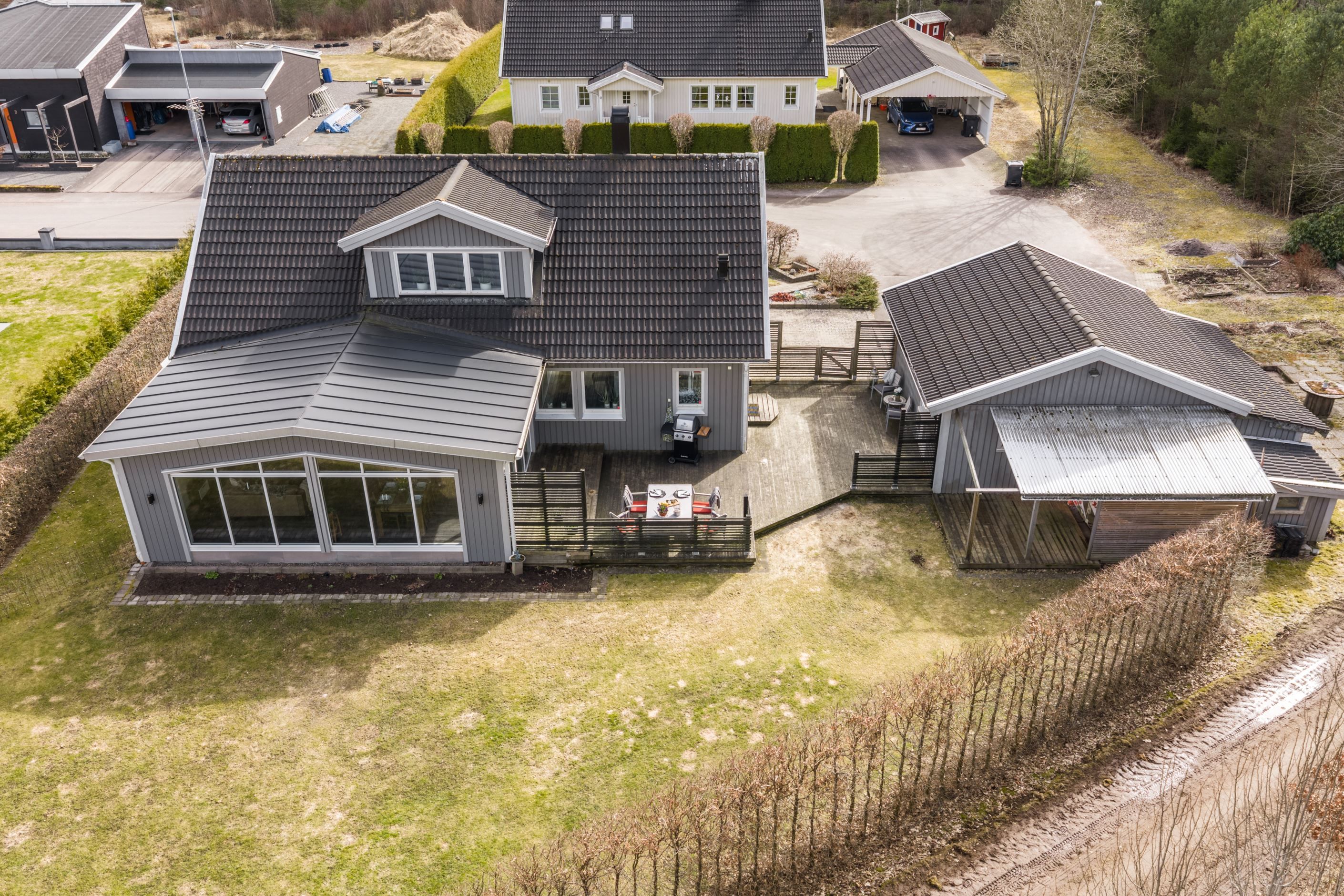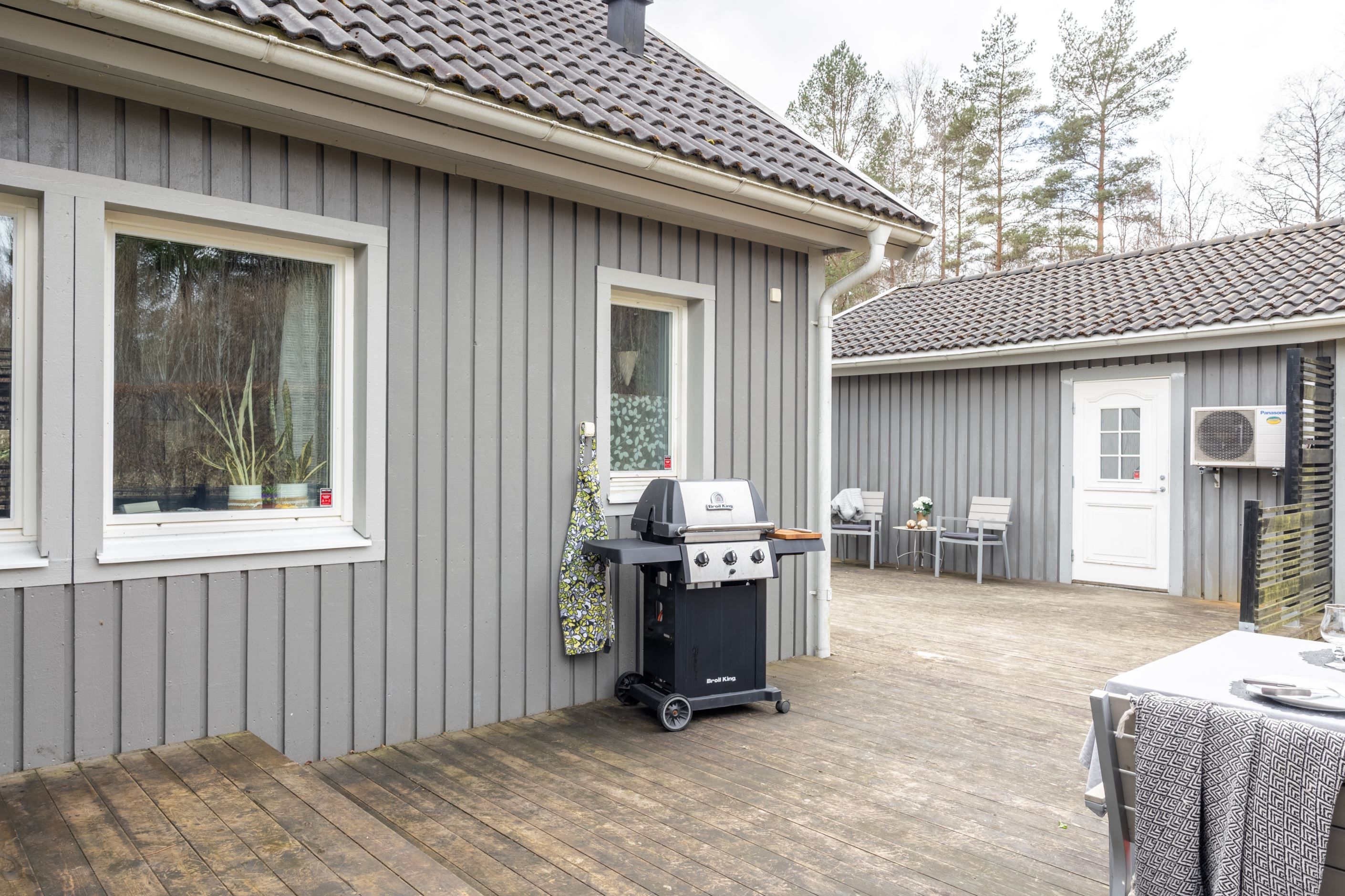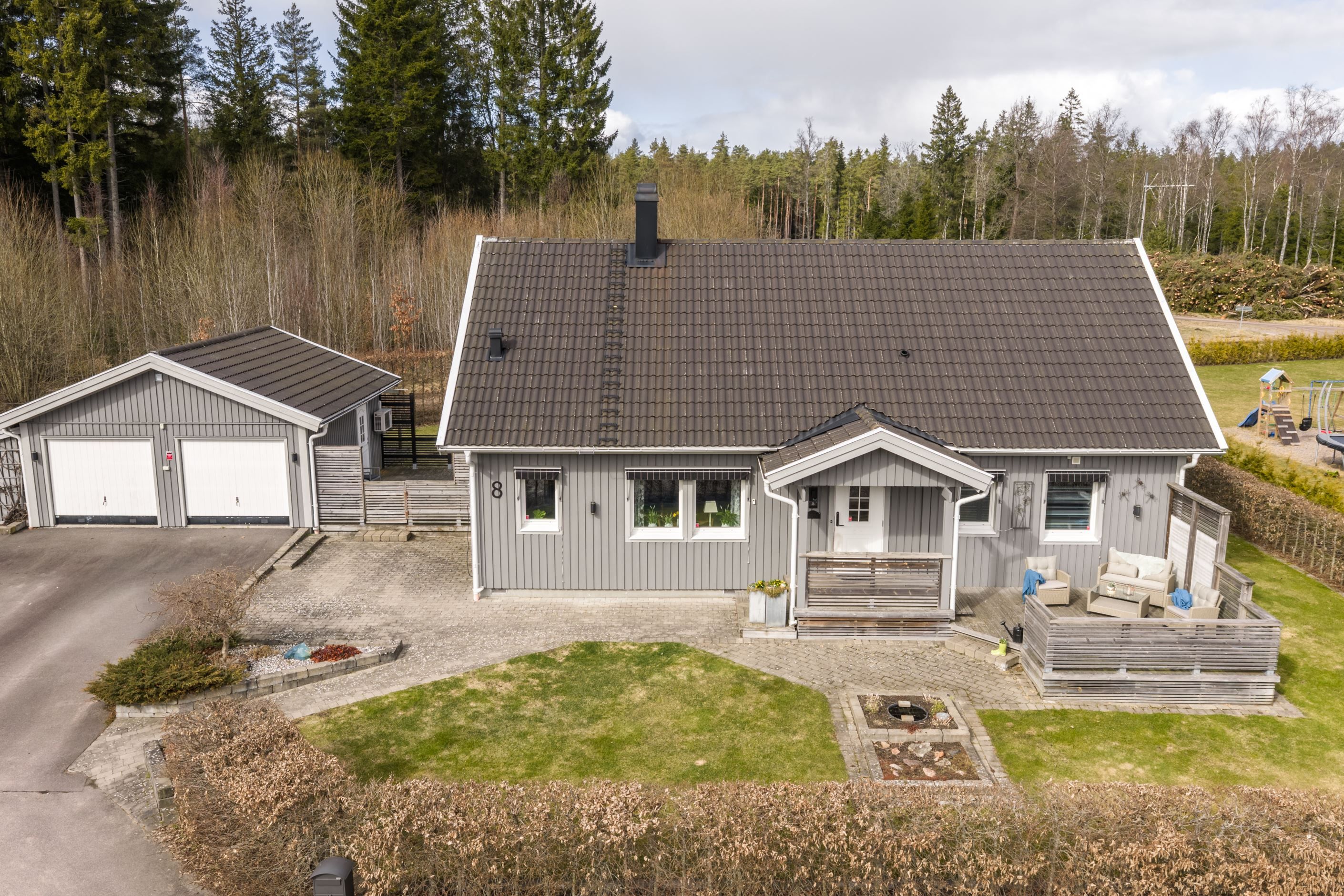 Huset, uppfört 2010 och smakfullt utbyggt, bjuder på generösa ytor och ett fantastiskt ljusinsläpp. Hjärtat i hemmet är det stora, stilrena glasrummet mot baksidan – en plats som suddar ut gränsen mellan ute och inne och låter naturen bli en del av vardagen året om. Här njuter du av skogens närhet i en privat och harmonisk miljö. Precis utanför väntar en generös terrass i härligt solläge, perfekt för långa sommardagar, middagar under bar himmel och avkopplande stunder i solen.