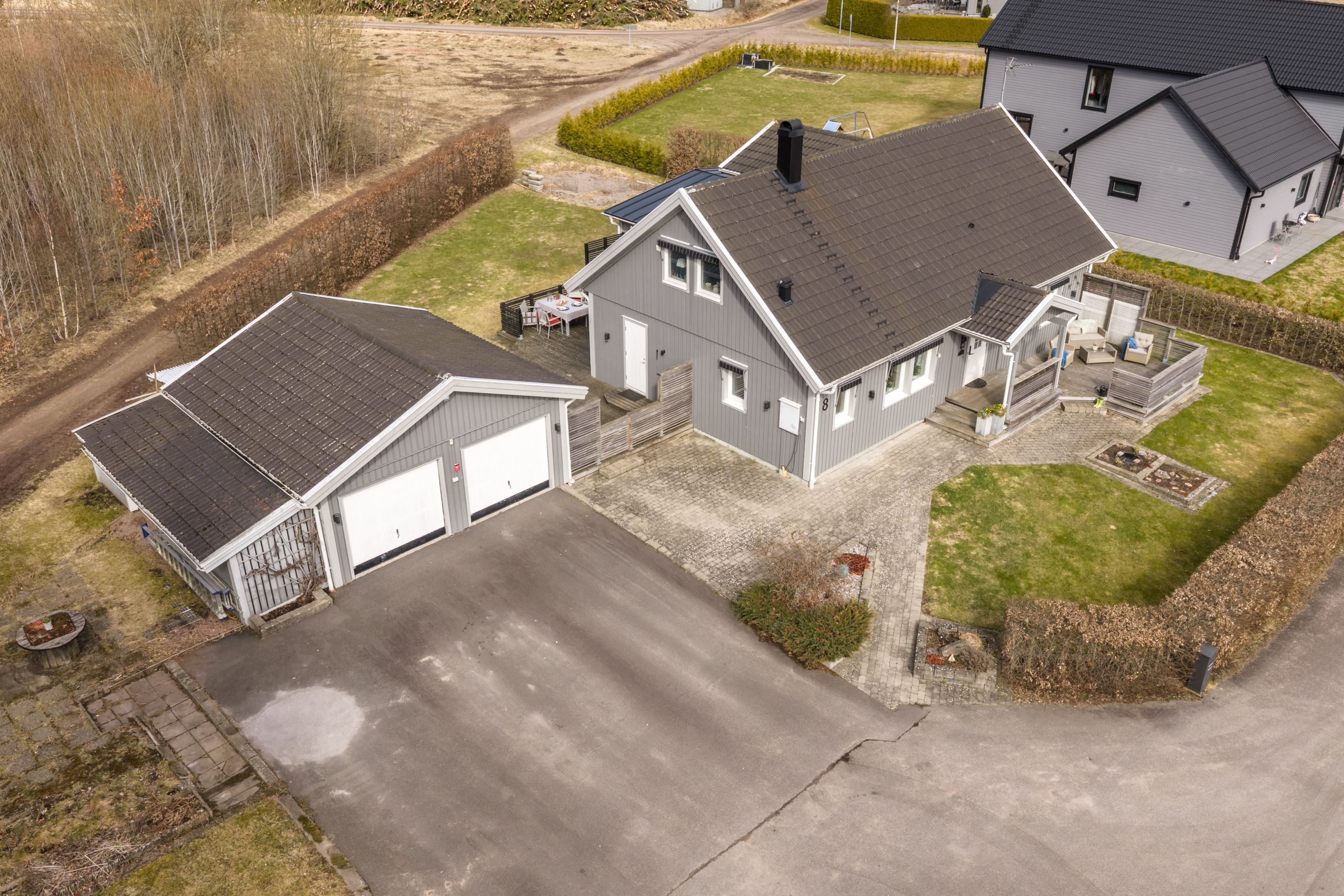 Praktiska detaljer som ett rymligt dubbelgarage gör livet ännu smidigare och förstärker helhetsintrycket av ett hem där funktion och estetik går hand i hand.