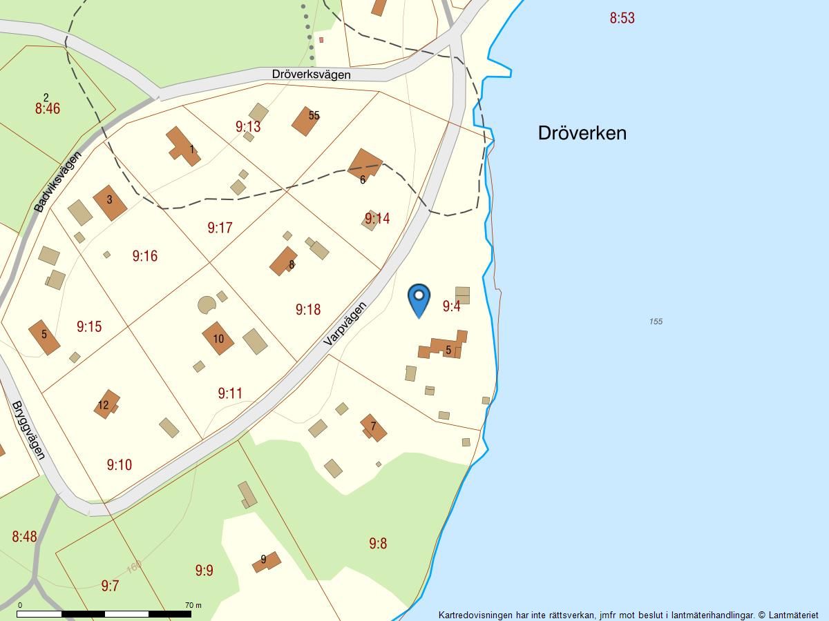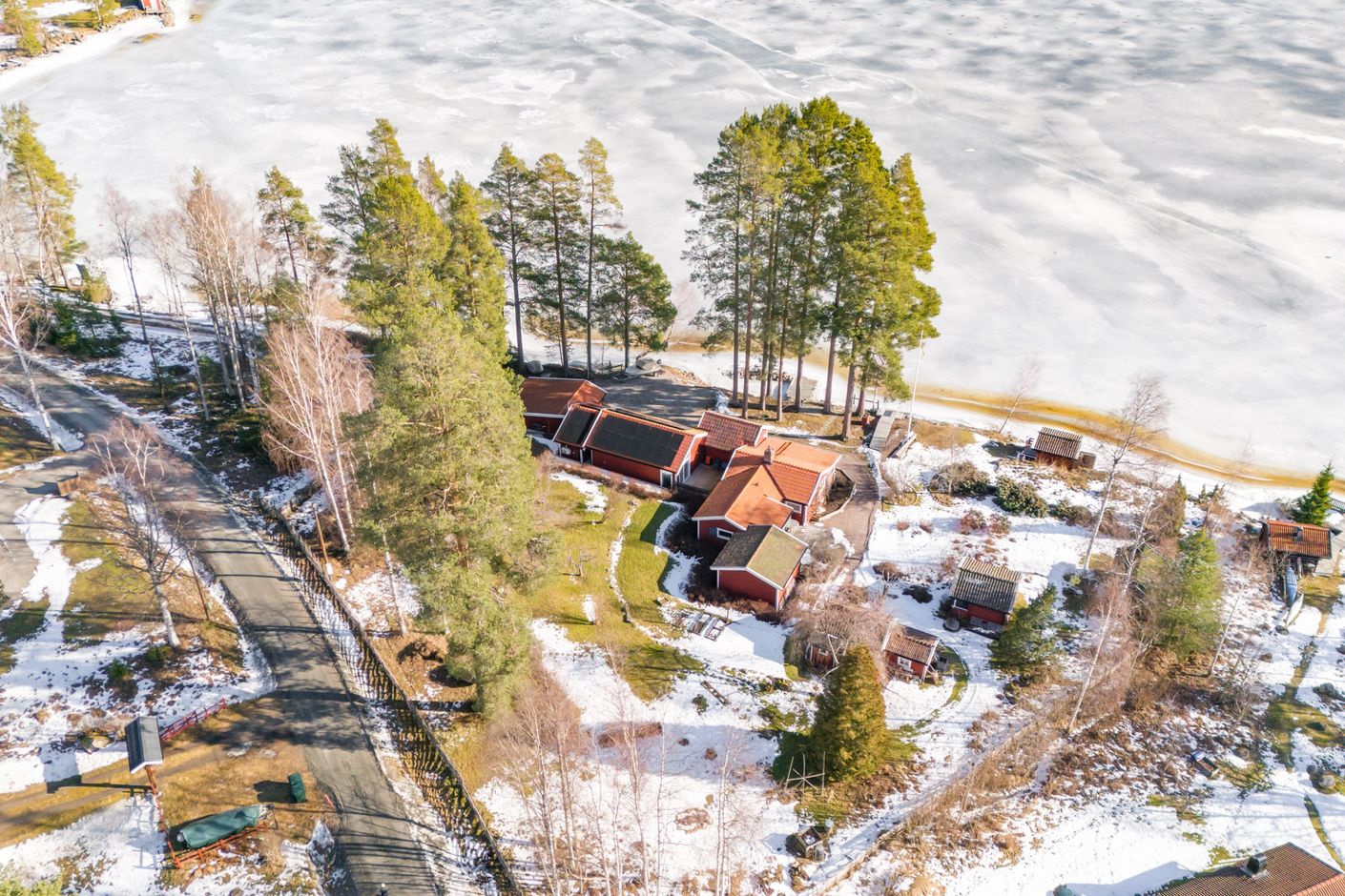 Fastigheten omfattar drygt 7 000 kvadratmeter mark som sträcker sig längs strandlinjen. Den långsträckta tomten följer vattnet och ger en öppen vy över sjön samtidigt som huset ligger lugnt och ogenerat placerat i sin omgivning.