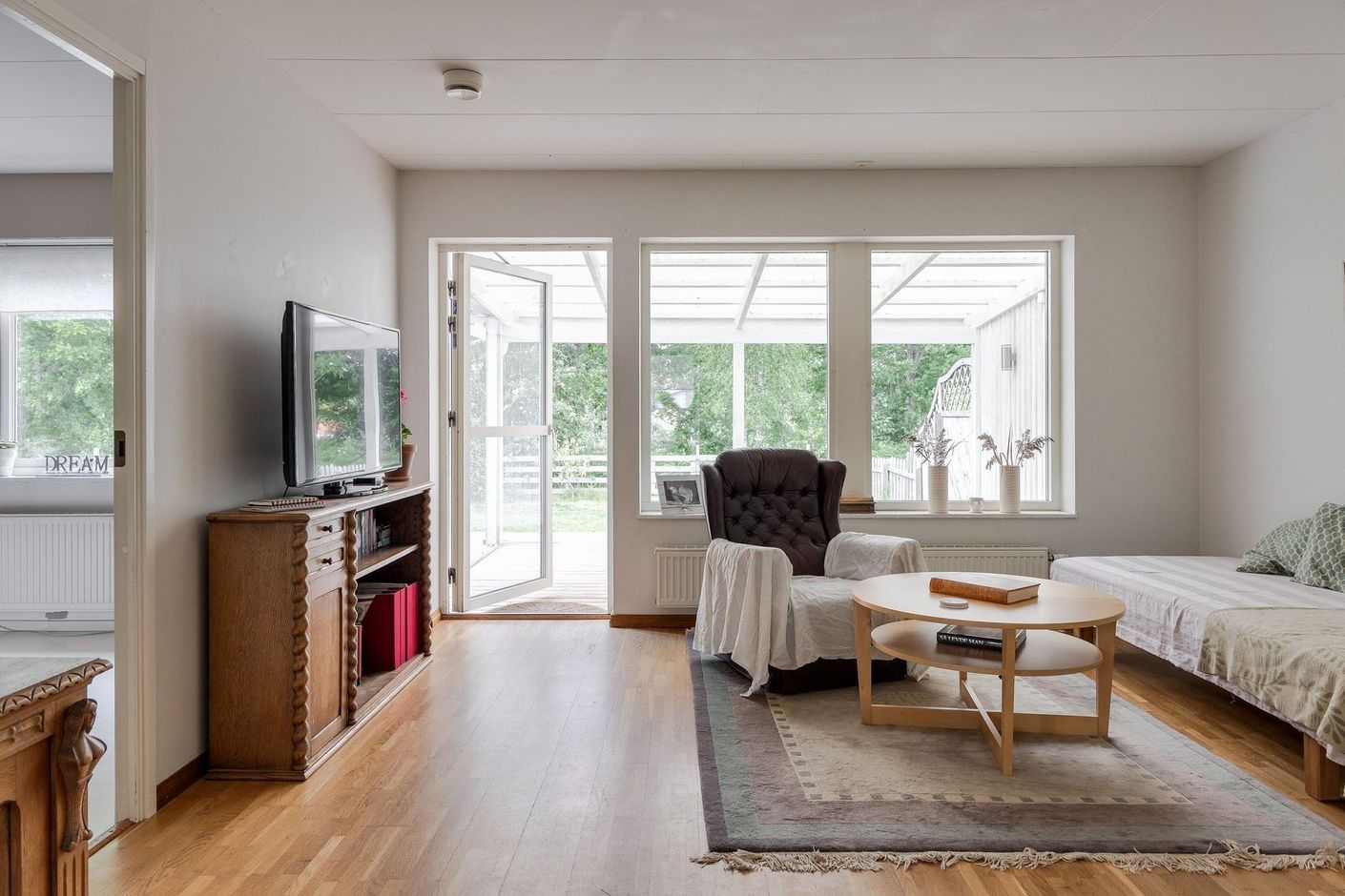 Det rymliga köket badar i naturligt ljus tack vare stora fönster och är utrustat med en ny kyl med frysfack från Smeg (2023). Diskmaskin, spis, ugn och fläkt är äldre men fullt fungerande.