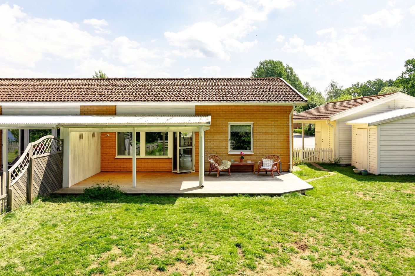Denna bostadsrätt erbjuder en utmärkt planlösning med en insynsskyddad trädgård inramad av ett staket med en grind som leder ut till en allmänning med stora träd. Här finns gott om plats för odling, hundgård, lekställning och bollspel, samt en redskapsbod för extra förvaringsutrymme.