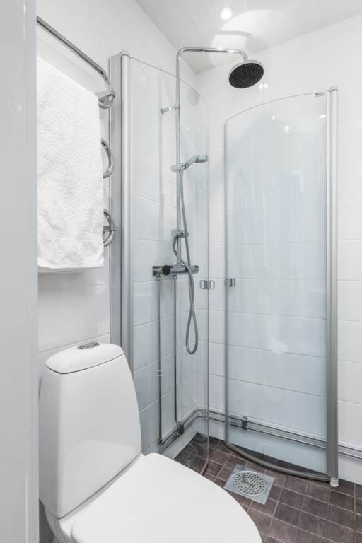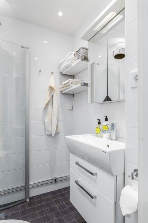 Badrum som renoverats 2013 med vitt kakel och ljusgrått klinker. Snygg takdusch, spotlights, rejäl kommod och wc.