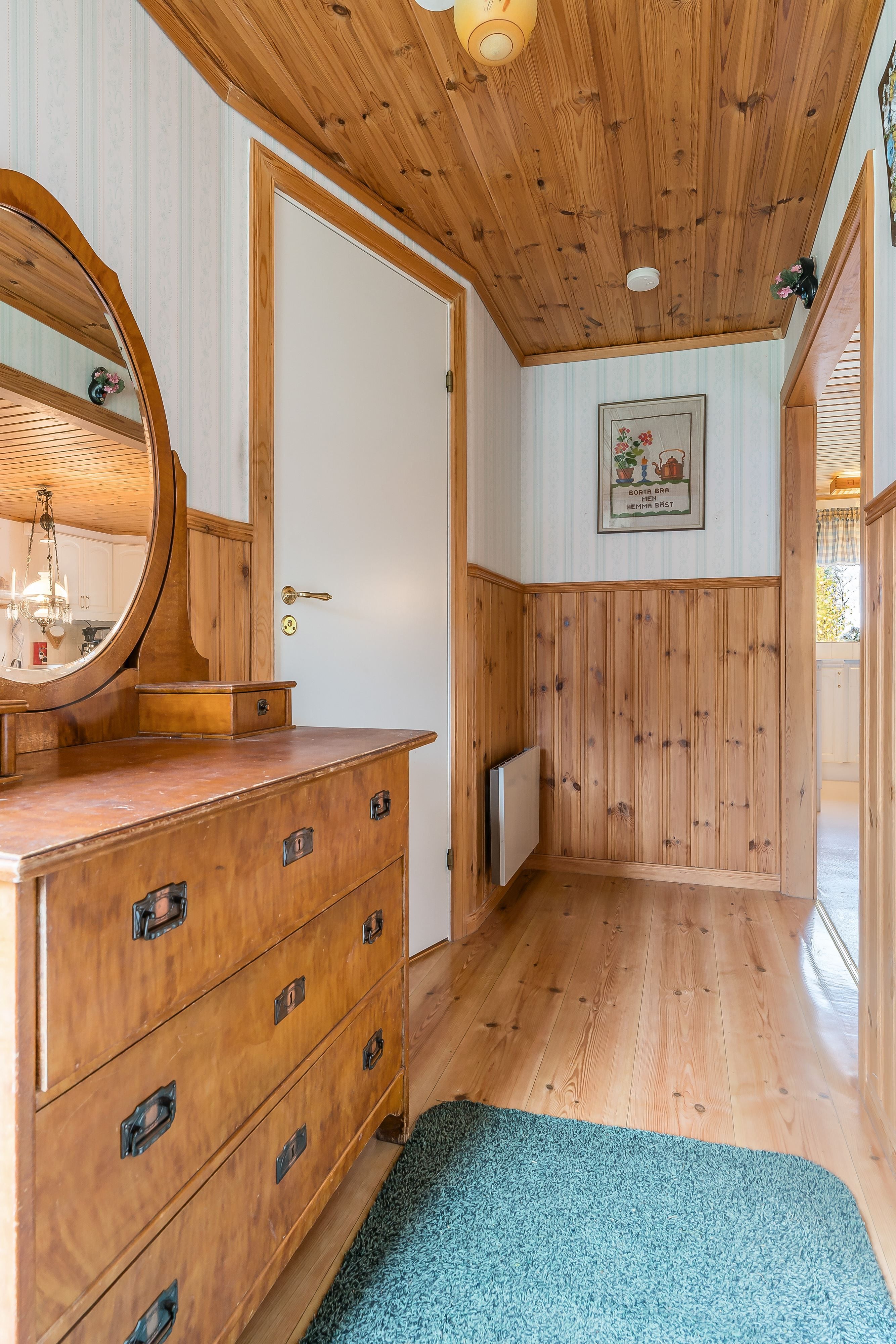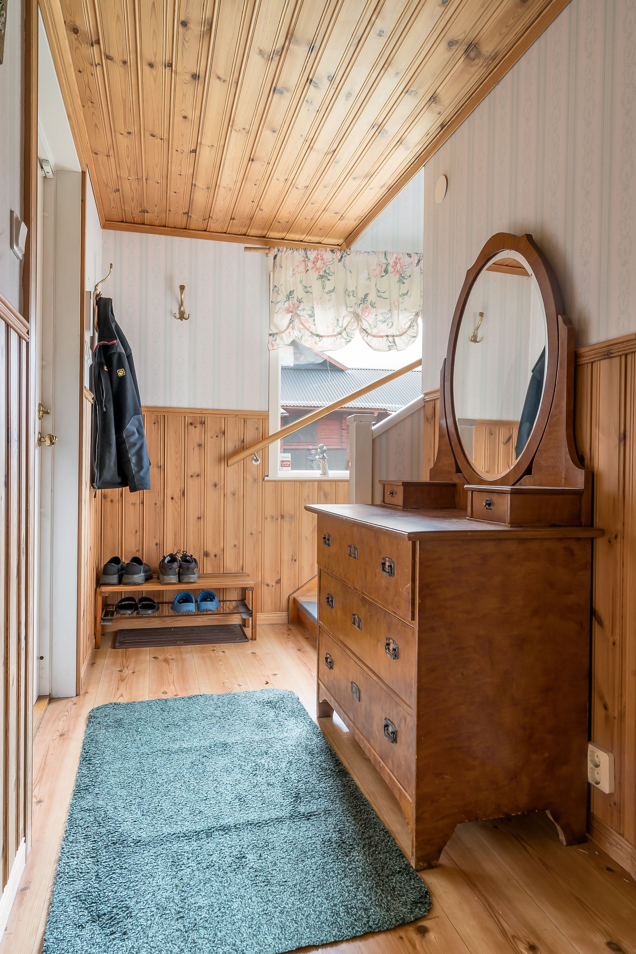 På entréplanet möts du av en större takad uteplats och där hallen leder dig vidare till ett ljust vardagsrum, ett sovrum samt ett badrum. En trappa upp finns två rum samt ytterligare ett badrum med tvättmöjligheter – praktiskt och bekvämt för den moderna familjen.