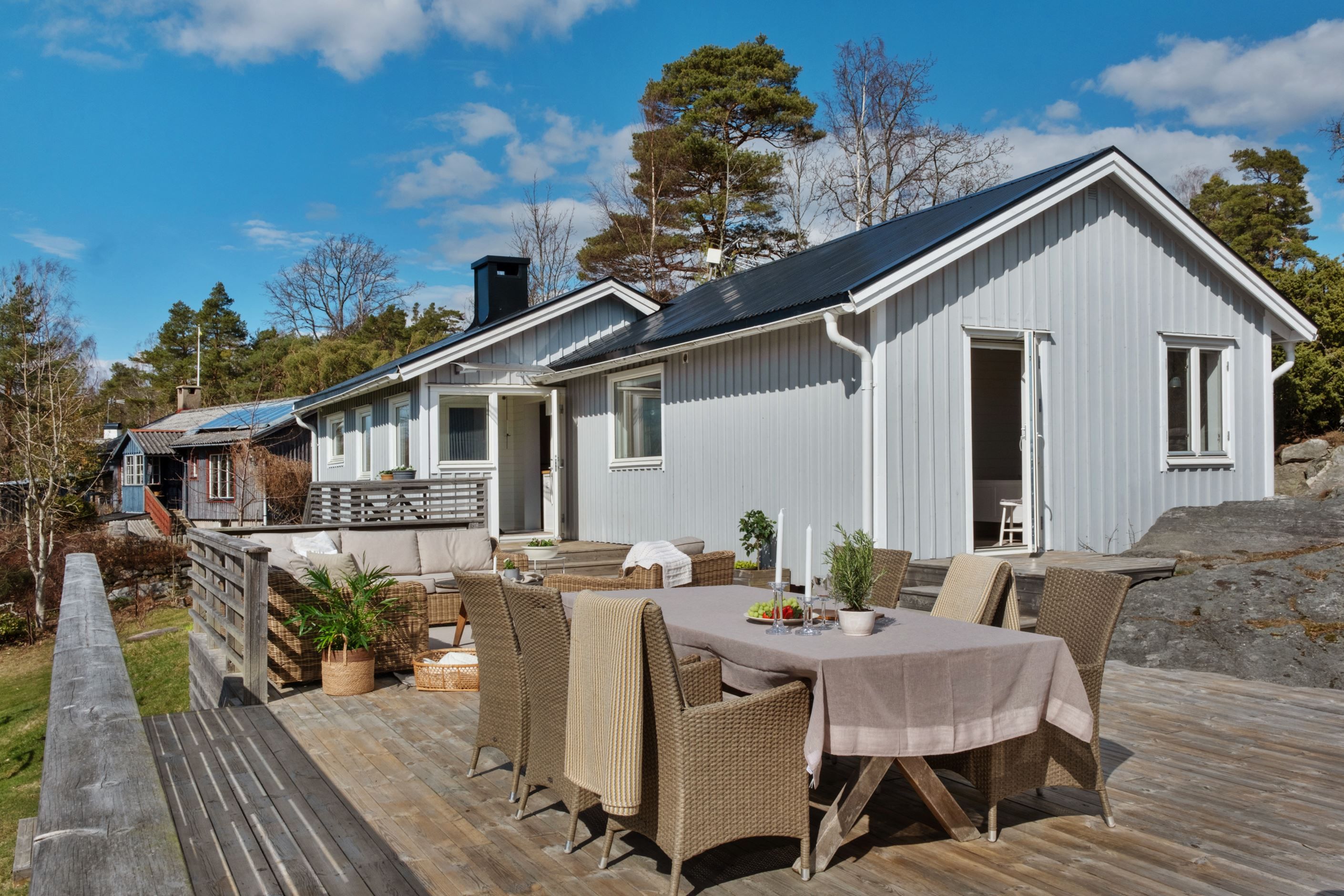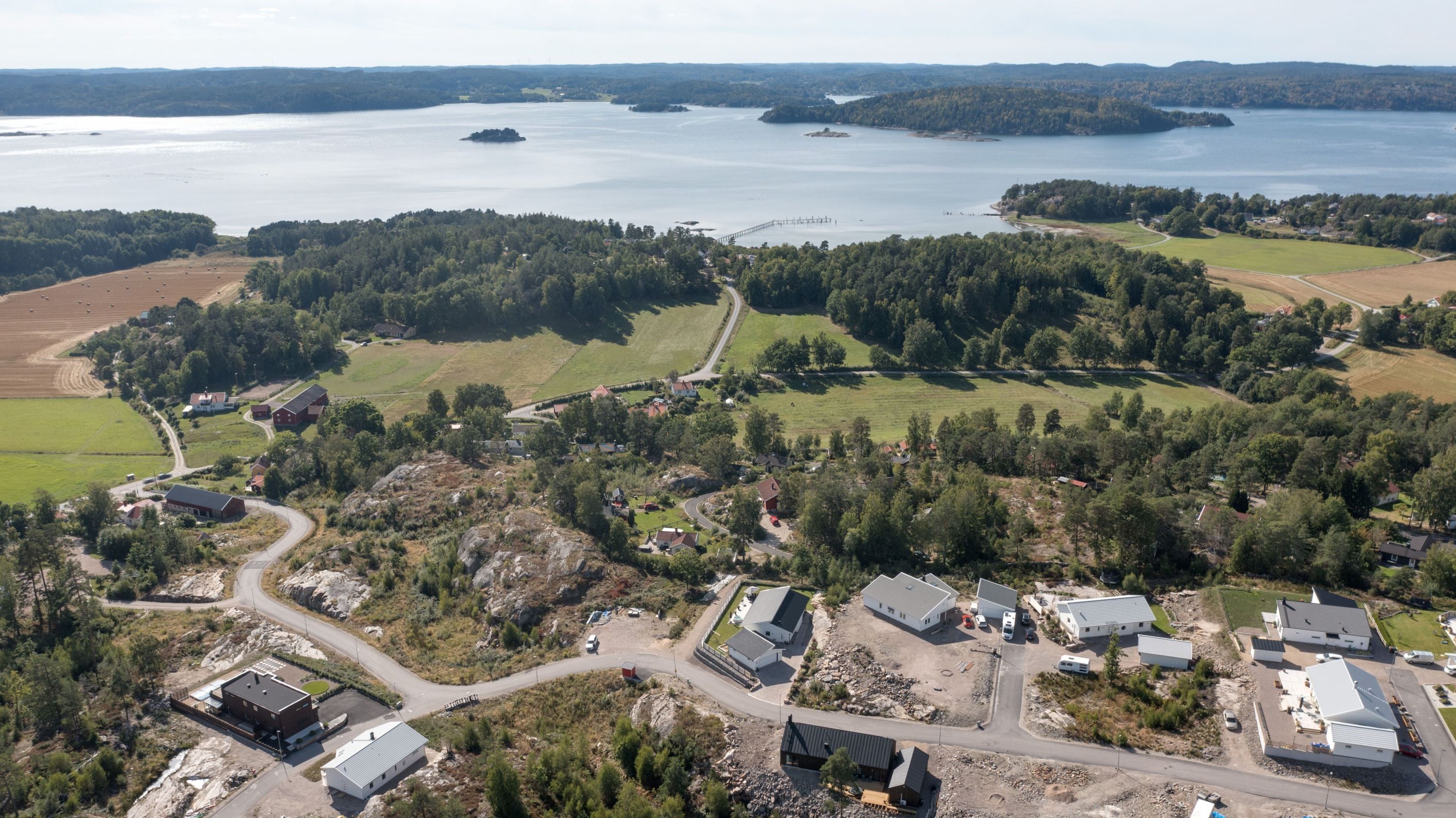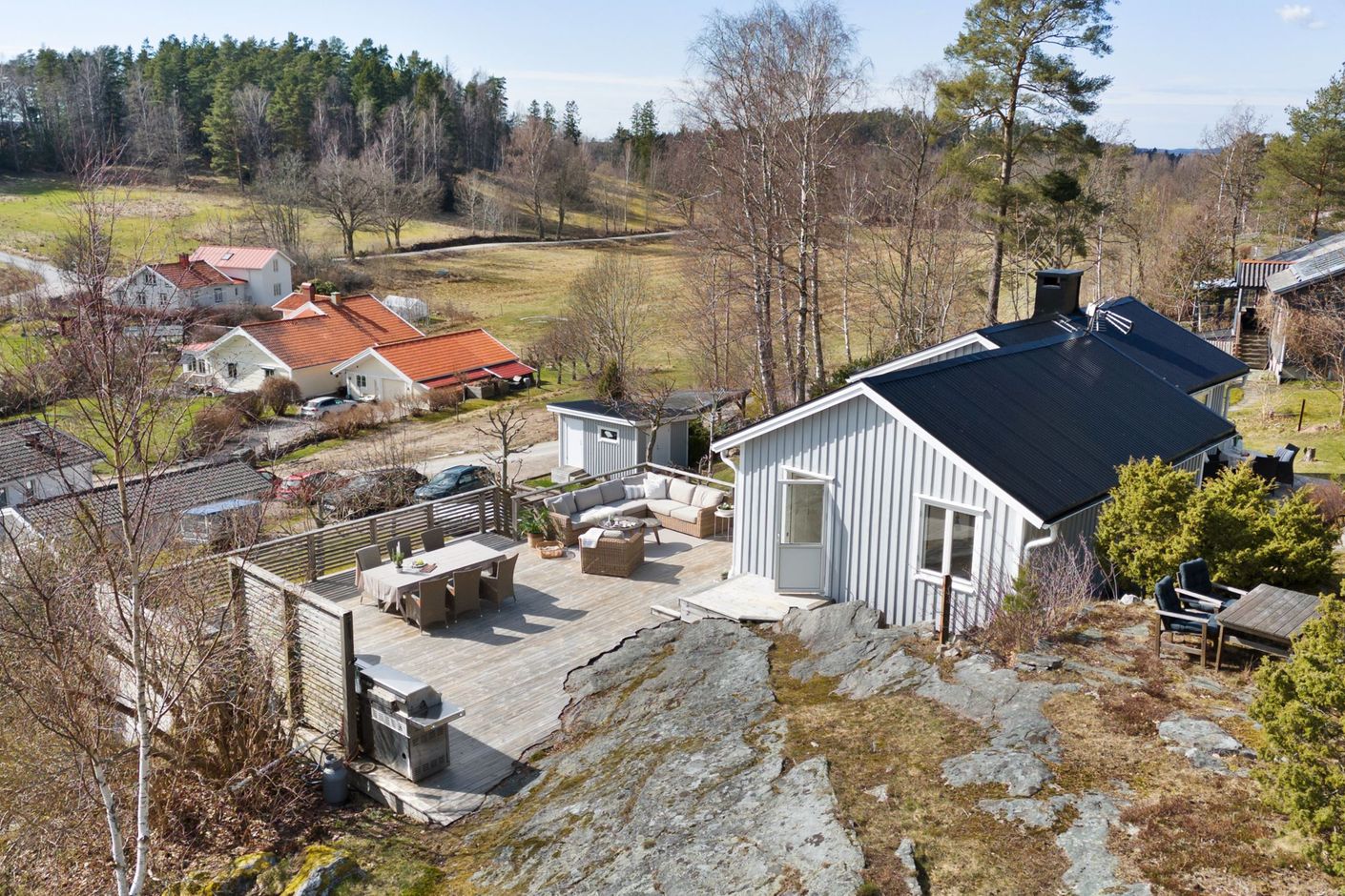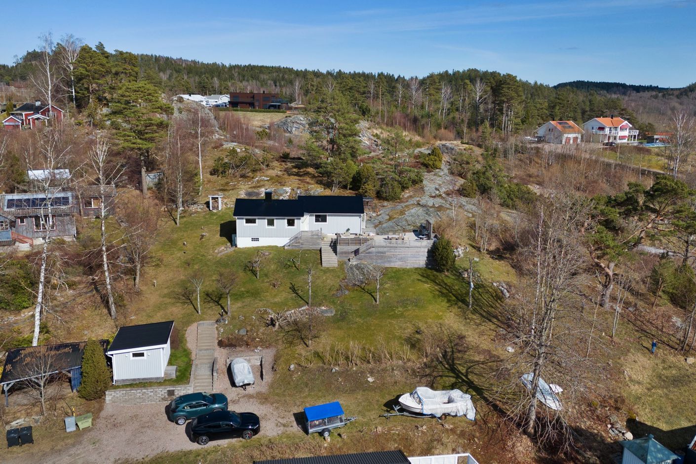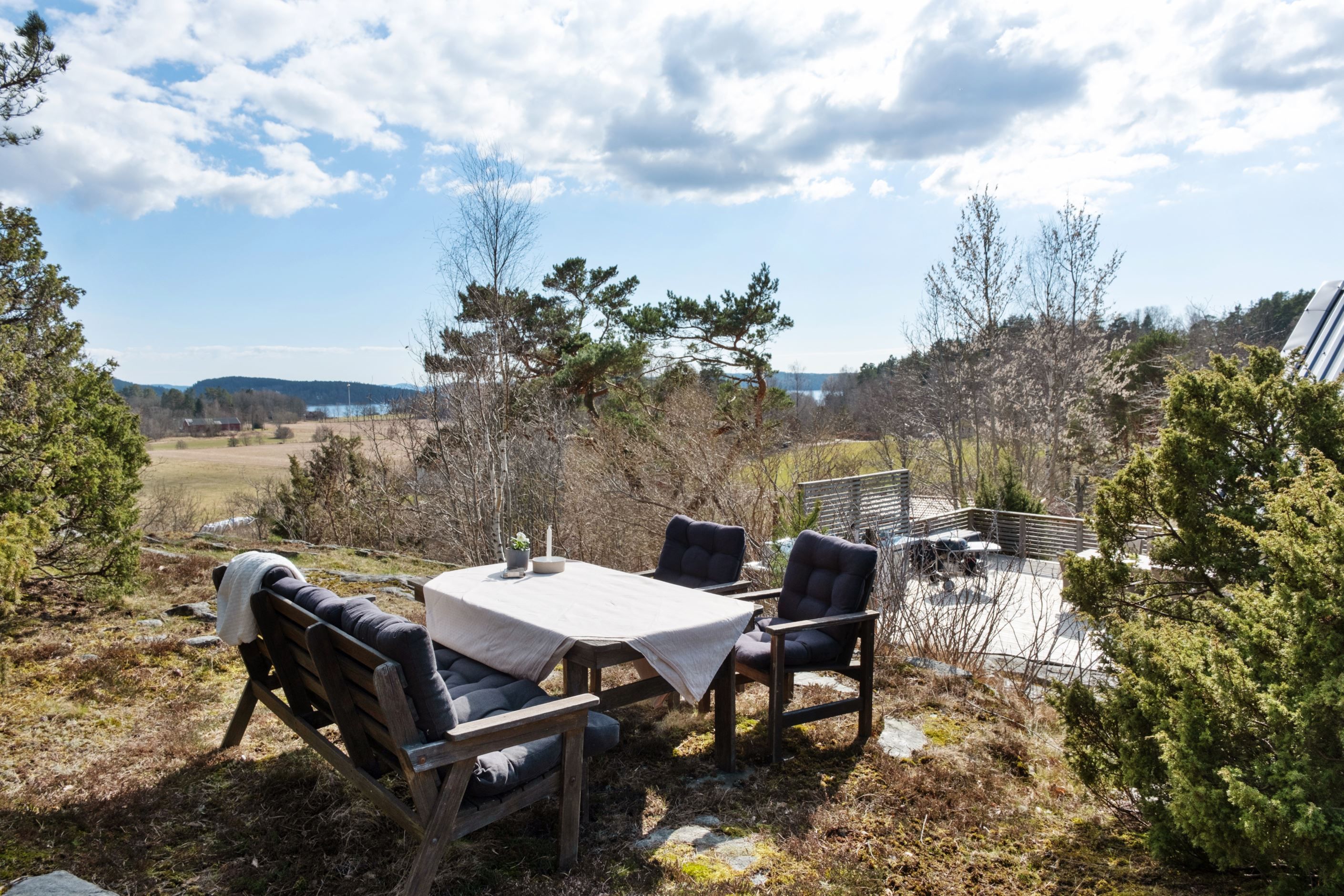 Tomten är kuperad och karaktäristisk för området, men väl uppe vid huset breder en solig och insynsskyddad platå ut sig. Här möts du av en fantastisk utsikt över Sjöskogen och det omgivande kustlandskapet, där det bohuslänska berget bryter fram och förstärker den genuina känslan av västkust.