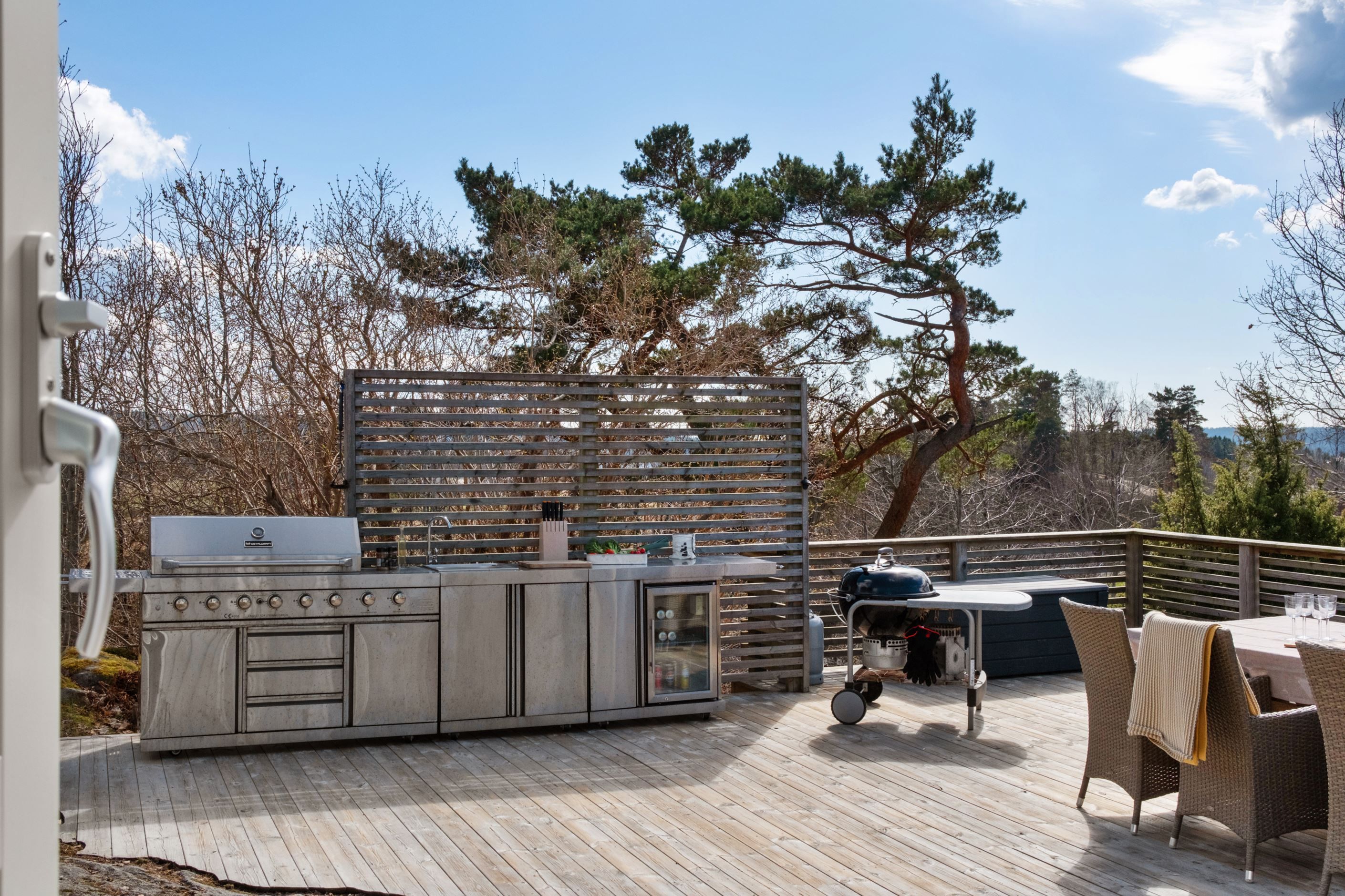 Här erbjuds en uteplats utöver det vanliga. Njut av en slående utsikt i kombination med ett välutrustat utekök och generösa ytor för både loungegrupp och stort middagsbord. Detta är en perfekt plats för sociala tillställningar med familj och vänner, där du kan ta vara på kvällssolen och njuta av långa, ljumma sommarkvällar i en rofylld och inspirerande miljö.