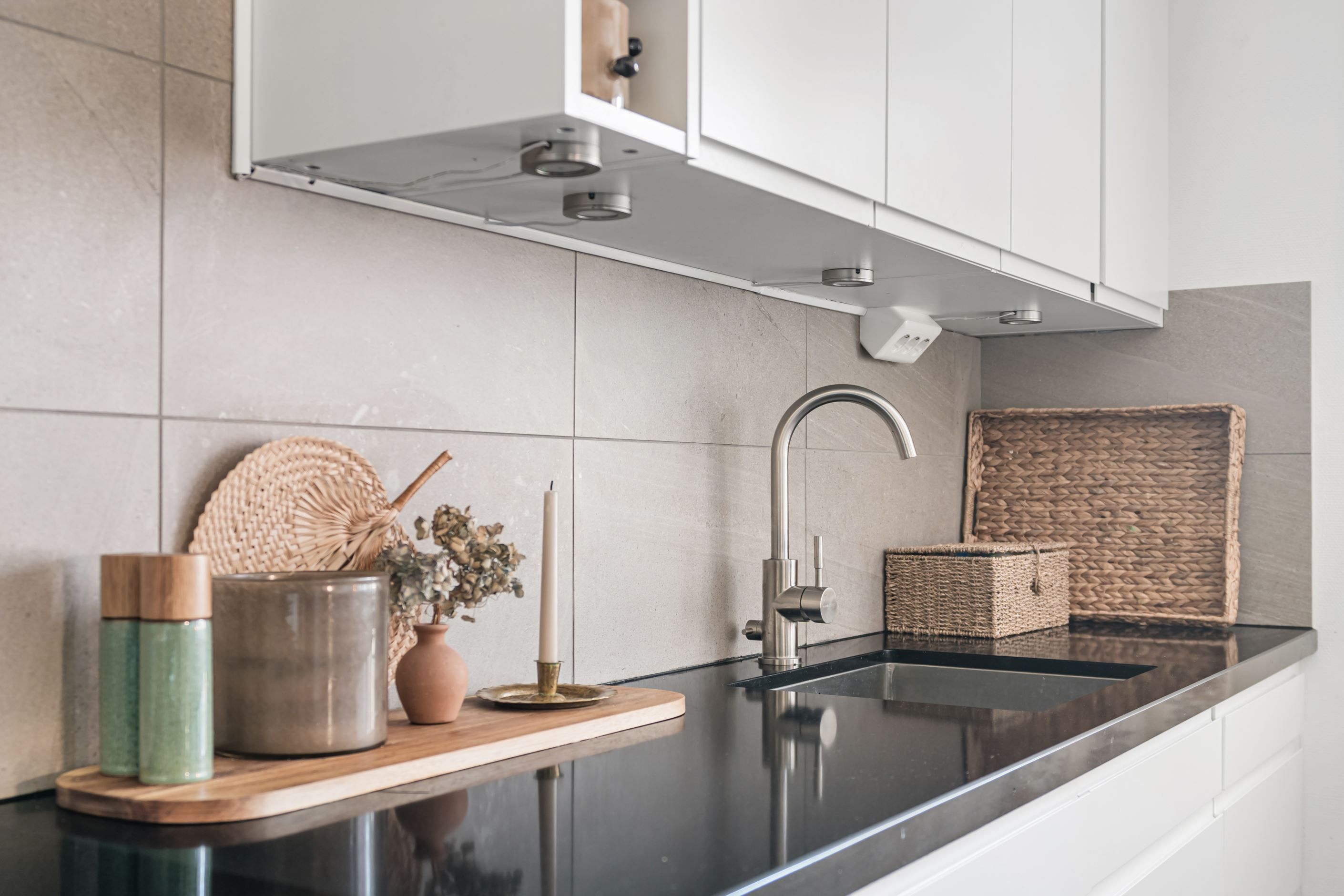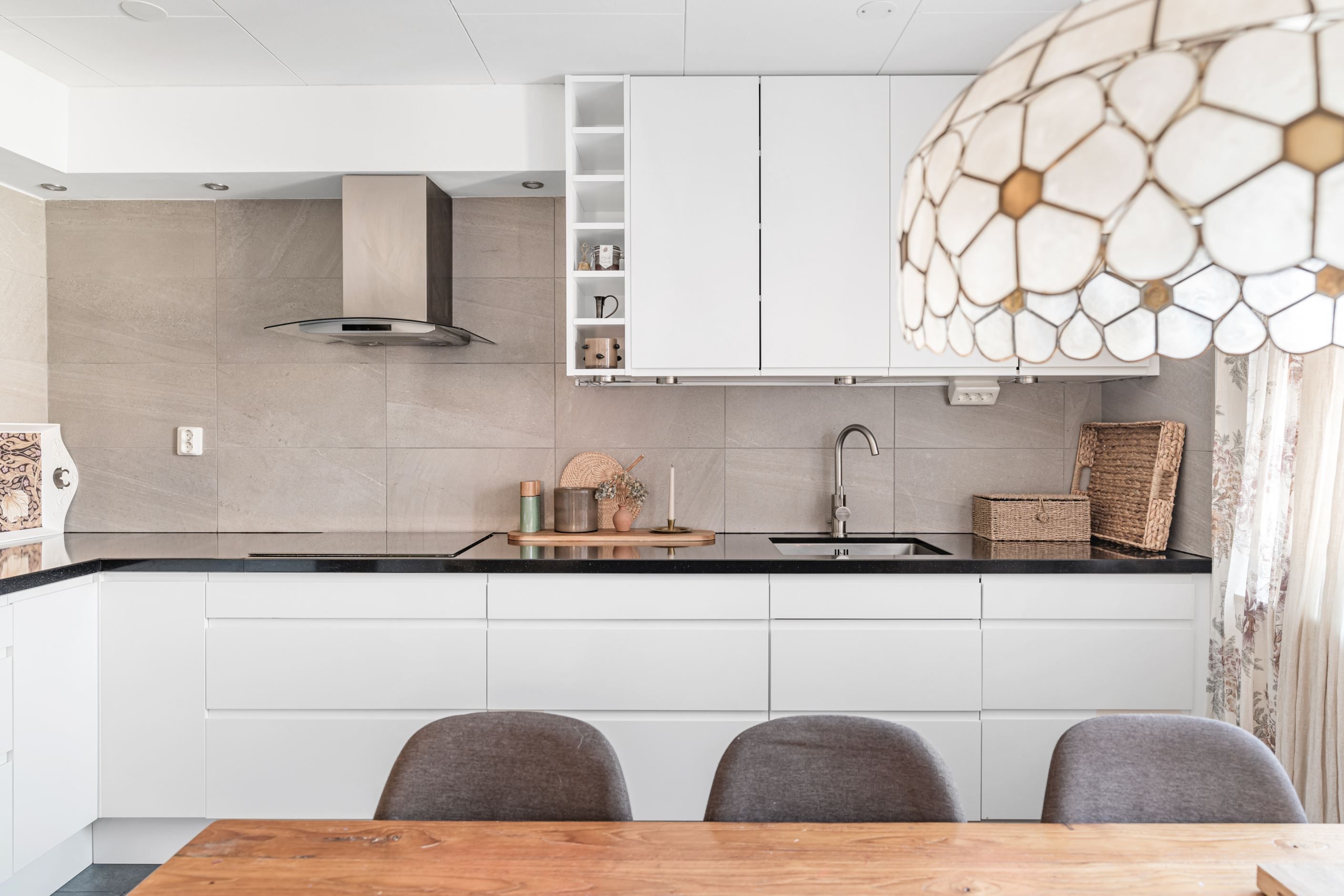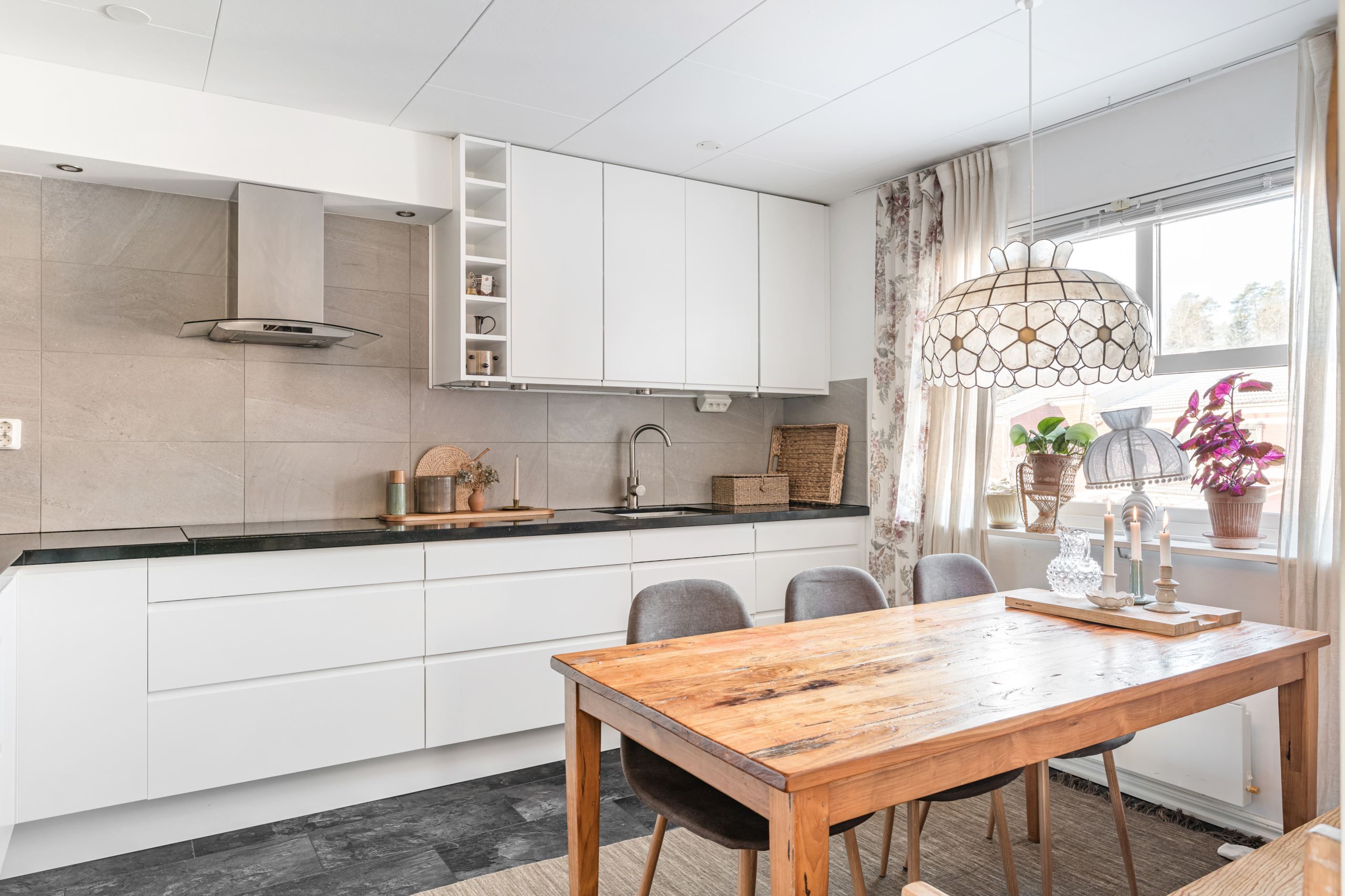 Köket är renoverat i varma, ljusa toner och är lika praktiskt som inbjudande – en plats där vardagens måltider möter långa, sociala kvällar. Vardagsrummet har med stor fingertoppskänsla delats av med en elegant glasvägg, vilket skapat ett extra rum utan att tumma på rymd eller ljus. Den franska balkongen ger rummet både karaktär och charm.