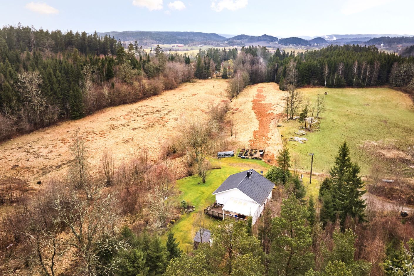 2 hektar betesmark: De öppna hagarna ger perfekta förutsättningar för djurhållning, odling i stor skala eller varför inte en egen ridbana?