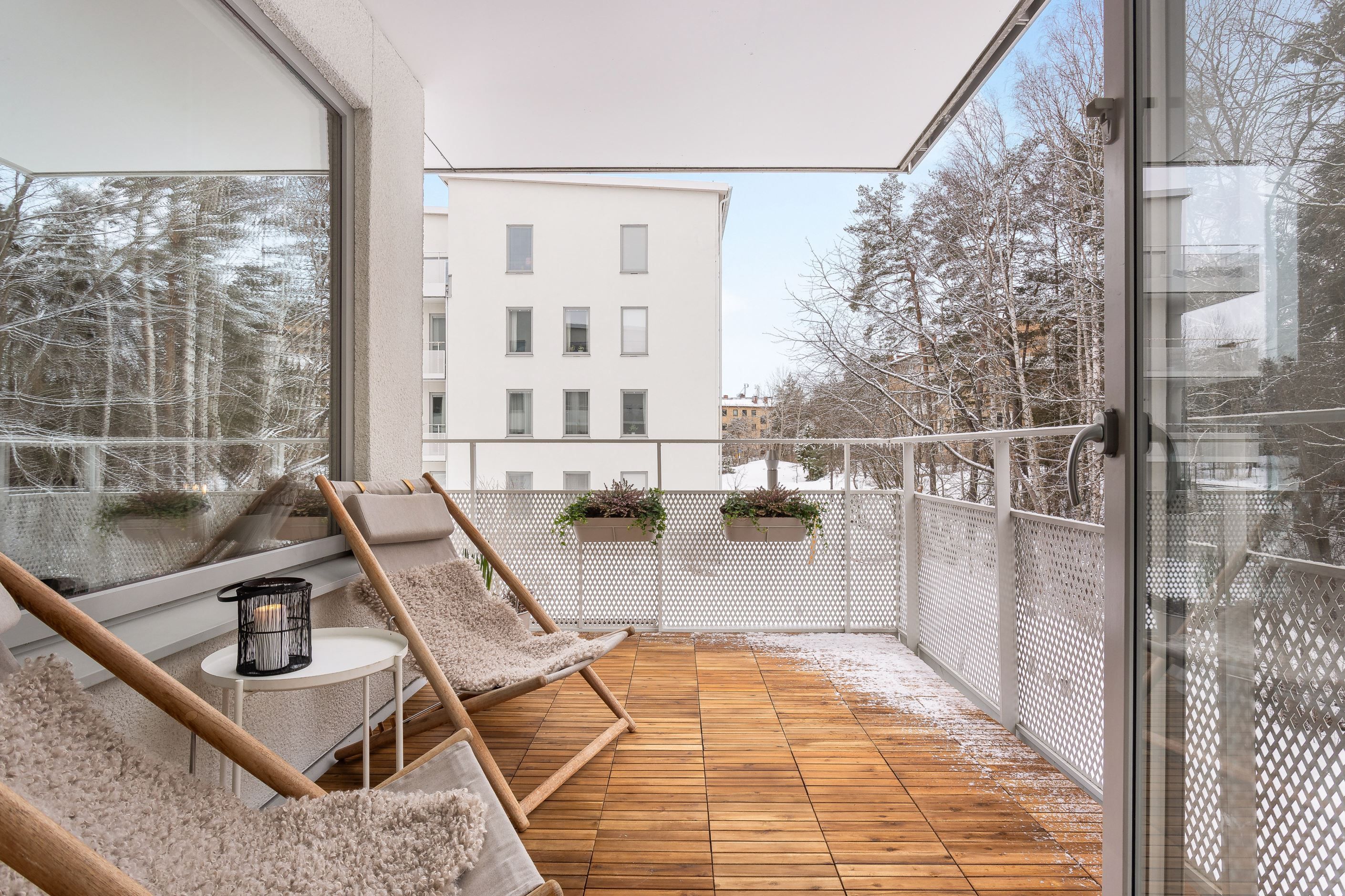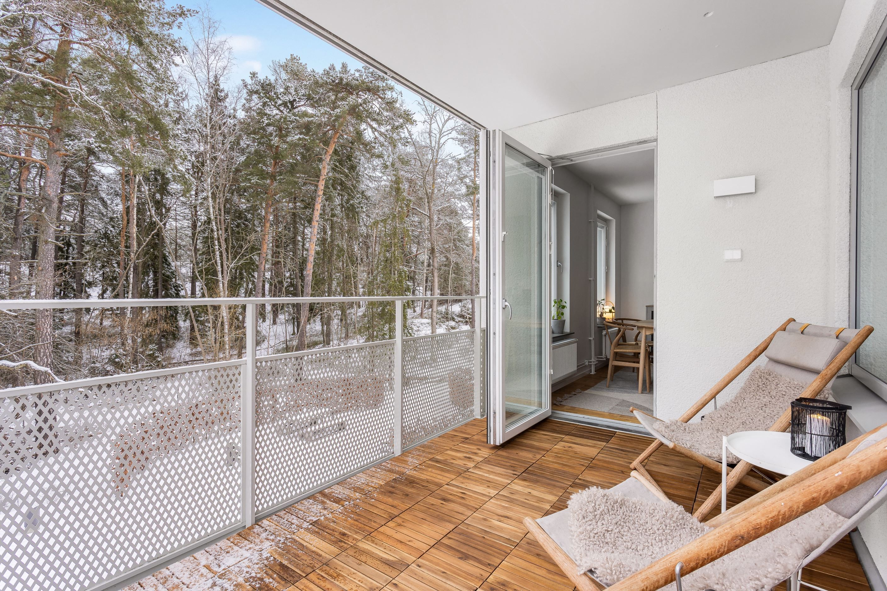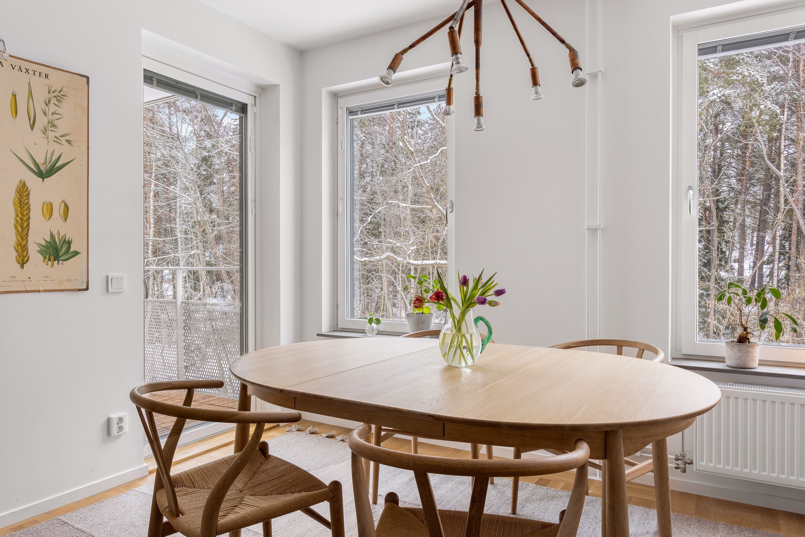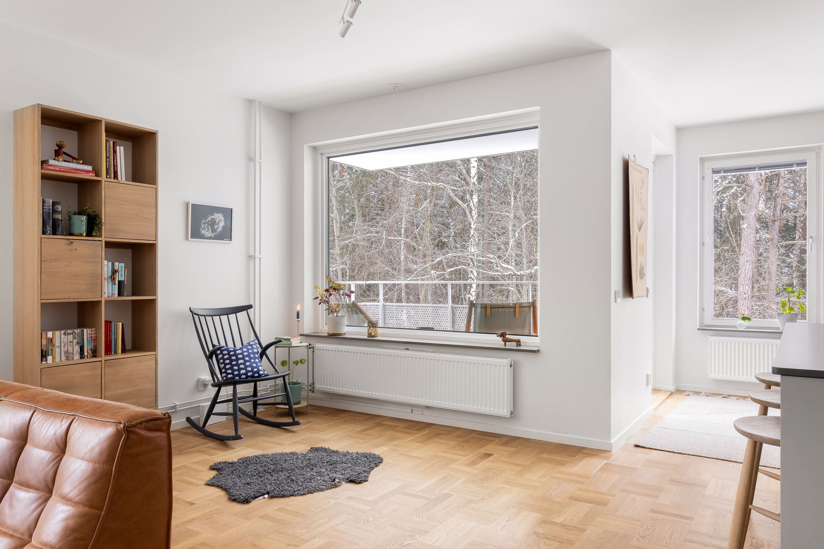 Lägenhetens interiör är ljus och inbjudande med stiliga materialval och ett härligt ljusinsläpp från fönster i tre väderstreck. Sällskapsrummet har fönster åt två håll och en glasad dörr som leder ut till den rymliga balkongen, som binder samman inomhus- och utomhuslivet under de varmare månaderna. Här kan man njuta av soliga stunder med en fin vy över omgivningens grönska.