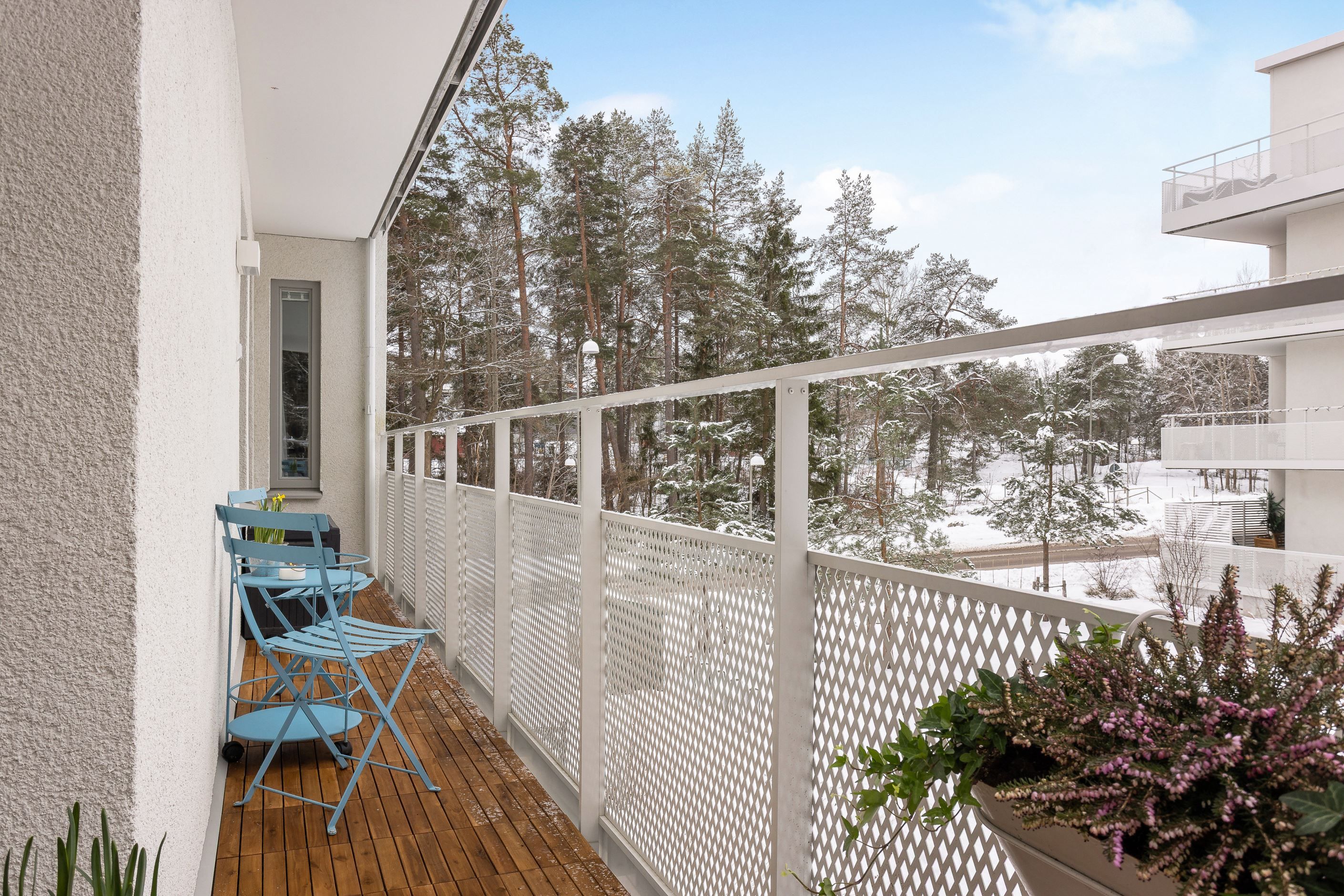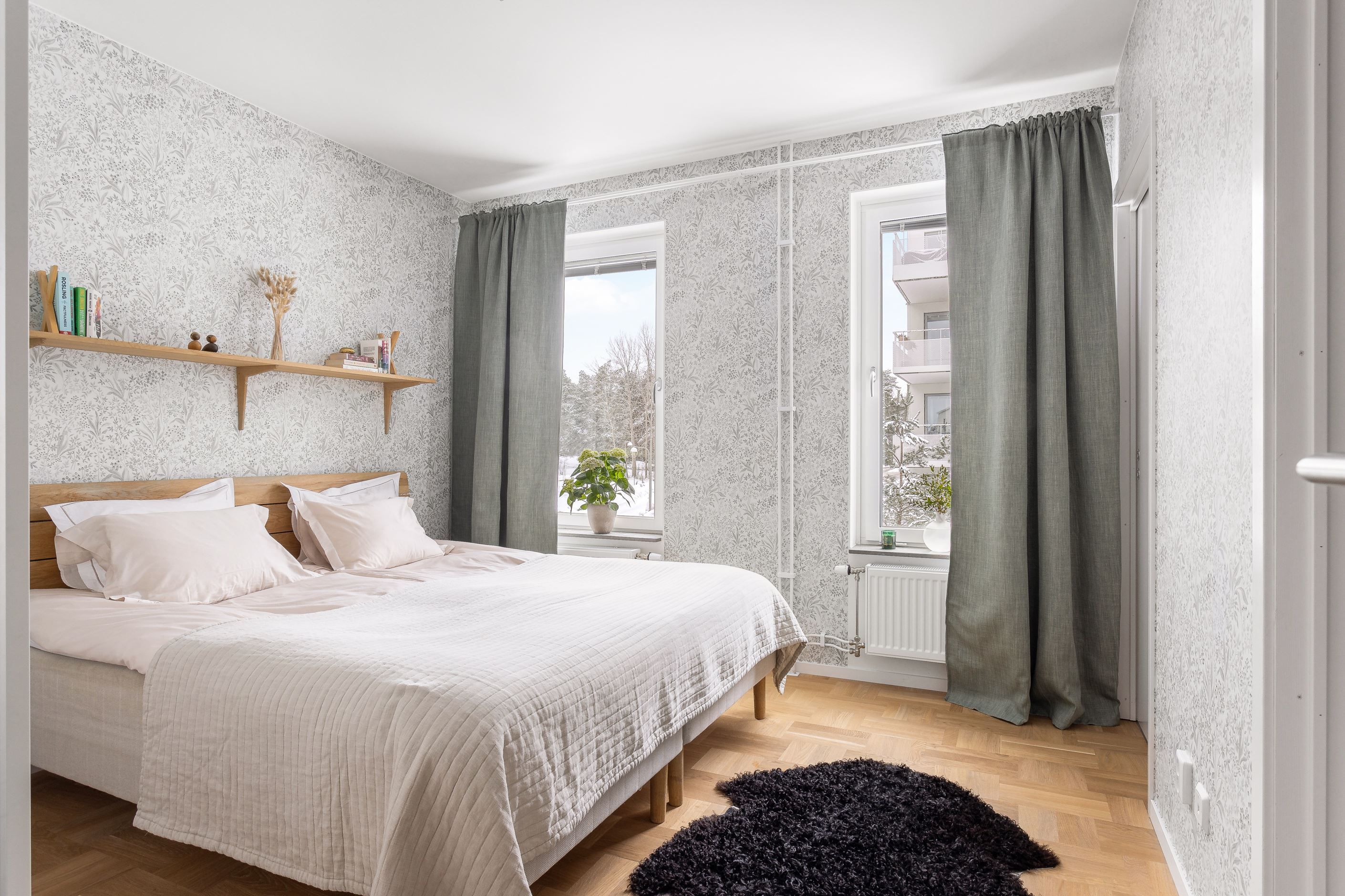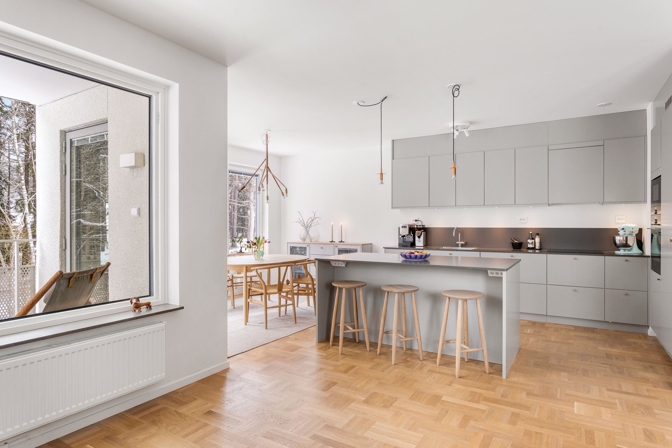 Lägenhetens interiör är ljus och inbjudande med stiliga materialval och ett härligt ljusinsläpp från fönster i tre väderstreck. Sällskapsrummet har fönster åt två håll och en glasad dörr som leder ut till den rymliga balkongen, som binder samman inomhus- och utomhuslivet under de varmare månaderna. Här kan man njuta av soliga stunder med en fin vy över omgivningens grönska.