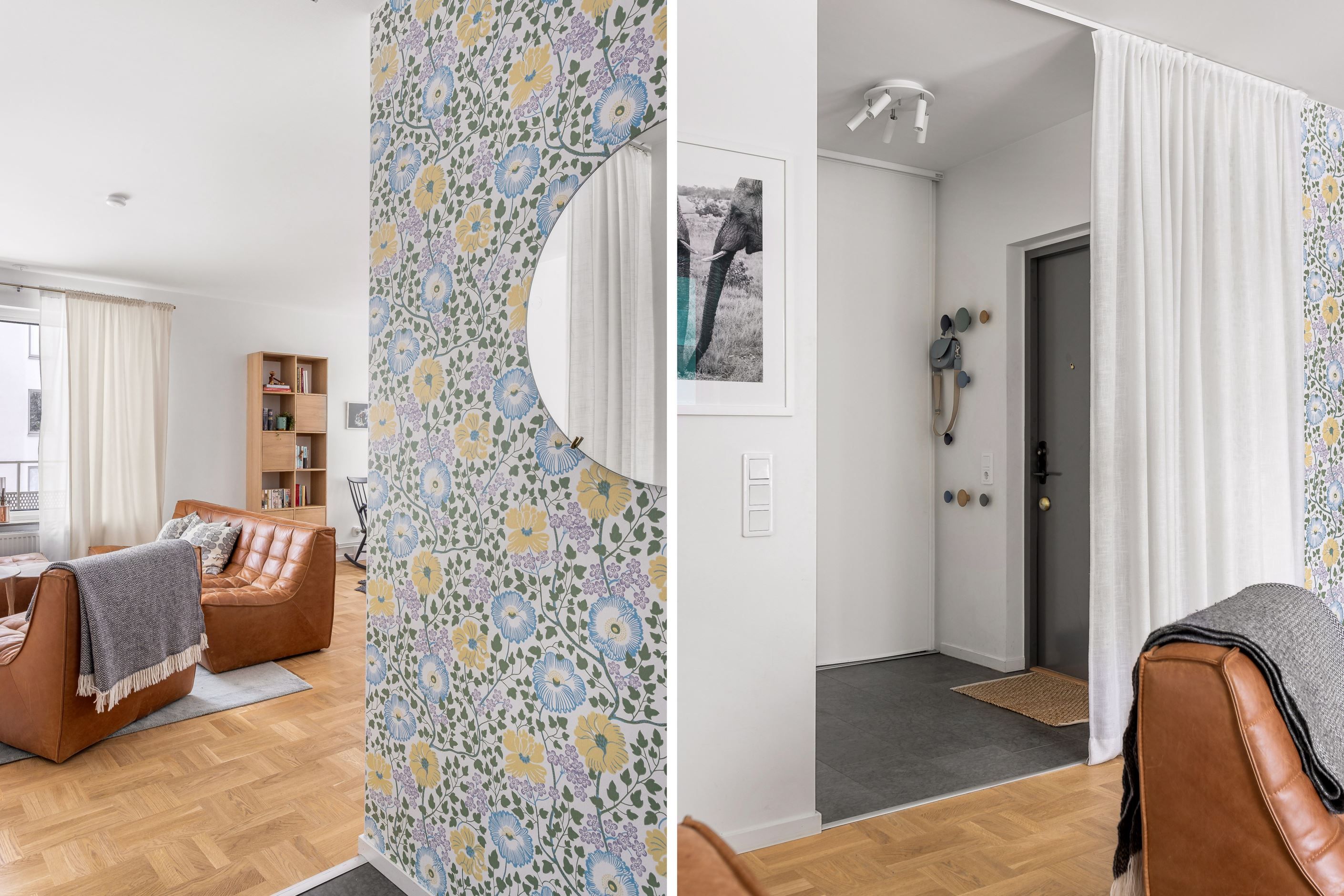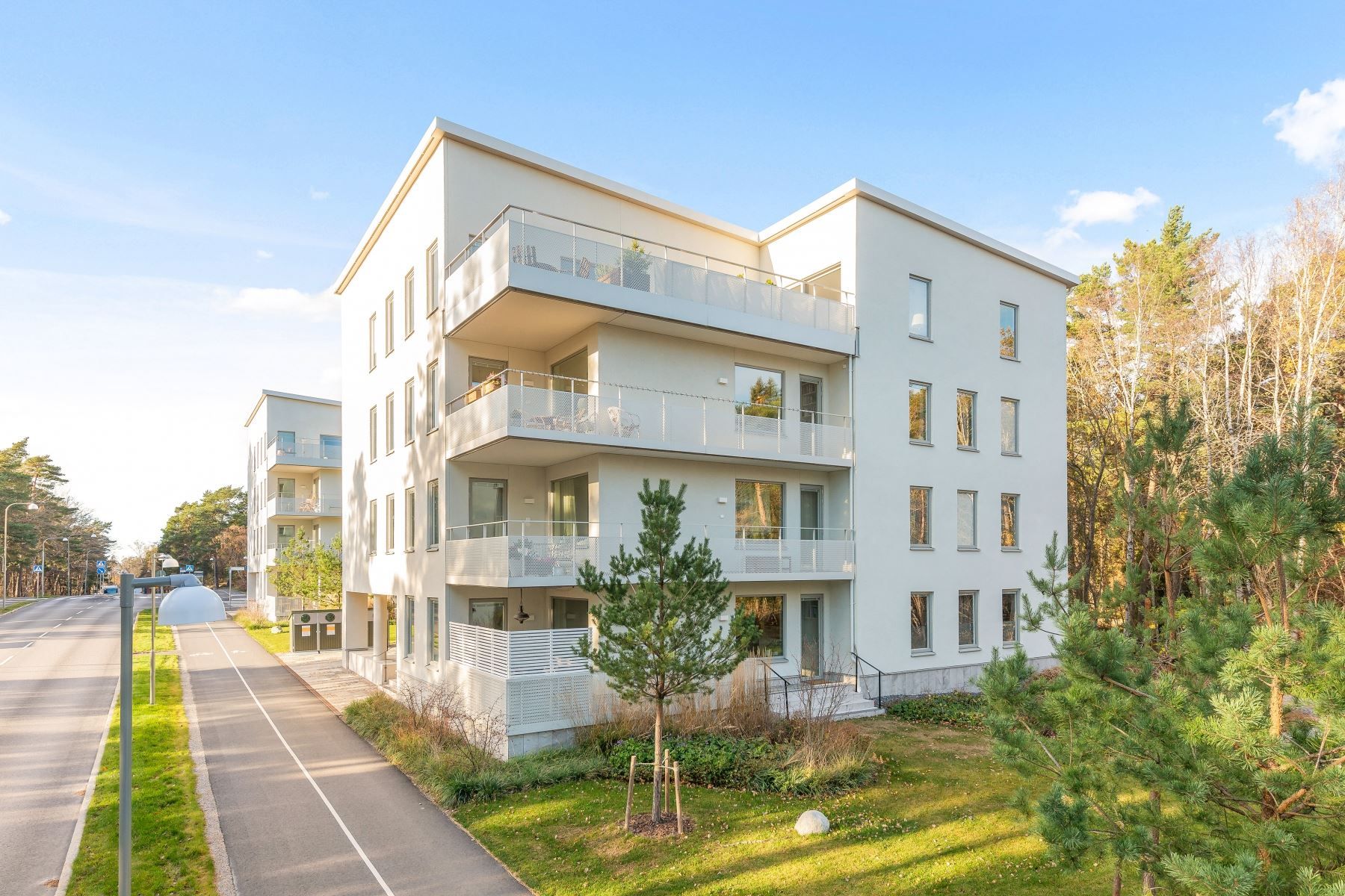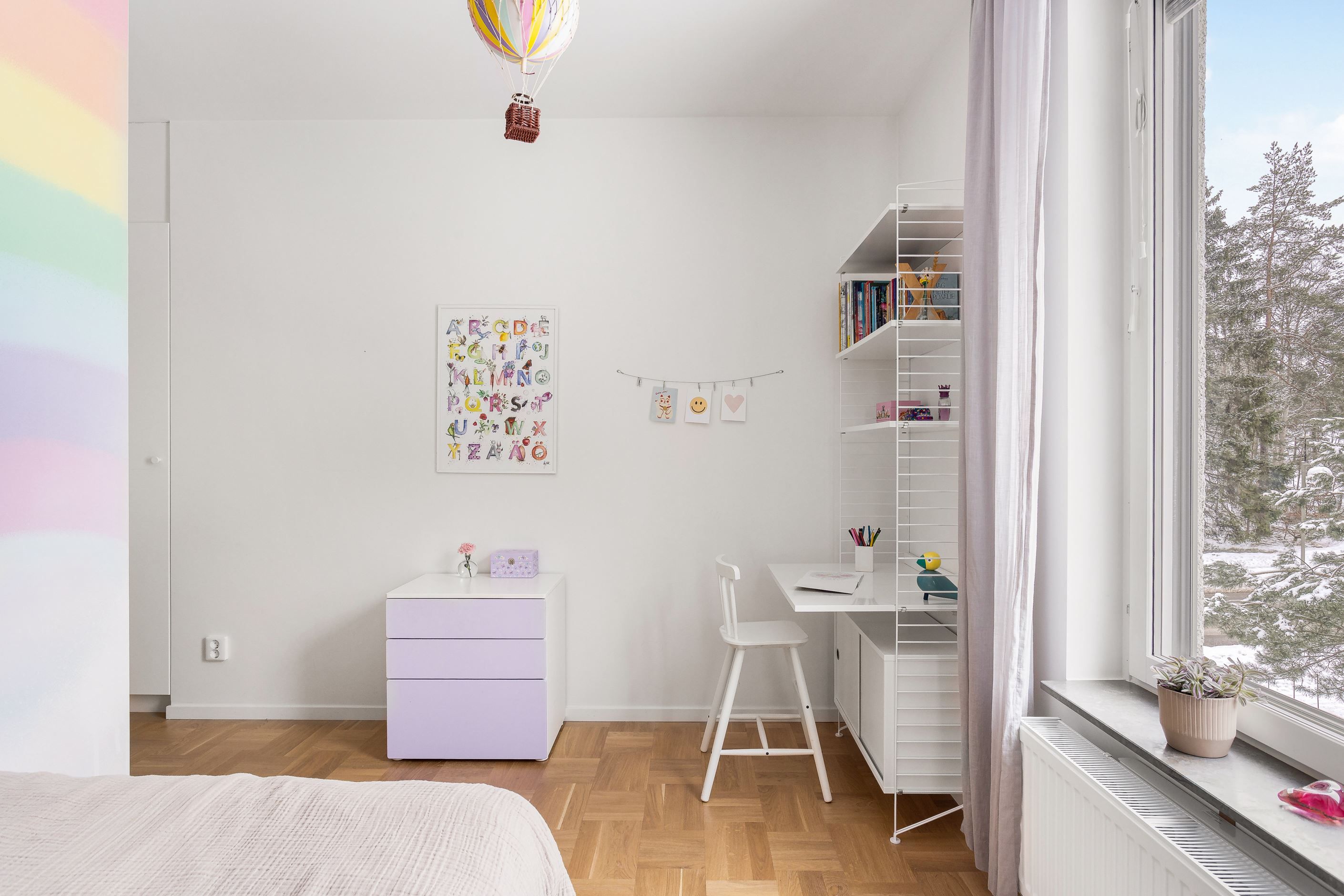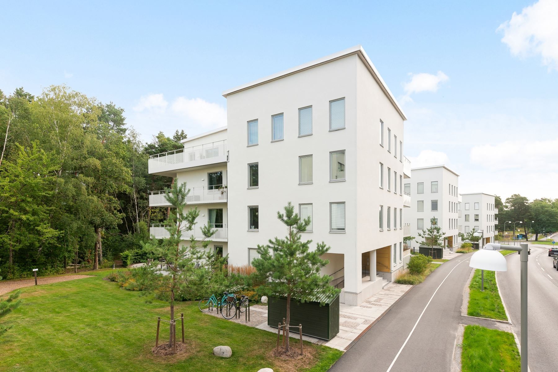 Lägenhetens interiör är ljus och inbjudande med stiliga materialval och ett härligt ljusinsläpp från fönster i tre väderstreck. Sällskapsrummet har fönster åt två håll och en glasad dörr som leder ut till den rymliga balkongen, som binder samman inomhus- och utomhuslivet under de varmare månaderna. Här kan man njuta av soliga stunder med en fin vy över omgivningens grönska.