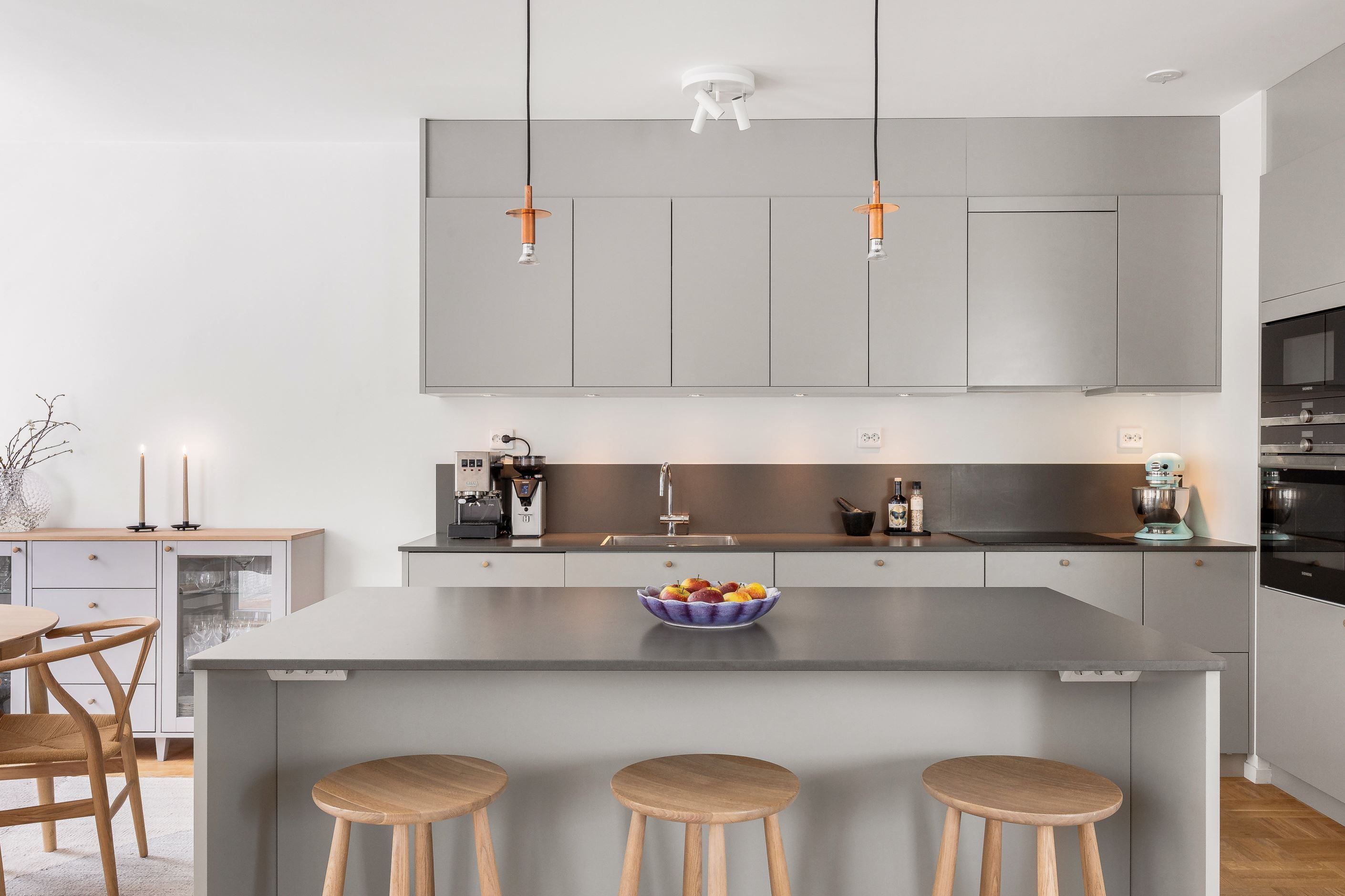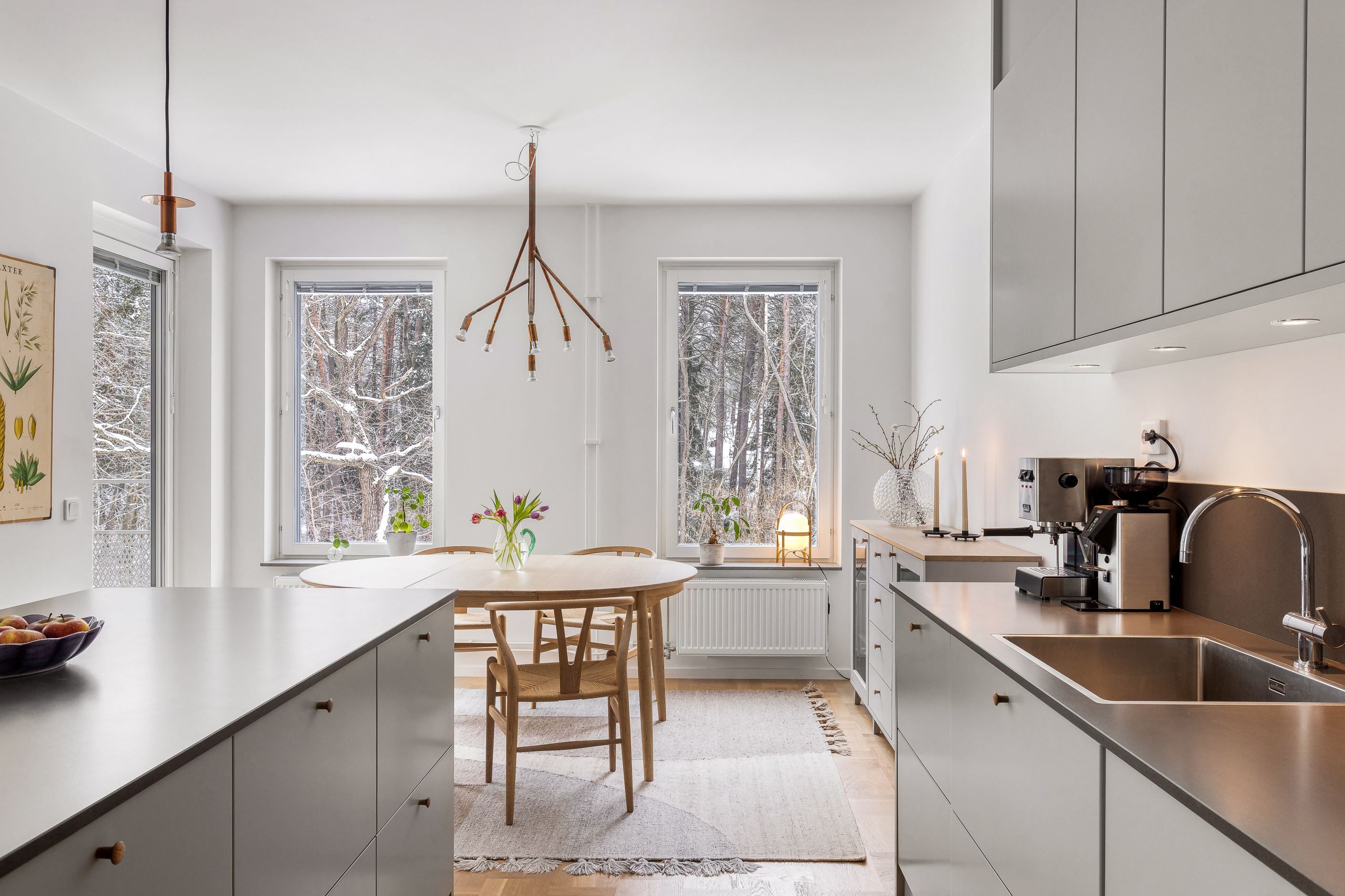 Köket ligger i öppen planlösning med sällskapsrummet, vilket skapar en naturlig kontakt mellan ytorna. Det påkostade köket från Ballingslöv har stilrena snickerier i en varmgrå ton och ett matchande stänkskydd i kompositsten. Det finns gott om förvaring och bra arbetsytor i det rymliga köket med en praktisk köksö. Vitvaror från Siemens i rostfritt stål och spotlights för fin belysning ger köket en elegant känsla. Den glasade dörren öppnar mot uteplatsen, vilket ger extra trivsel.