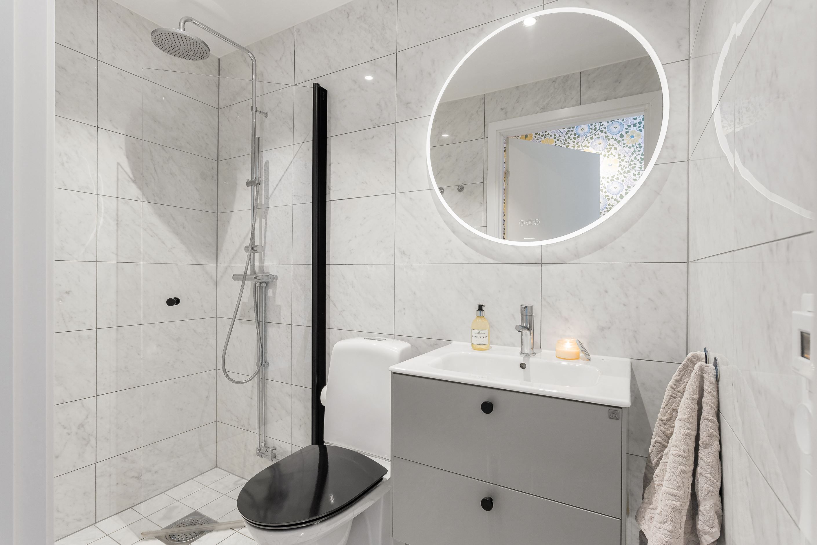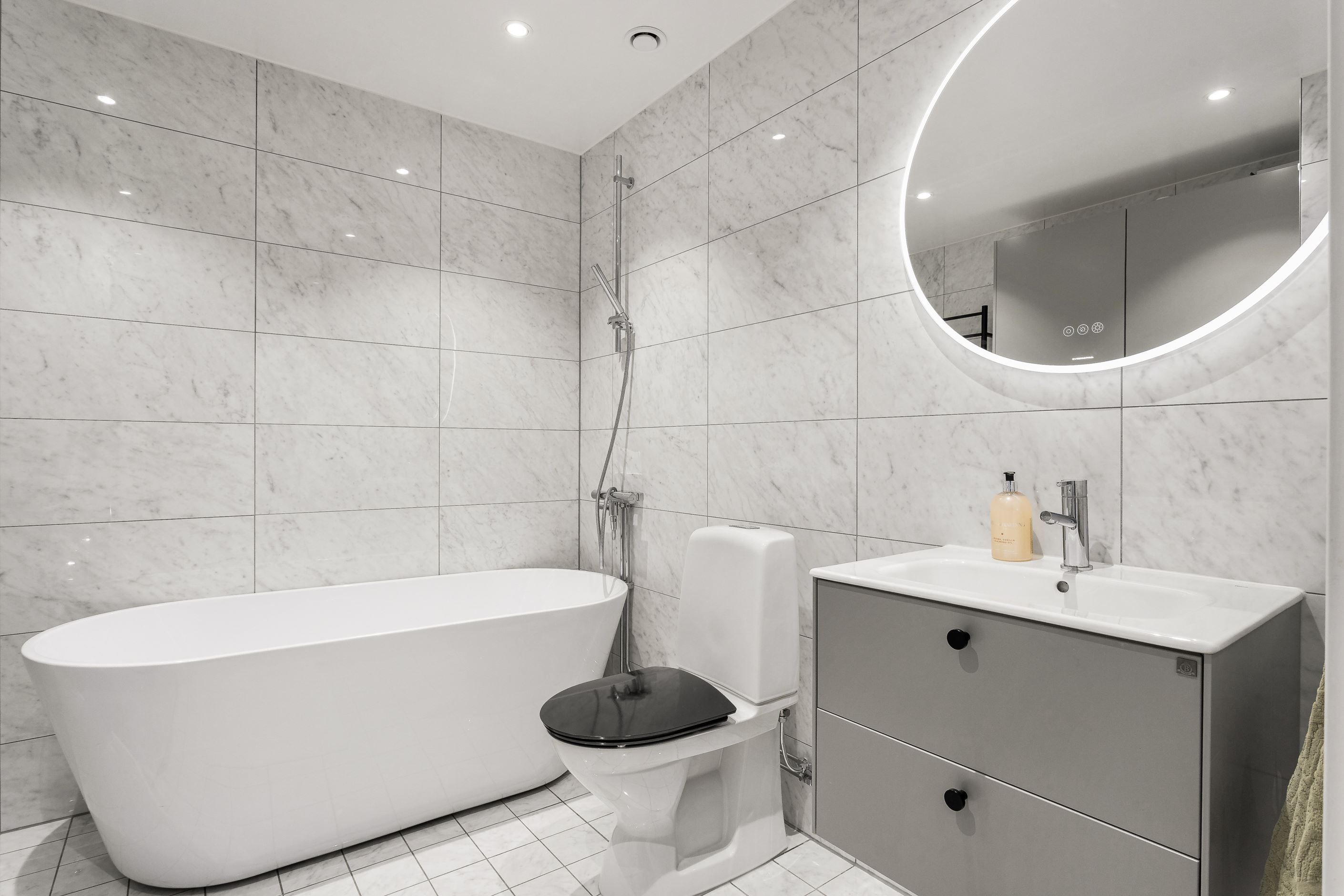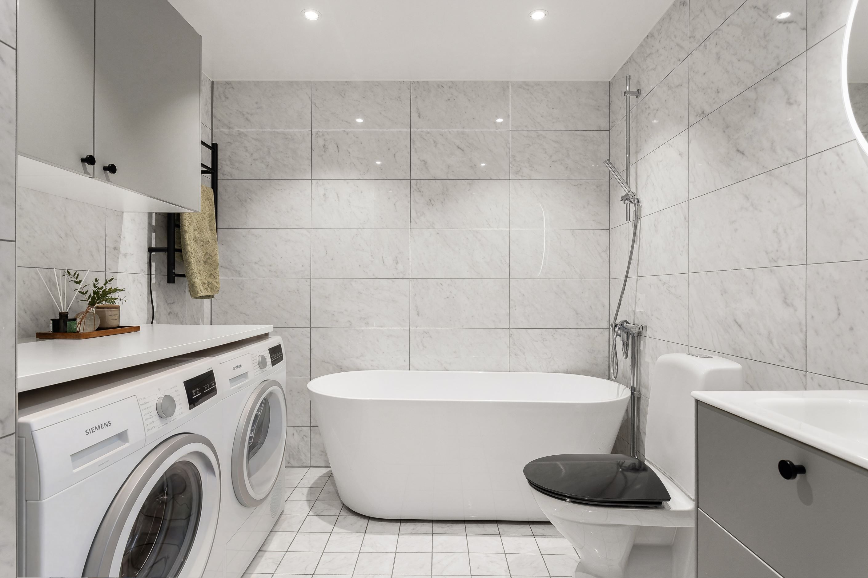Badrummet är utrustat med badkar, wc, handfat med kommod samt en arbetsbänk med en tvätt- och torkmaskin. Här finns komfortvärme i golvet, och både golv och väggar är klädda i ljus, marmorliknande klinker/kakel.