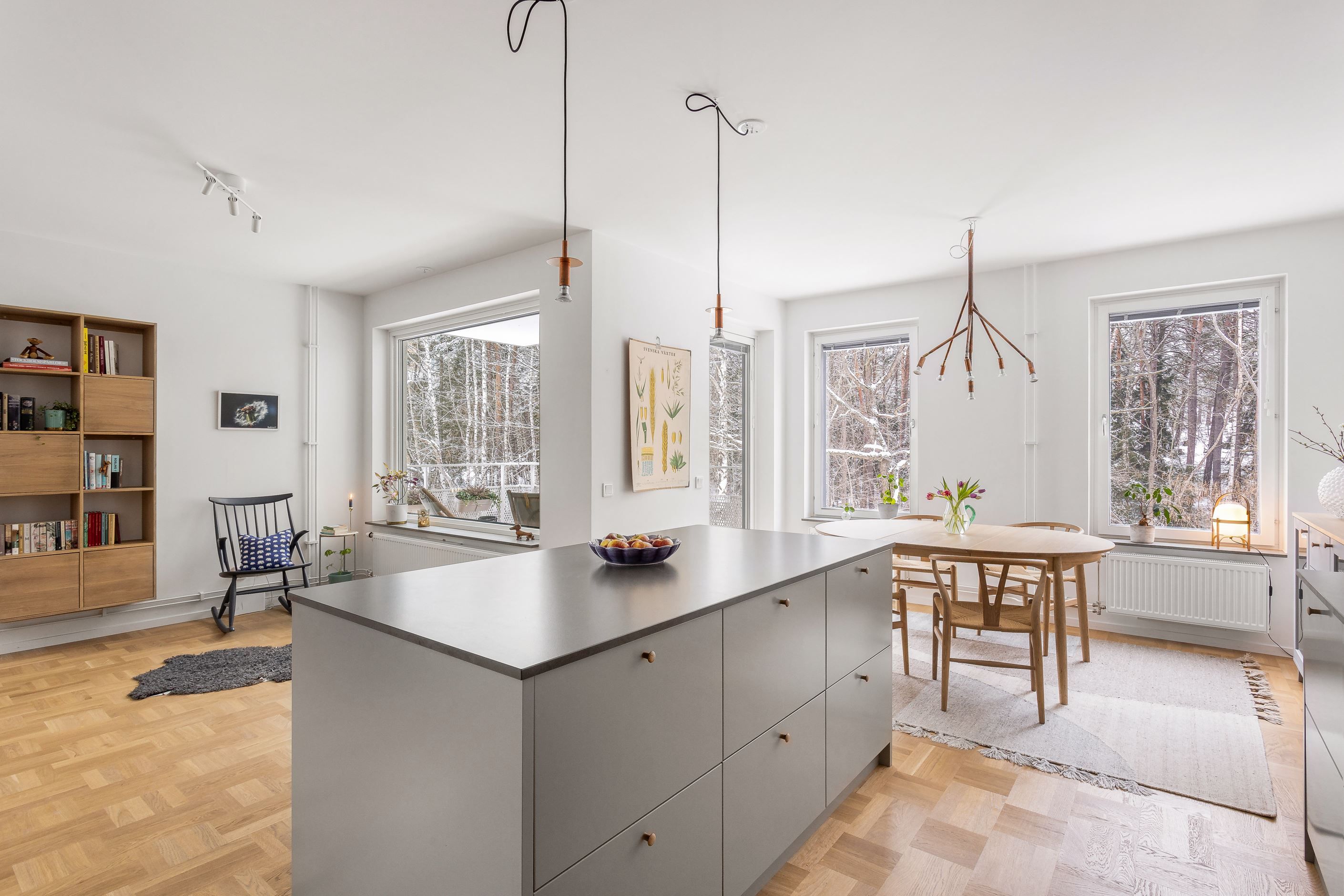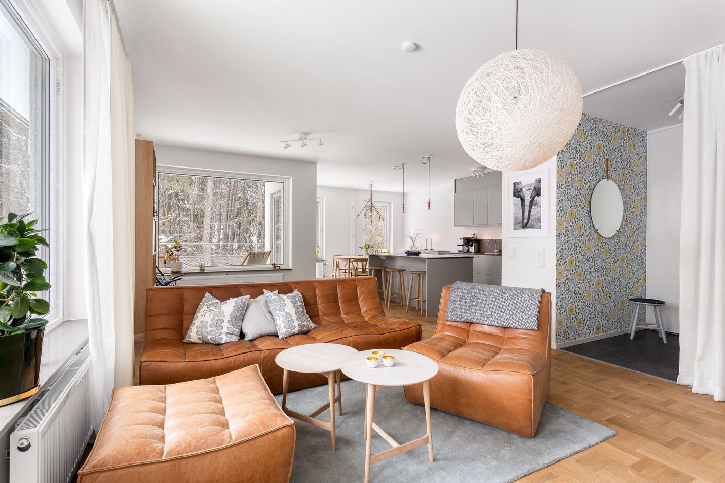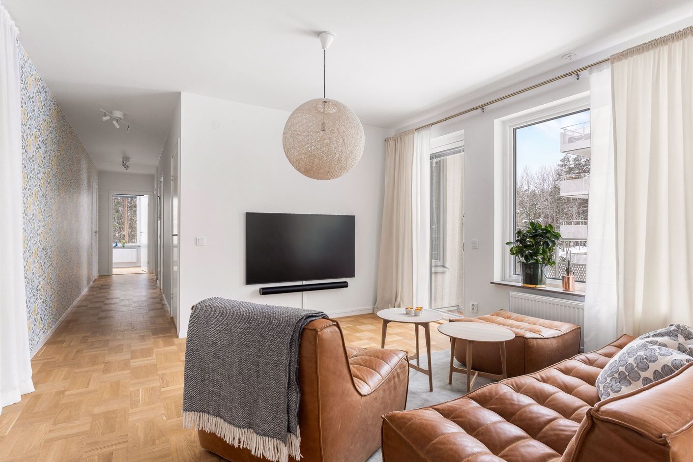 Välkommen till denna rymliga och genomtänkta 4:a i toppskick med hög standard och generös takhöjd om 2,6 meter som skapar en härlig rymd tillsammans med stora fönsterpartier och fint ljusinsläpp. Den stora balkongen med trall blir en naturlig förlängning av vardagsrummet och bjuder på sol från tidig eftermiddag till kväll, med rogivande utsikt mot skog som skapar känslan av en levande tavla året om. Bostaden erbjuder tre lättmöblerade sovrum, två badrum, gott om förvaring med stort förråd samt bekvämligheter som garage i huset och stor hiss. Här bor du i ett hem som kombinerar komfort, kvalitet och ett naturnära läge, perfekt för dig som vill ha både lugn och bekvämlighet utan att kompromissa.