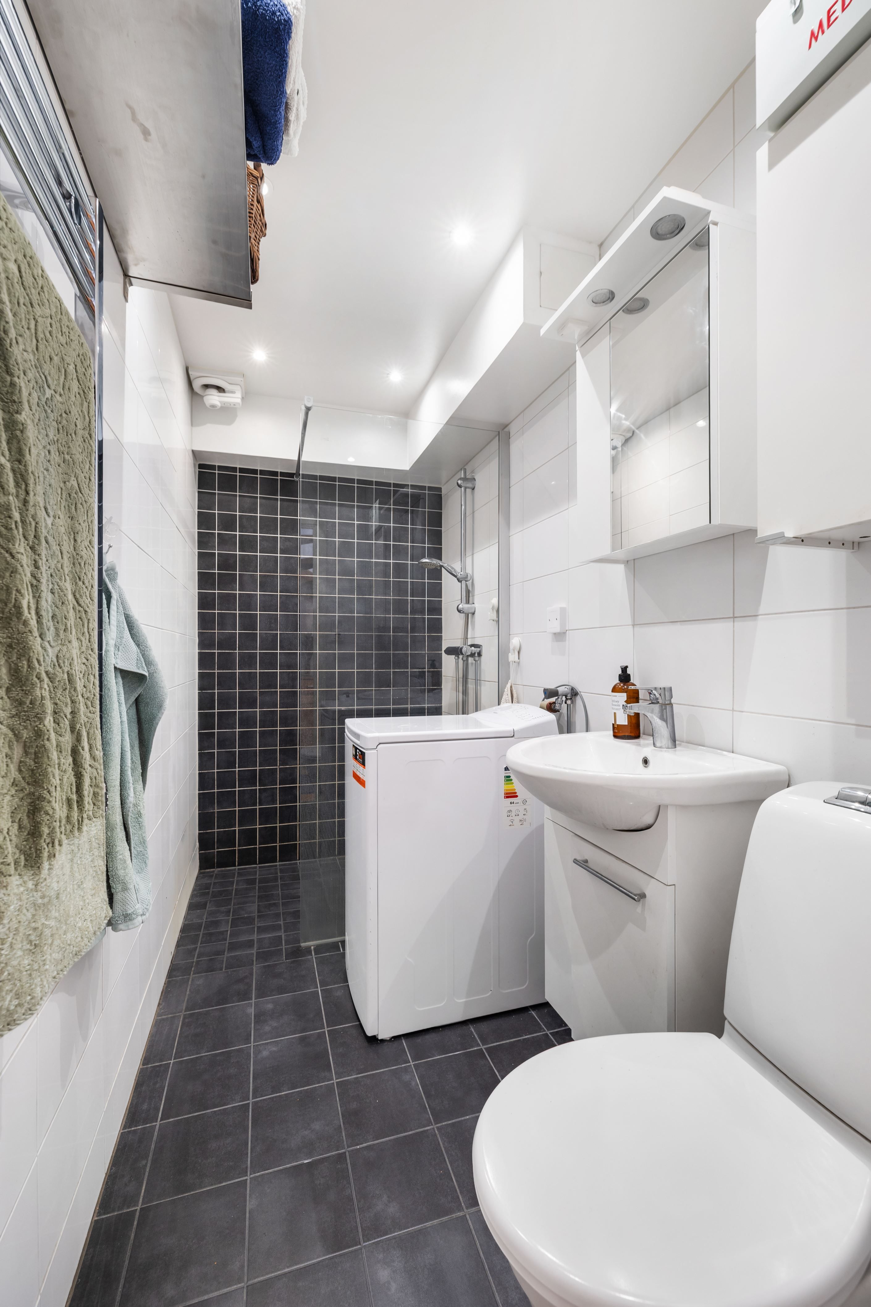 Badrummet, även det helrenoverat under stambytet, är elegant helkaklat och utrustat med duschhörna, wc, handfat och tvättmaskin. En genomtänkt och praktisk lösning som förenklar vardagen.