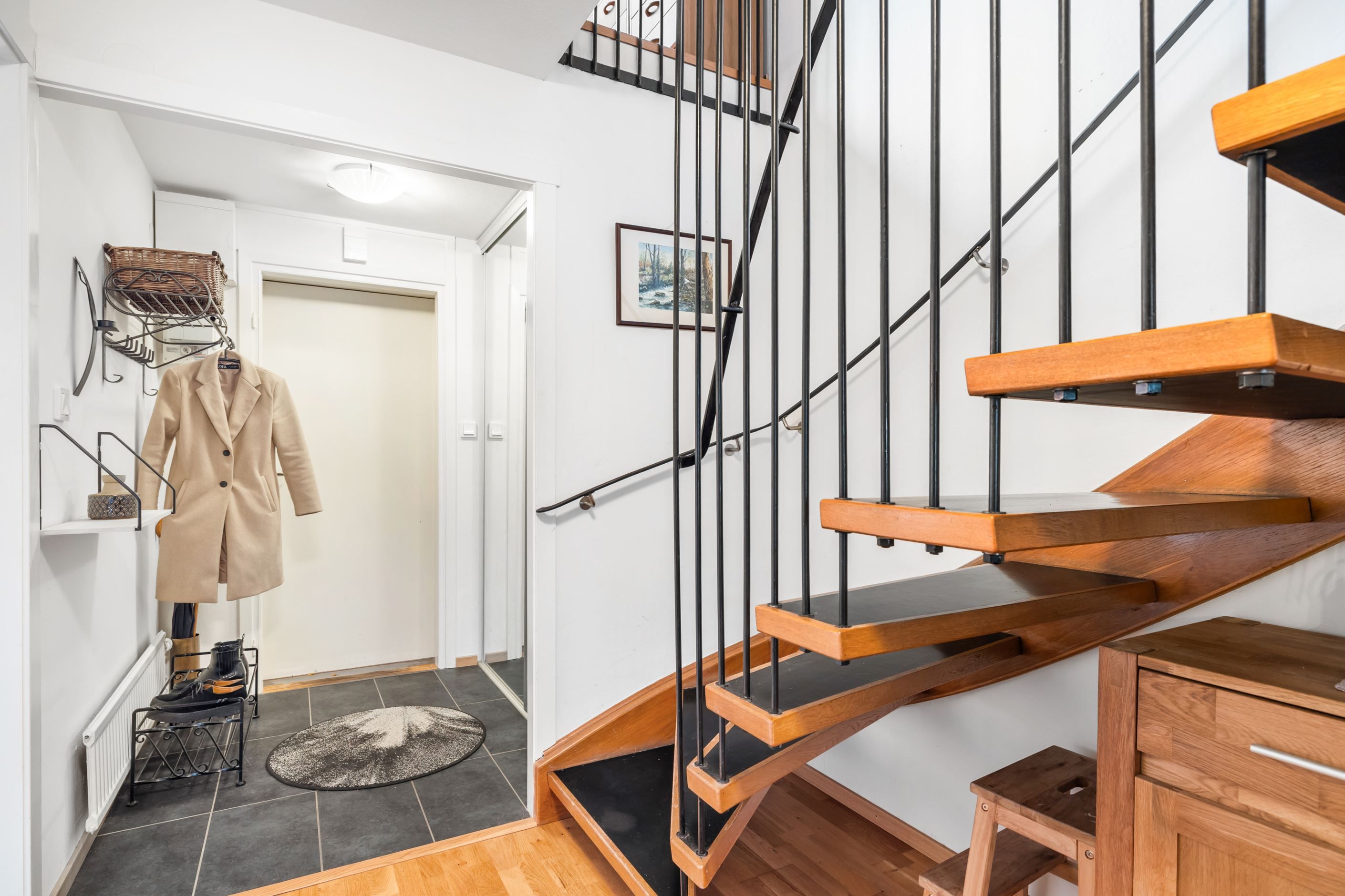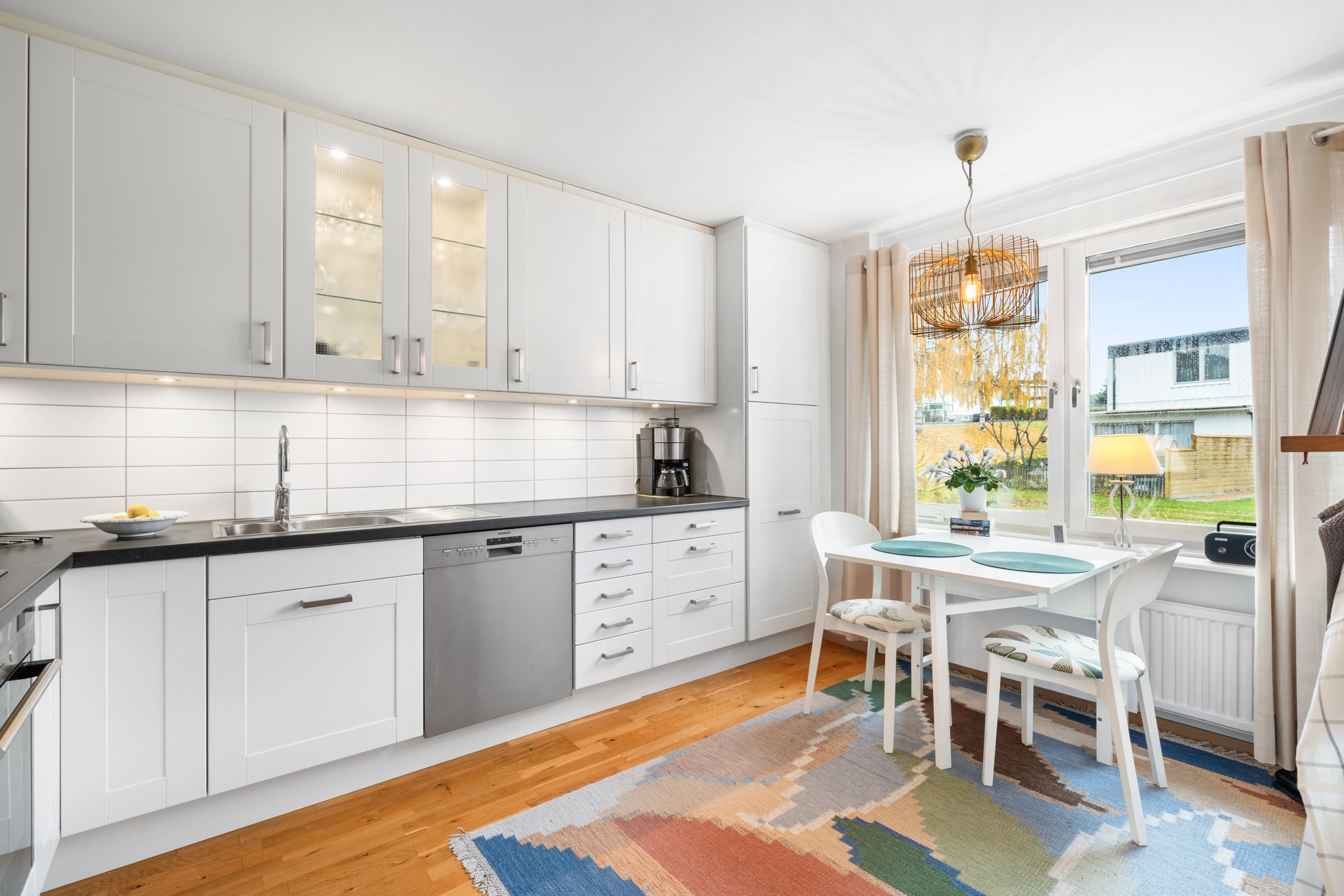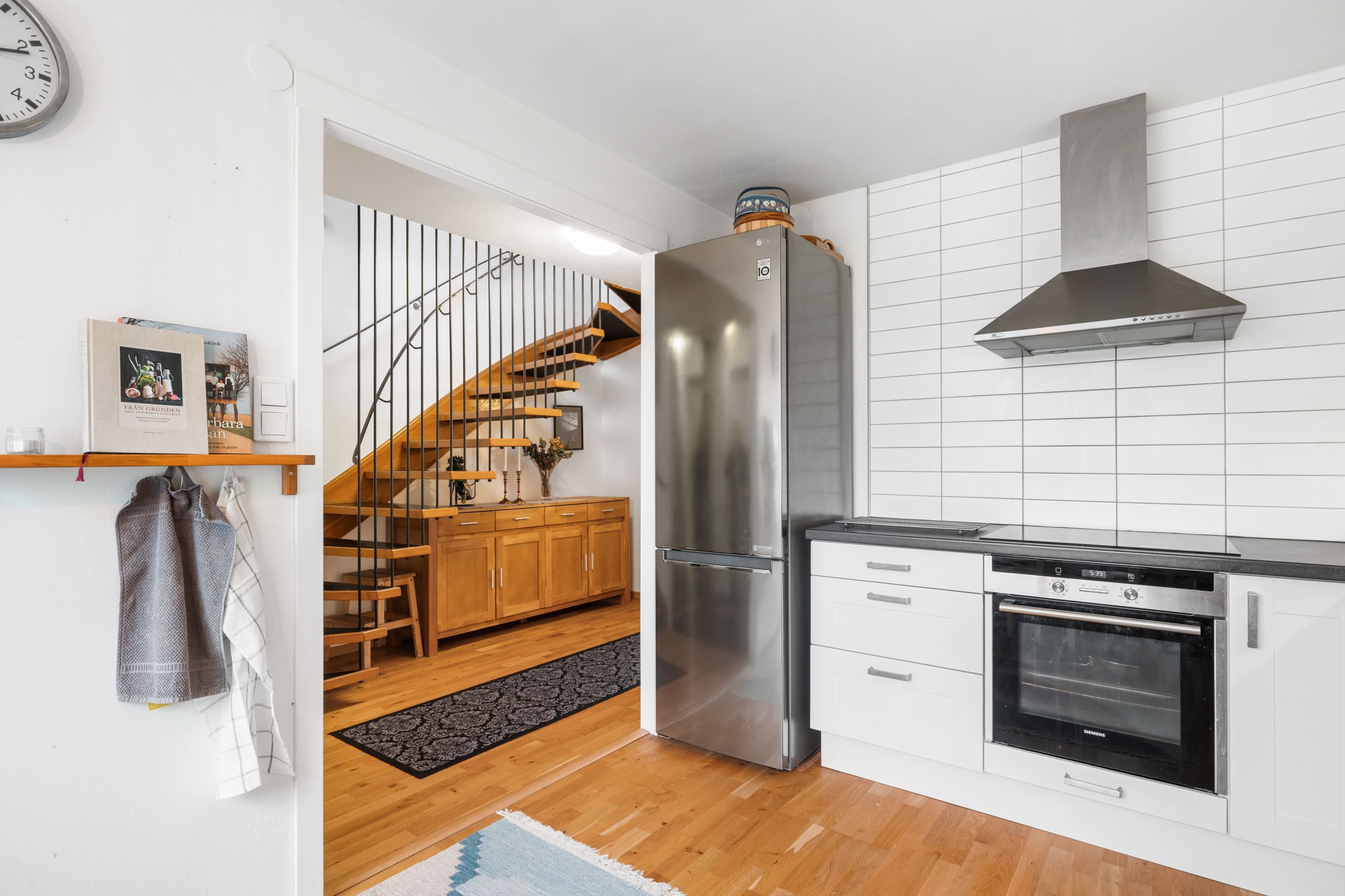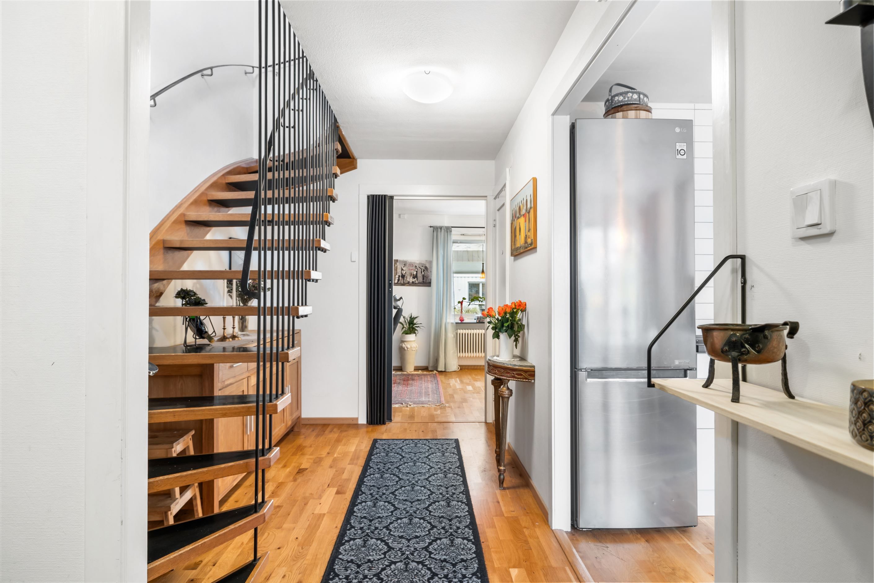 Redan i hallen möts du av praktiskt klinkergolv och goda förvaringsmöjligheter. Direkt till höger ligger det smakfulla köket, renoverat i samband med föreningens stambyte 2013–2015. Här samsas stilrena materialval med smarta funktioner – en perfekt plats för såväl vardagsmatlagning som sociala stunder.