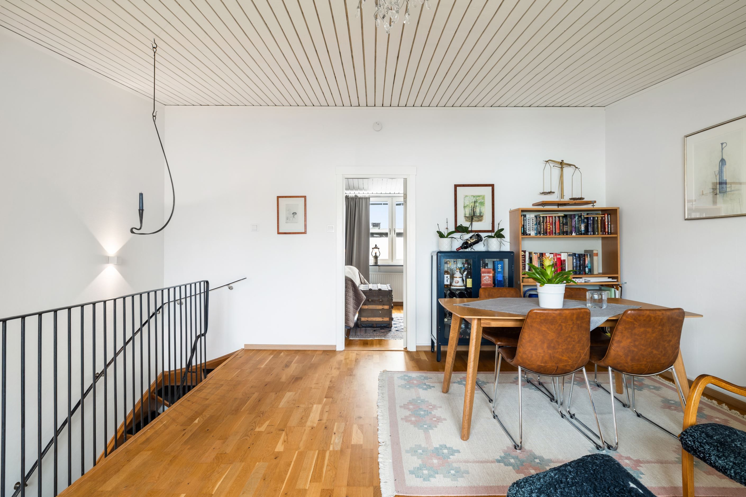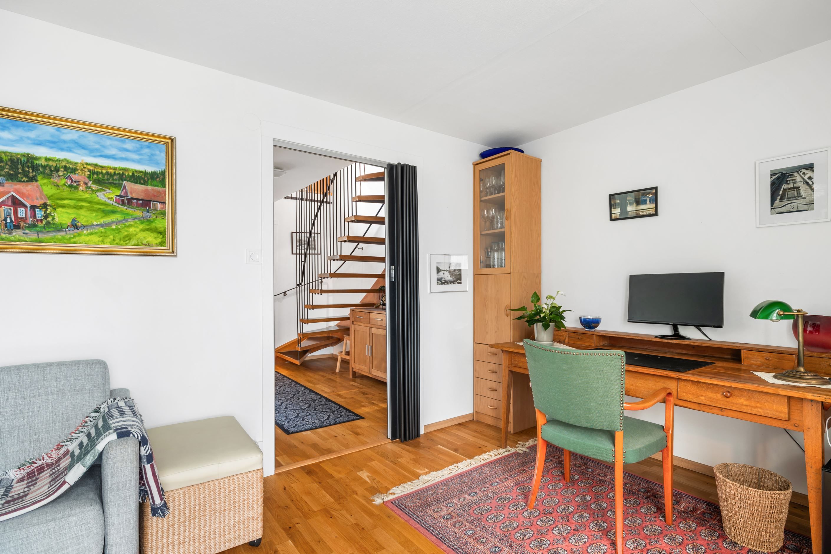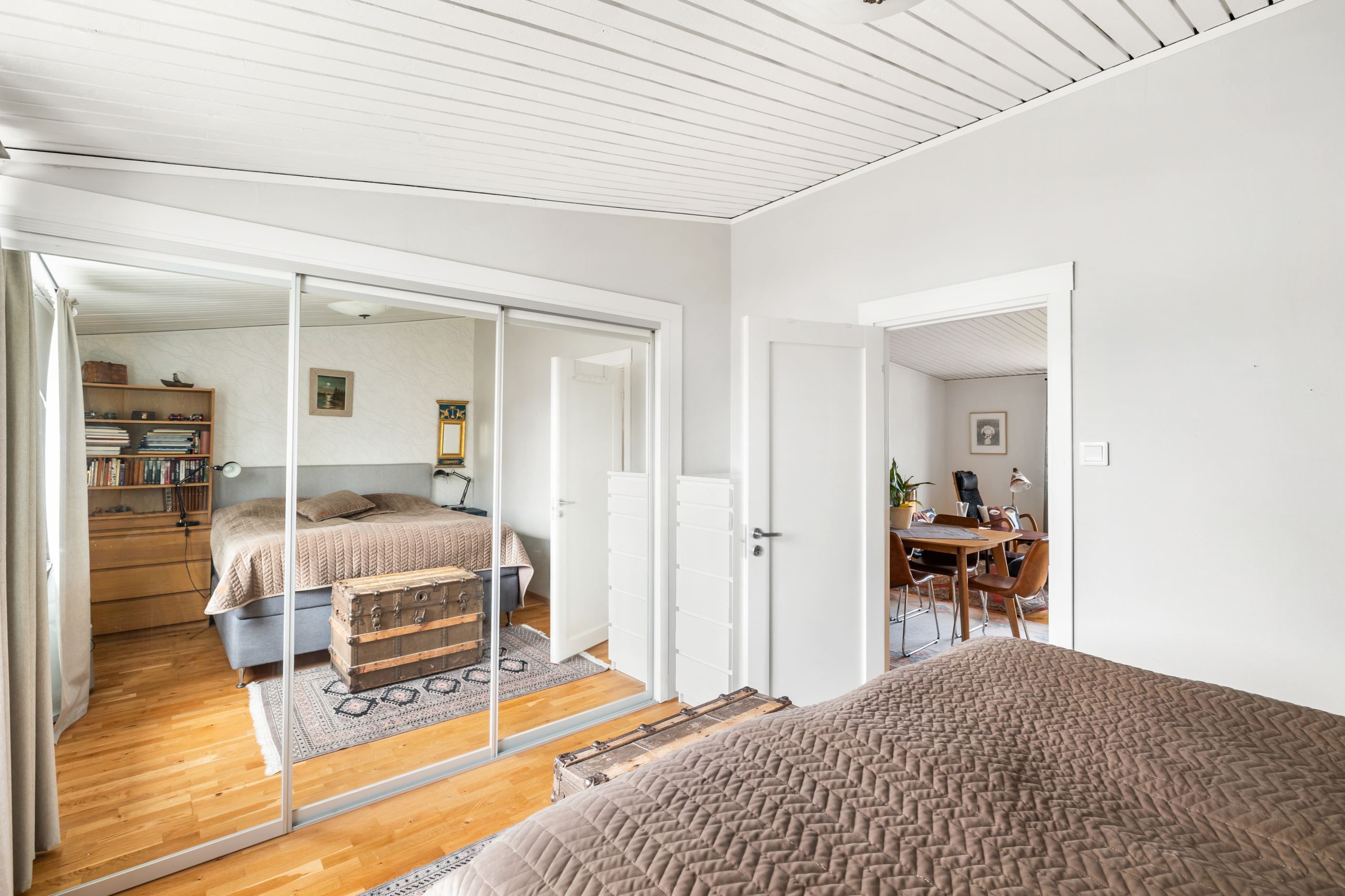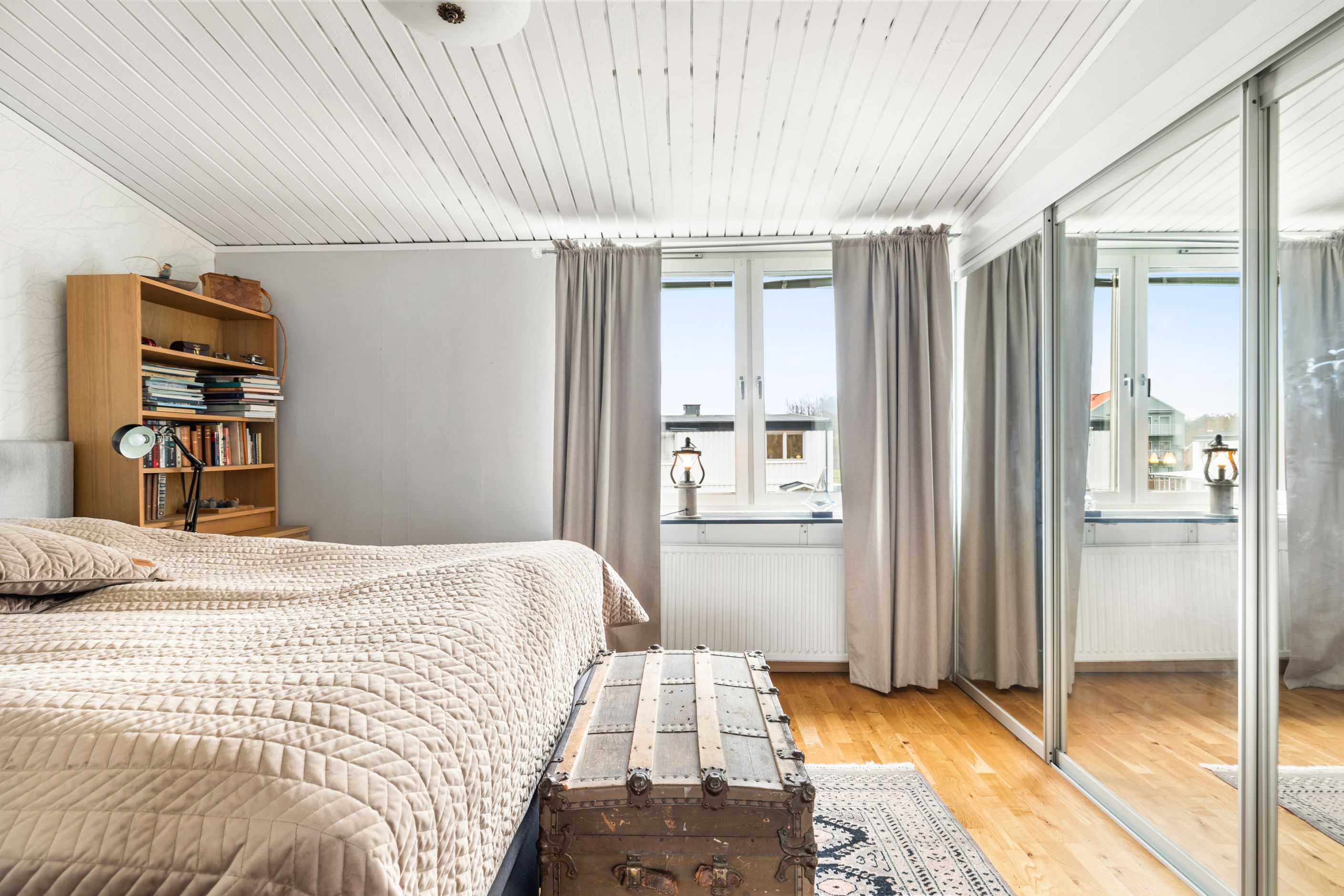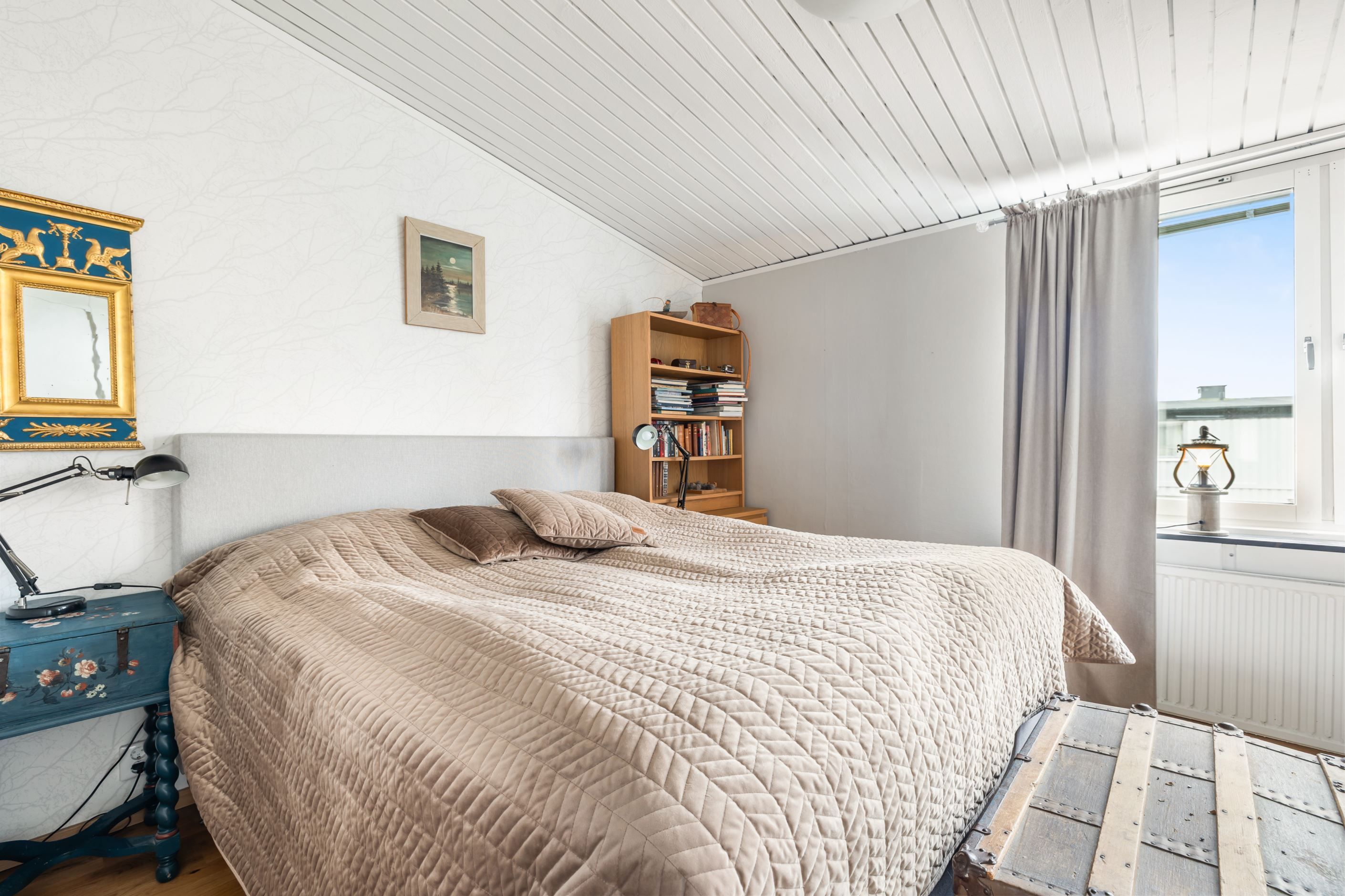 På övre plan öppnar ett ljust och luftigt våningsplan upp sig. Här finns ett generöst vardagsrum med gott om plats för både soffgrupp och umgänge, samt ett rofyllt sovrum med stor skjutdörrsgarderob med spegeldörrar som förstärker känslan av rymd.