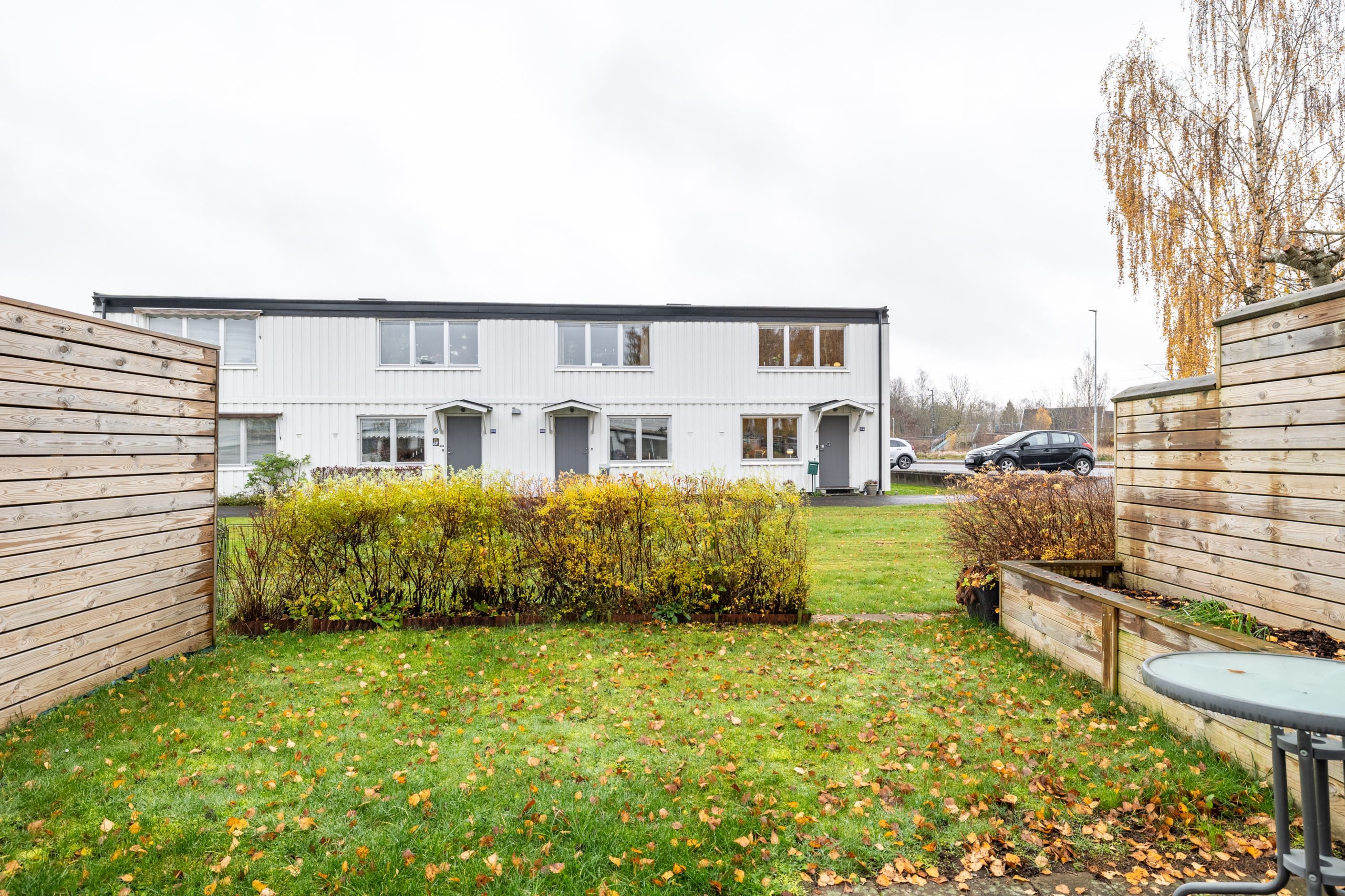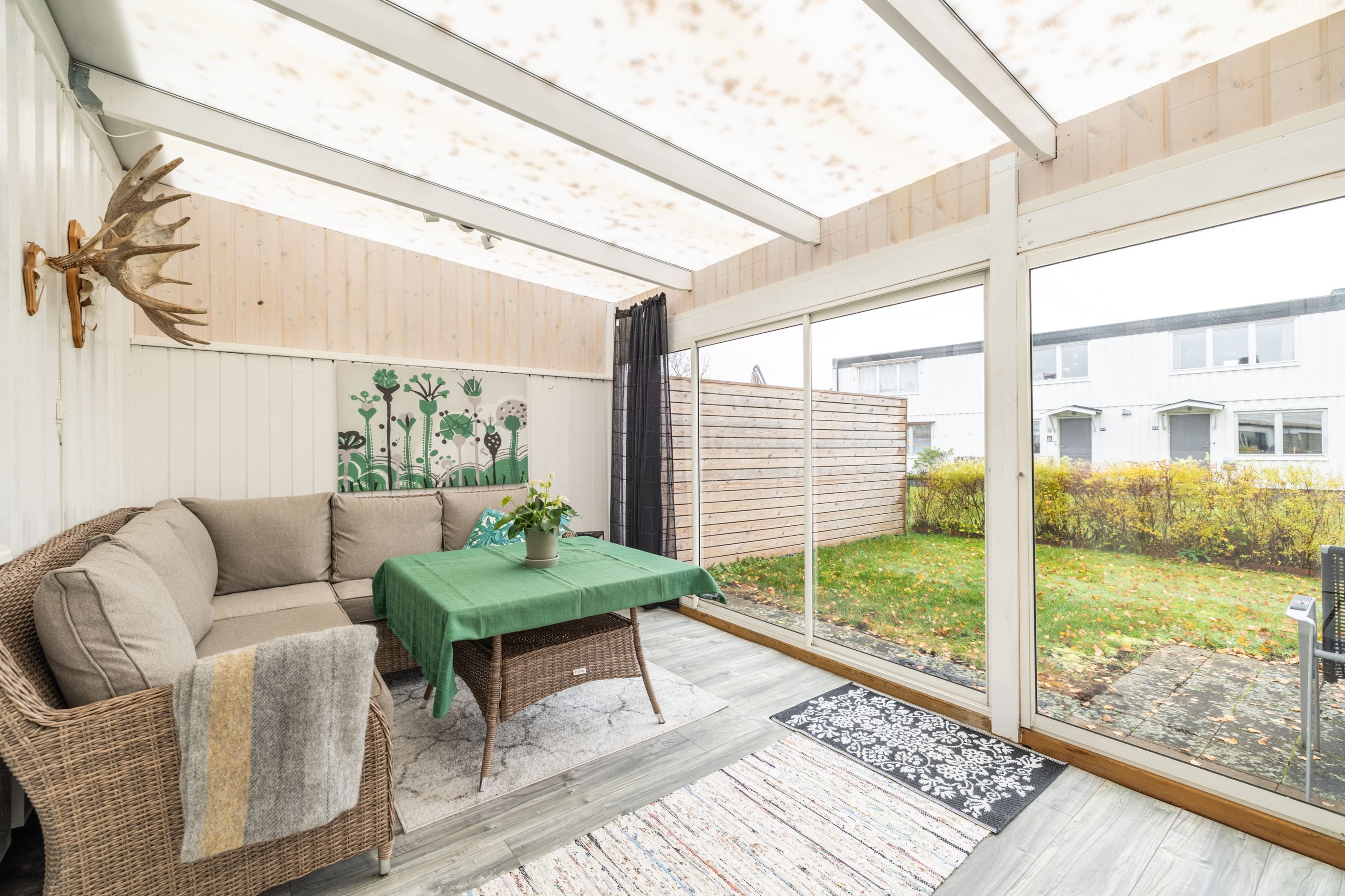 Från allrummet på entréplanet tar du dig vidare till den inglasade altanen – ett fantastiskt extrarum som kan nyttjas året om. Utanför väntar en liten grästäppa, idealisk för odling, barnlek eller en lugn stund i solen. Här har du sol från morgon till kväll, vilket gör uteplatsen till en naturlig plats att samlas på under årets varmare dagar.